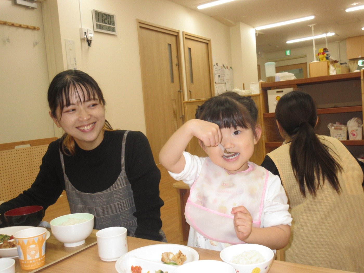 「みて!上手にお口にはこべるよ!」「おいしいよ~」なんて声が聞こえそうなくらい子ども達はいつも通り、パクパクもりもり完食!