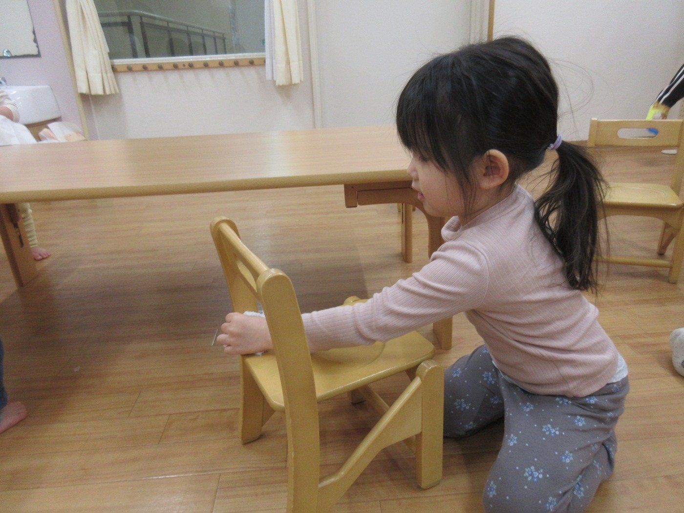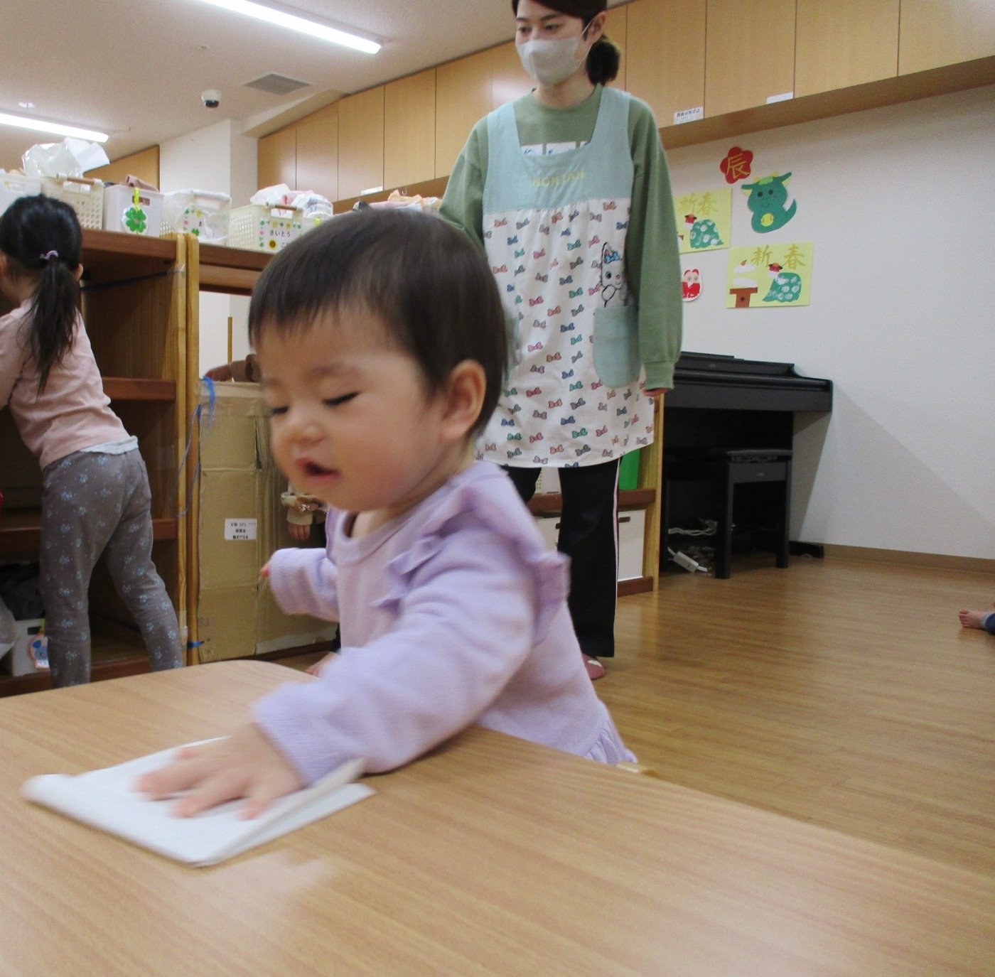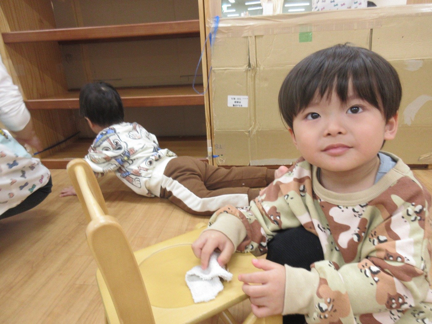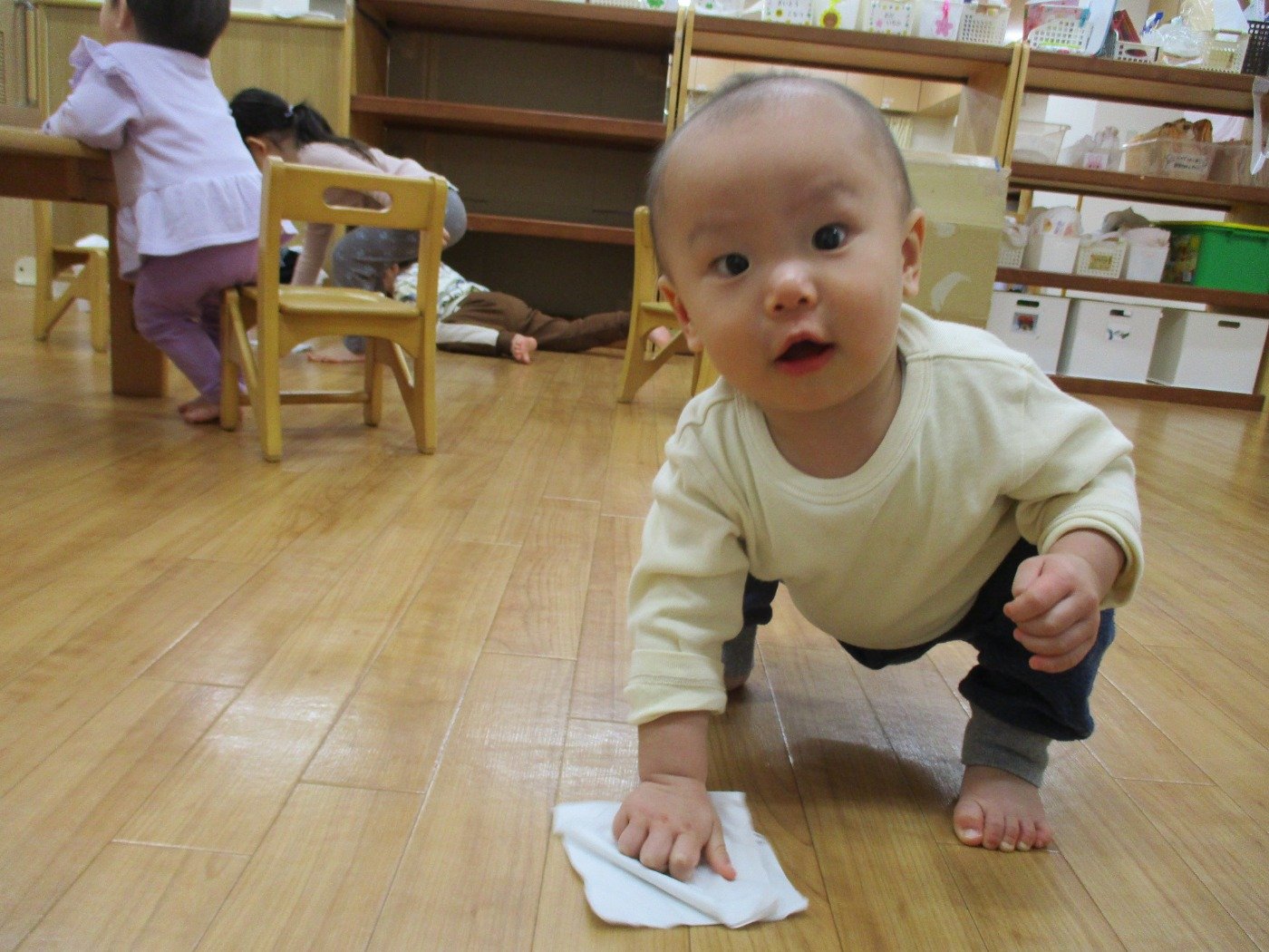大きい組さんが椅子を拭いていると、真似っこ上手な0歳児のお友だちも、見よう見まねでふきふきしている素敵な姿が見られ、
