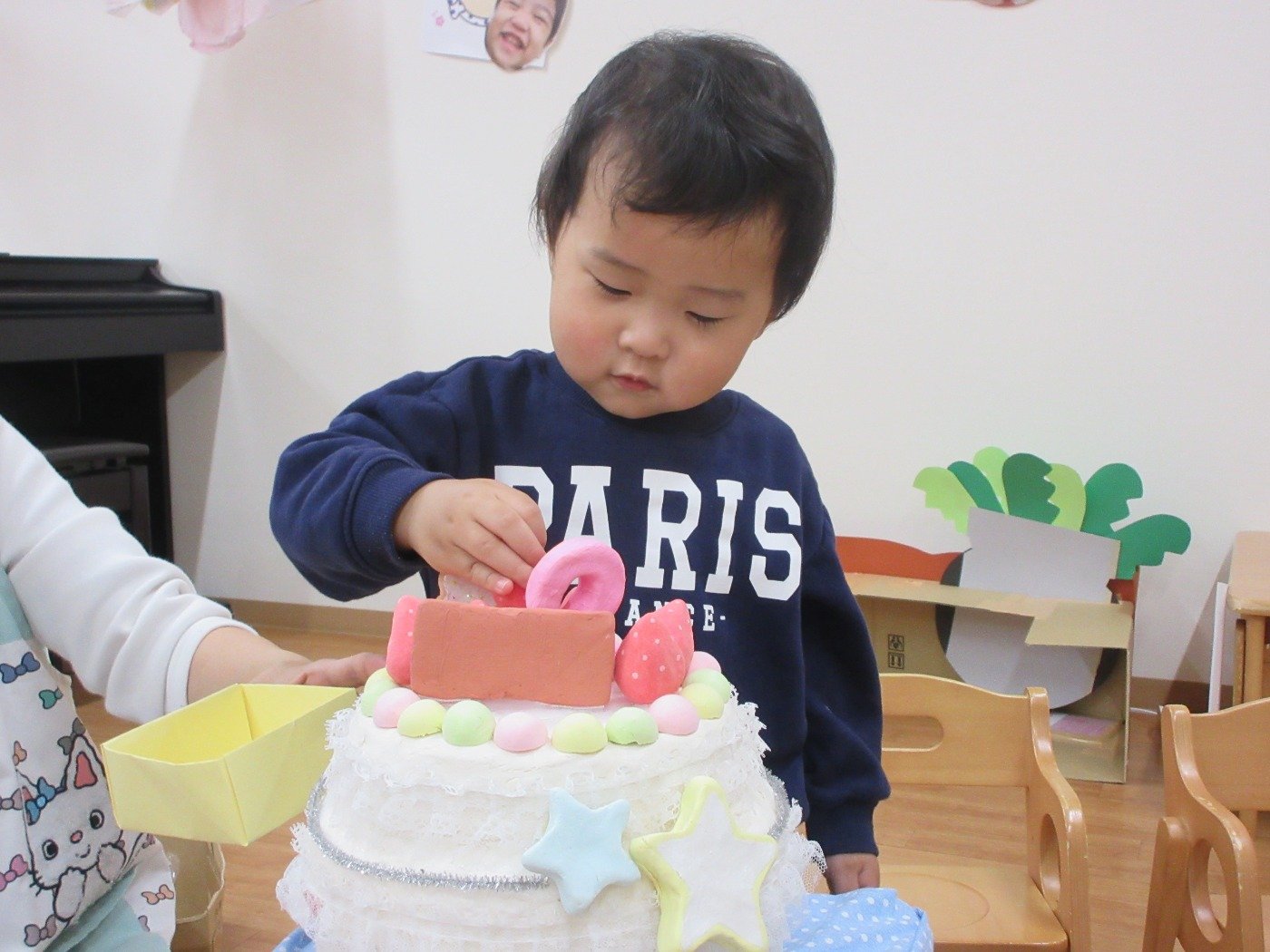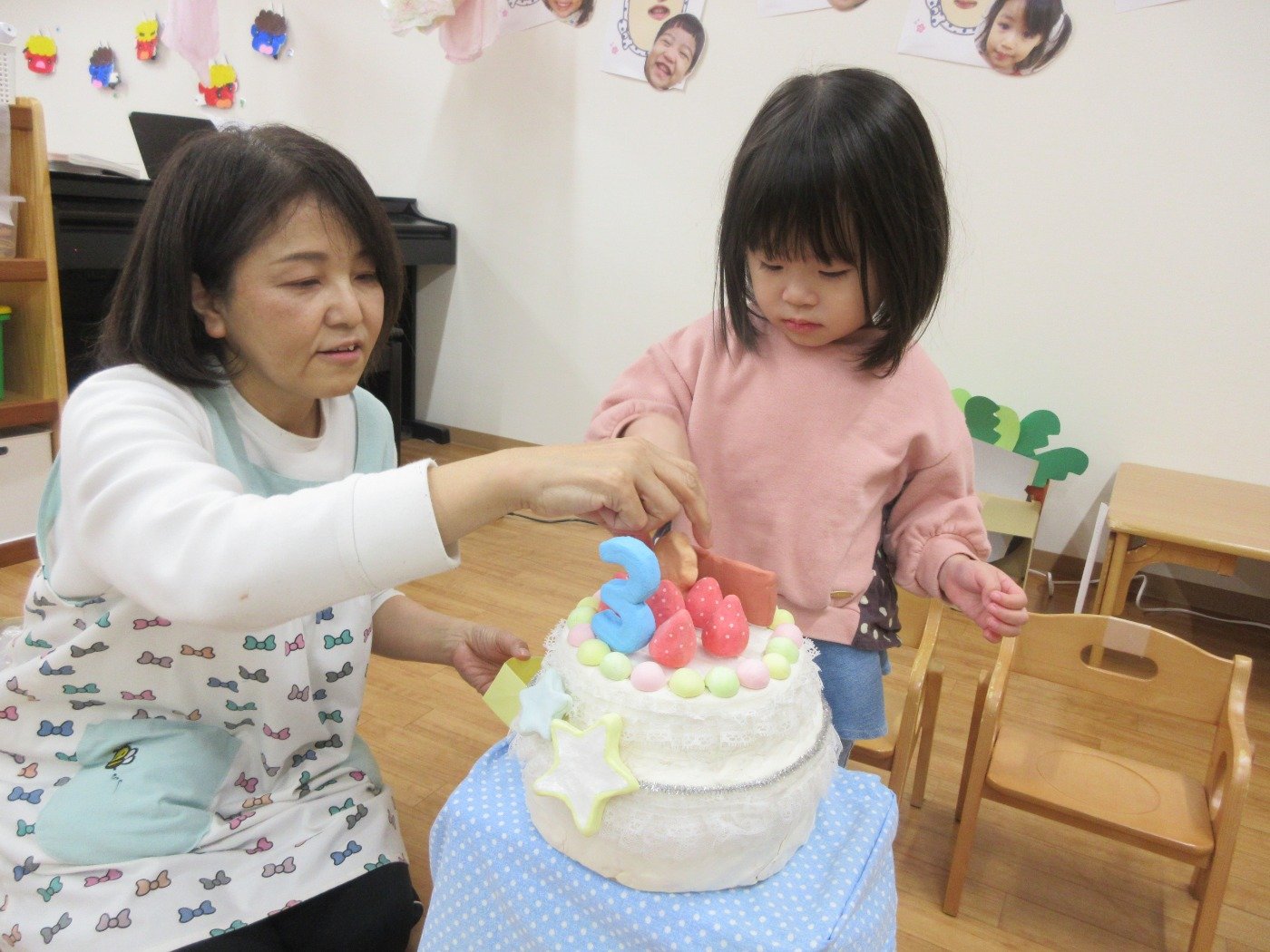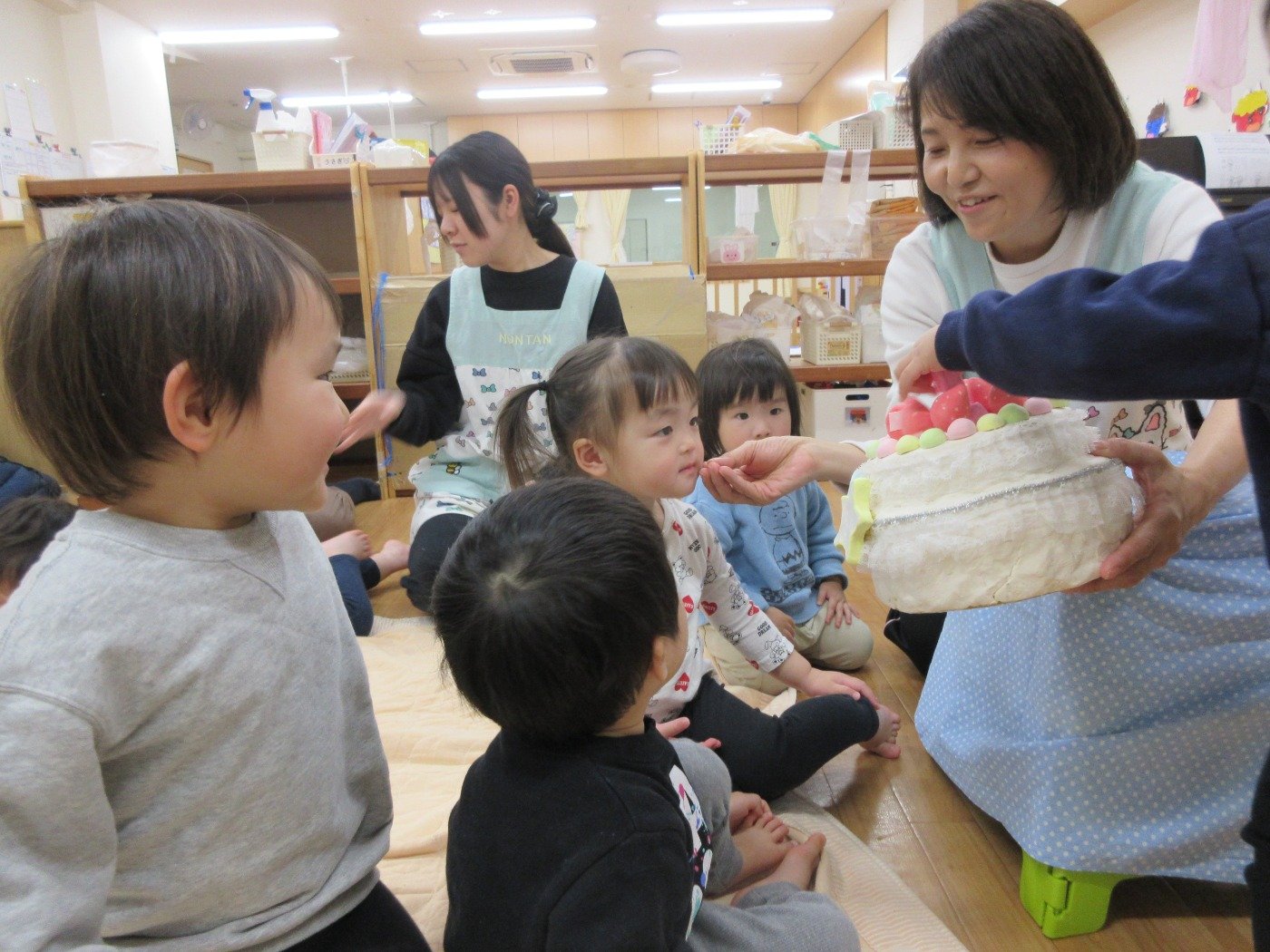 1月のお誕生日会 ホームブログ 2024.01.23 今日は1月のお誕生日会がありました。 お家の方と一緒でとっても嬉しそうな 誕生日のお友だち♪ お家の方と先生からの心のこもったメッセージや、 子ども達からは、お歌のプレゼントがありましたよ。 ケーキの飾りつけもとっても素敵に飾ってくれました! 最後に、おおきなかぶのペープサートを見ました。 かぶが抜けると、「ぬけた~!」と、 大喜びでした♪