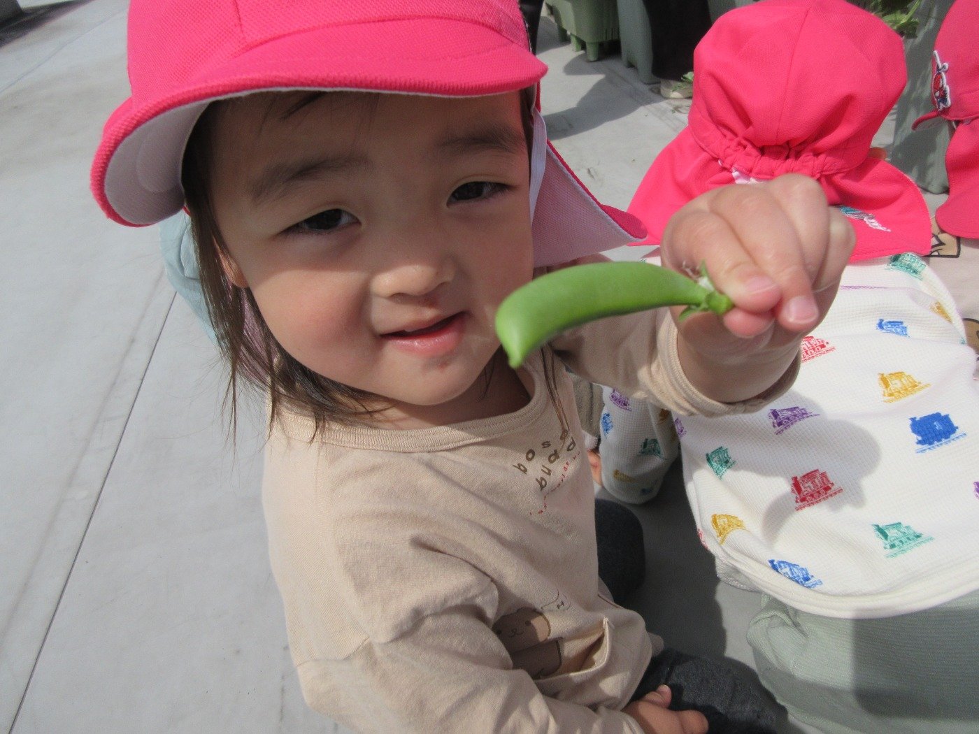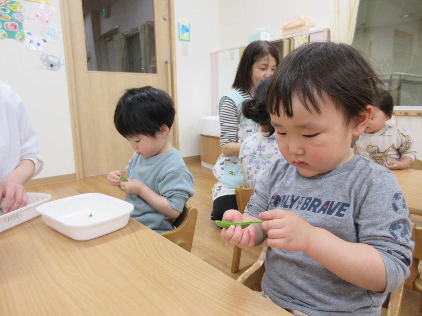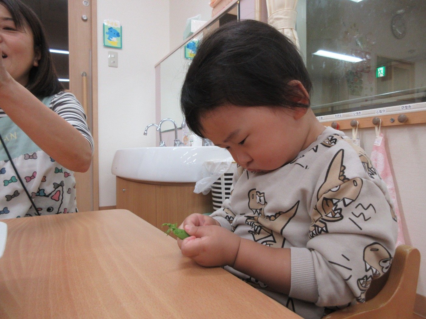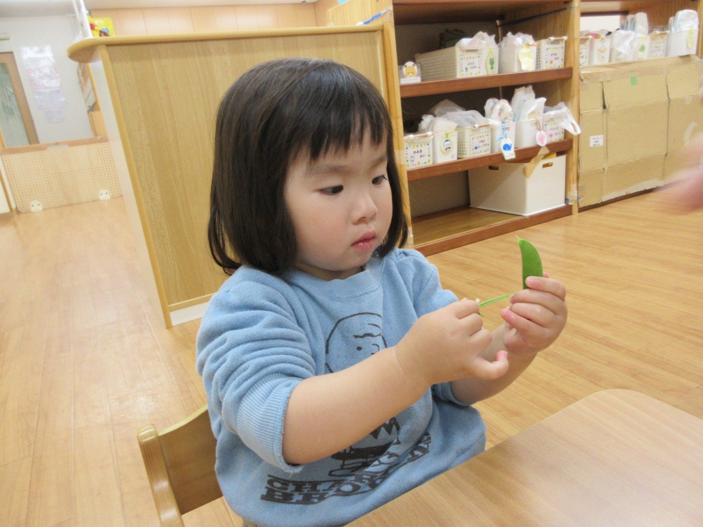 収穫したてのスナップエンドウを味わってほしくて、お調理の先生にお手伝いしてもらい筋とりにもチャレンジしましたよ。