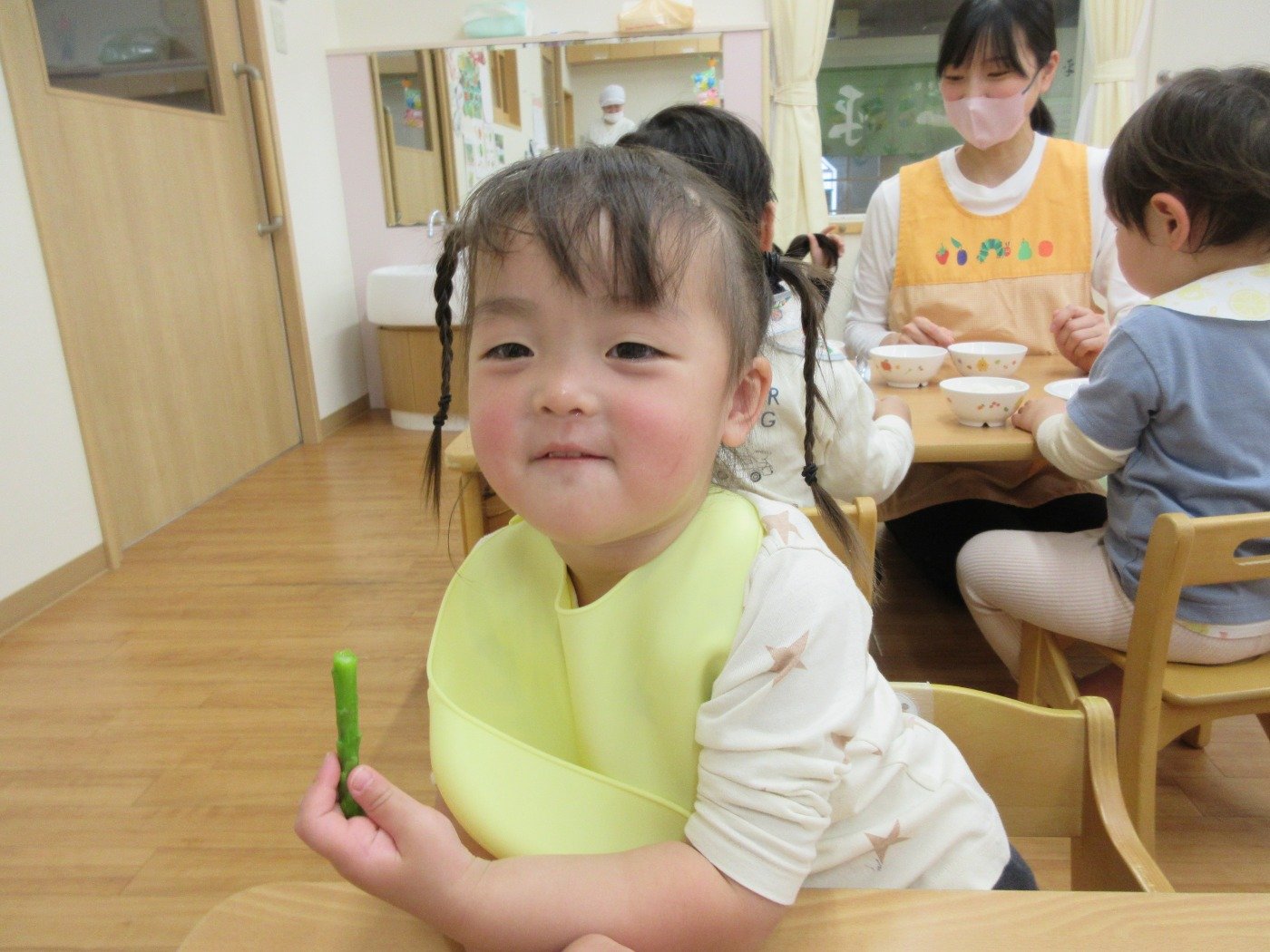 給食の中にアスパラを見つけると「あっ!あったよ!」と手づかみで嬉しそうに食べてました。アスパラ以外にも園で収穫したスナップエンドウも添え野菜で提供しました。
