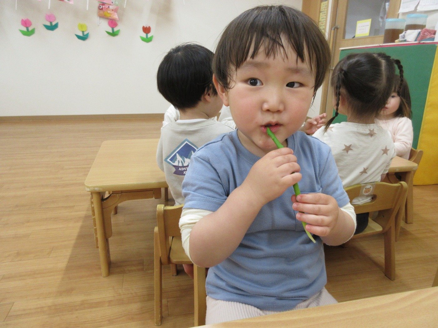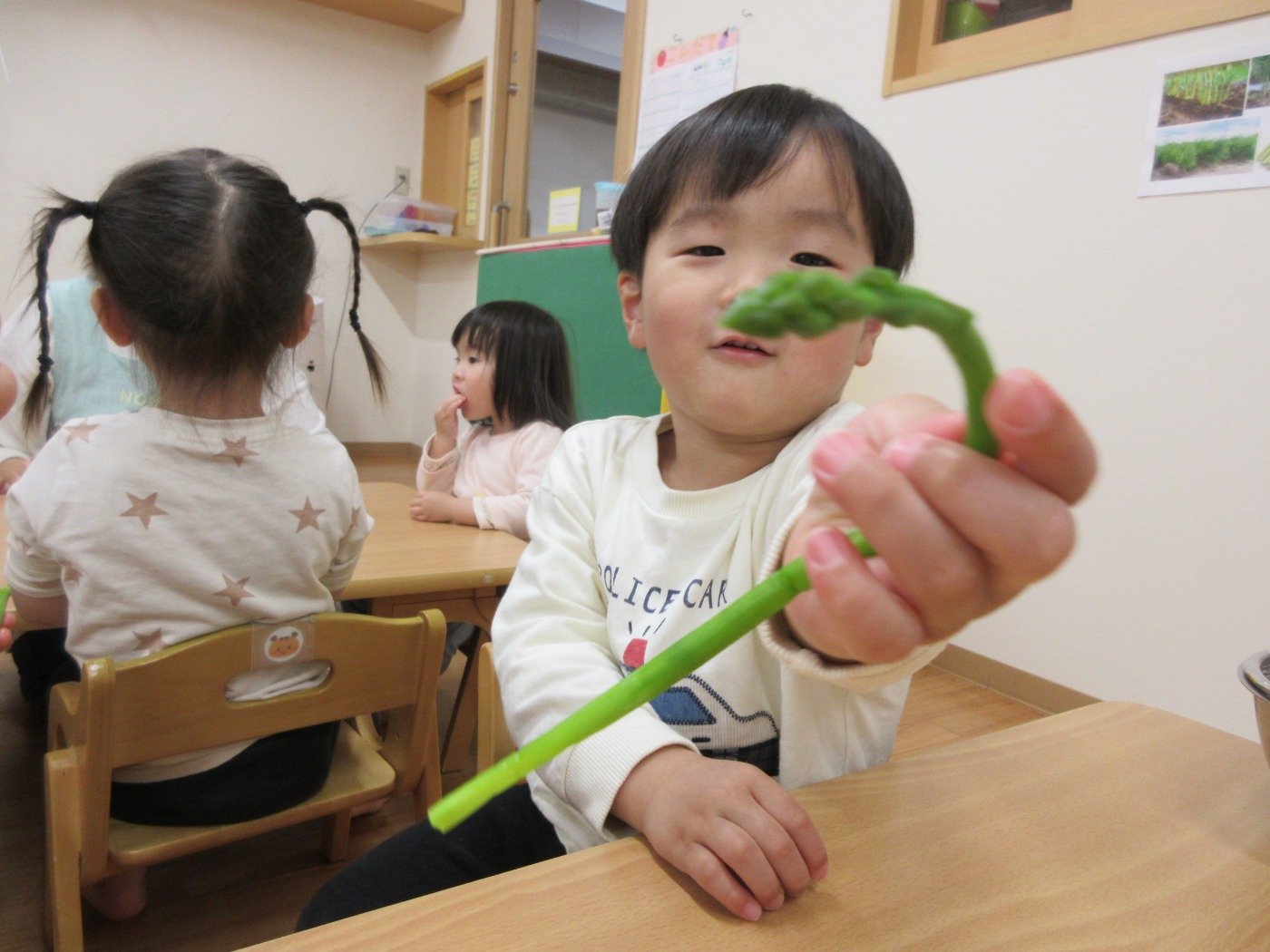 子どもの気づきは様々です。 湯がきたてのアスパラを一本ずつ配ると「ぱく!」と一口かじり・・・「うぅ~んおいしい」と手が止まらない子ども達でした。