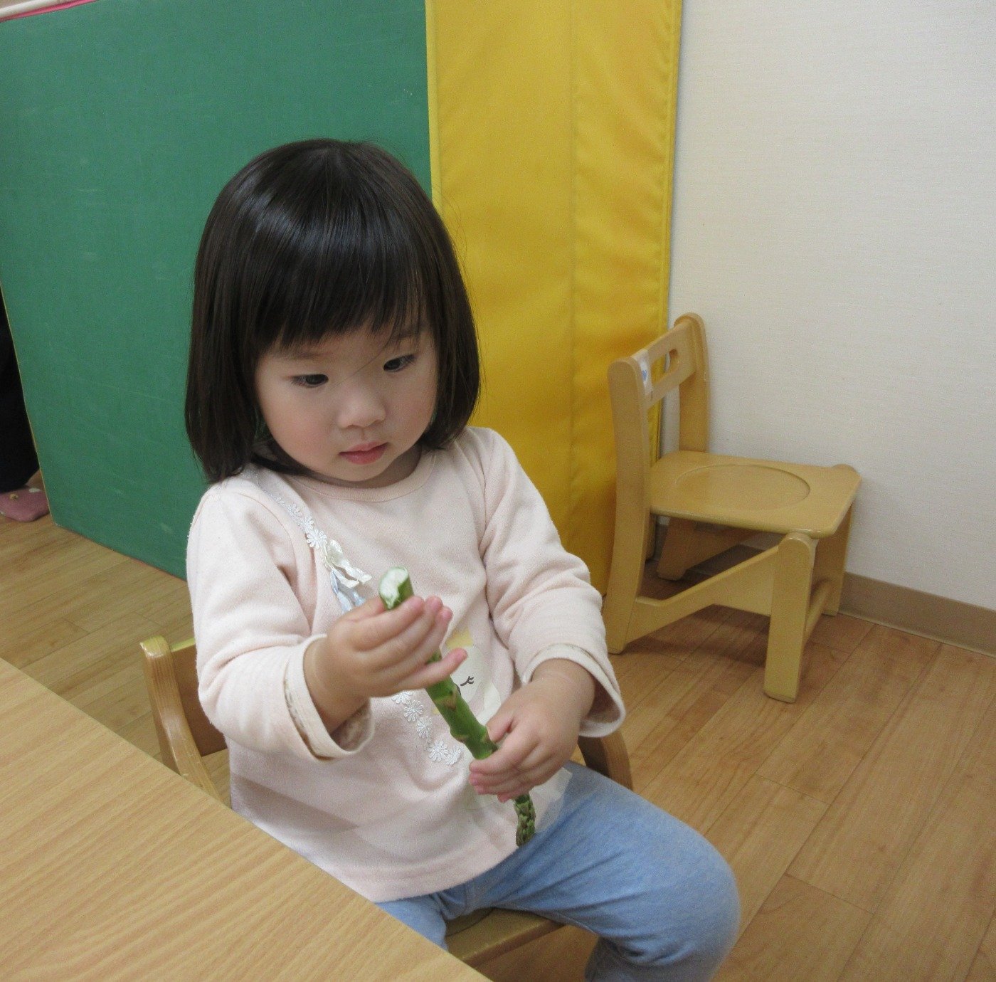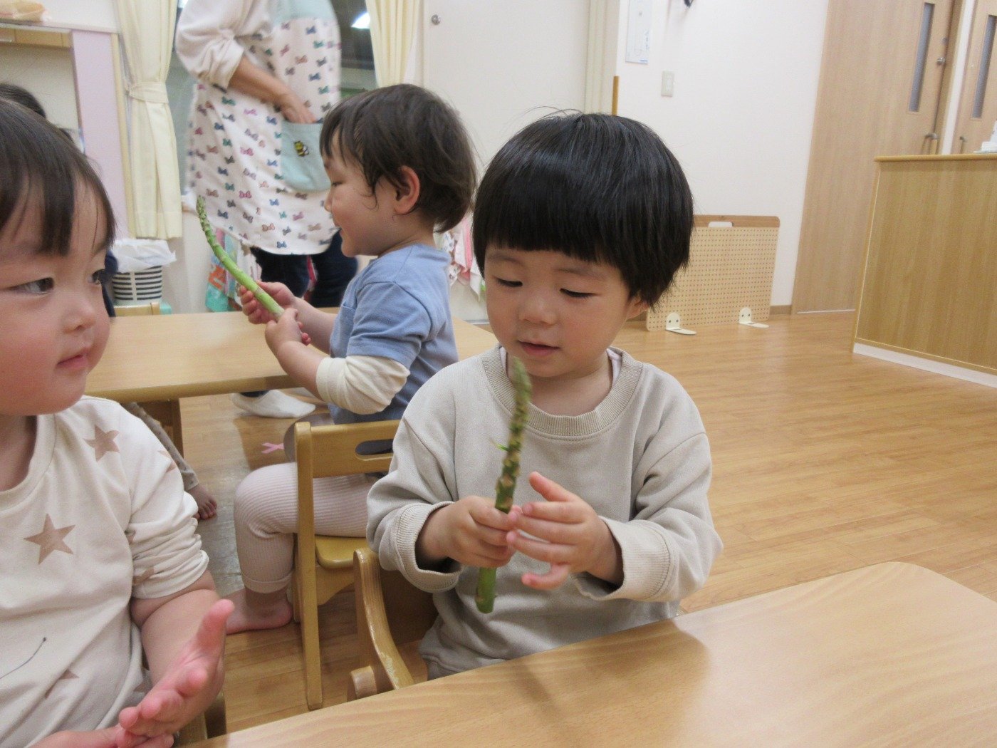 お調理の先生にアスパラをみせてもらうと、穂先をツンツンしたり顔の横にアスパラを寄せ「なが~い」なんて長さや、大きさに気づいたり。