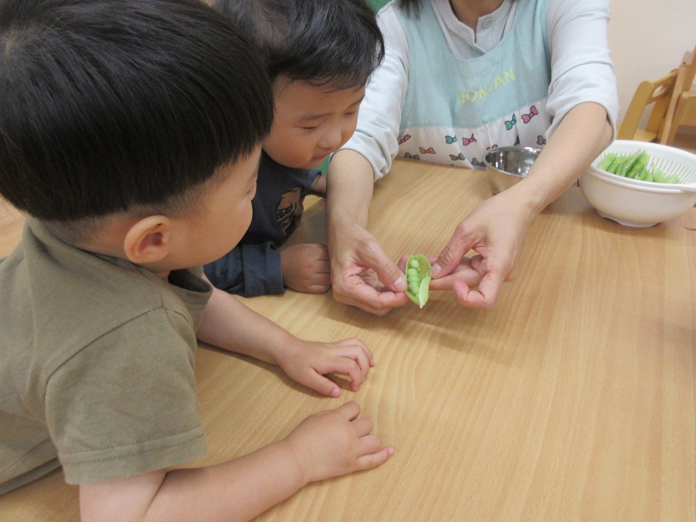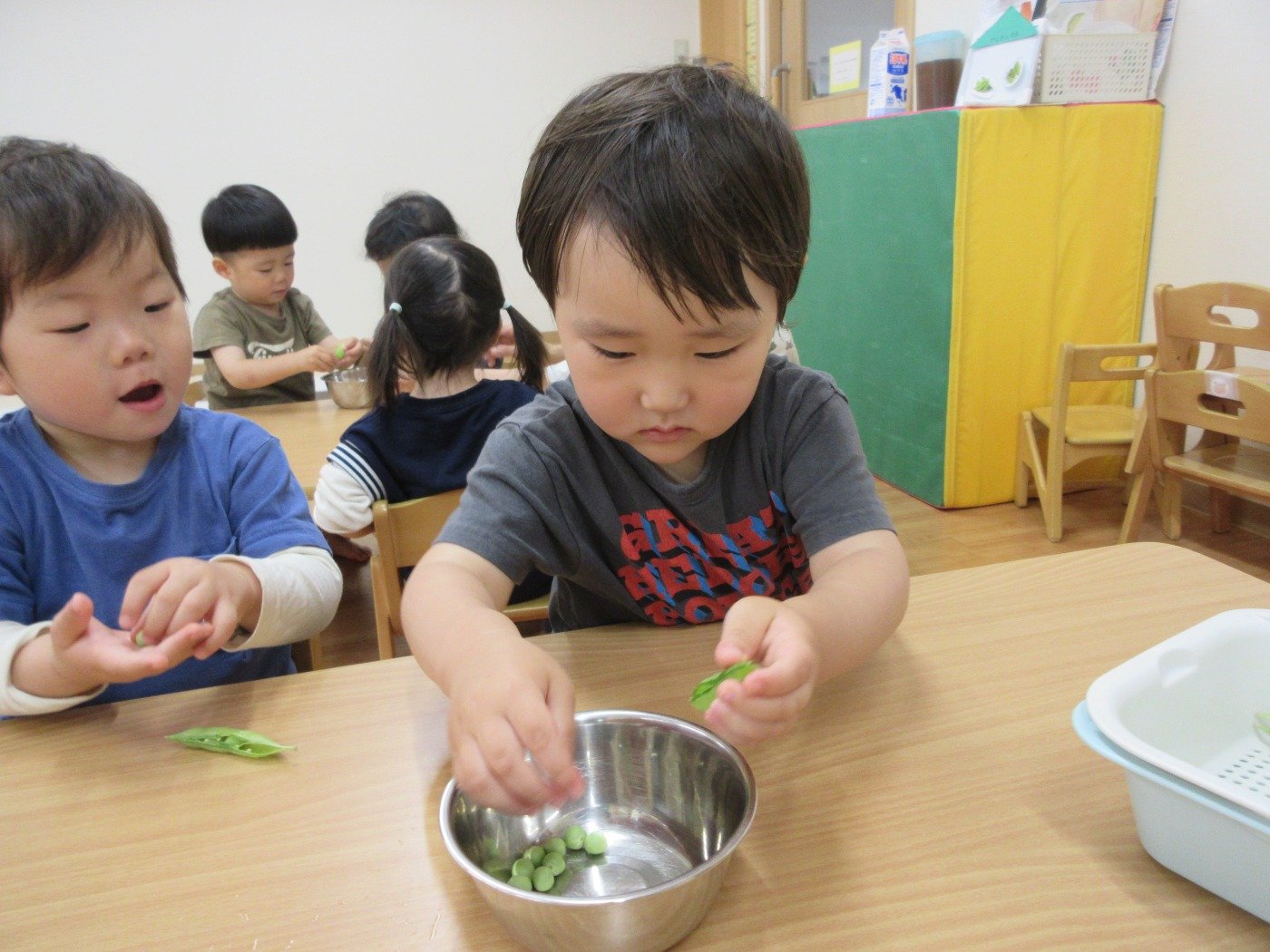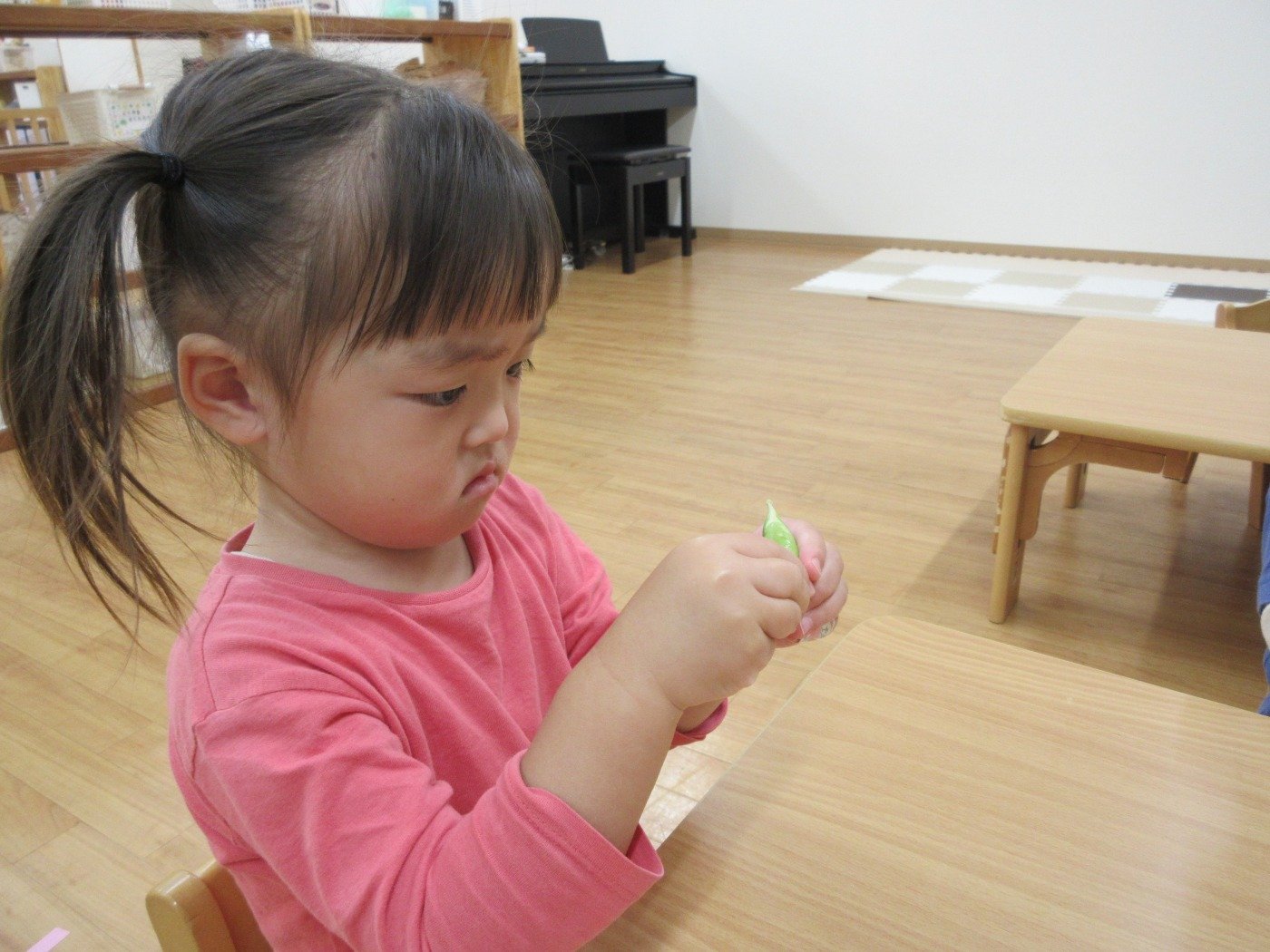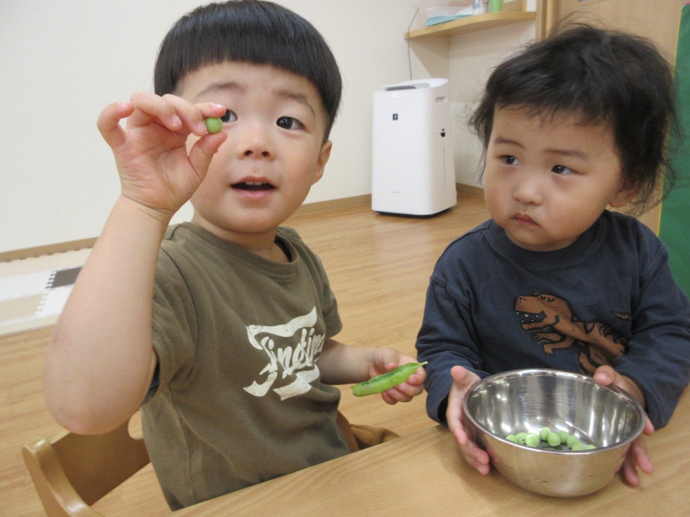 くま組さんは、朝のおやつ前にうすいえんどうの豆をさやから取り出しました。