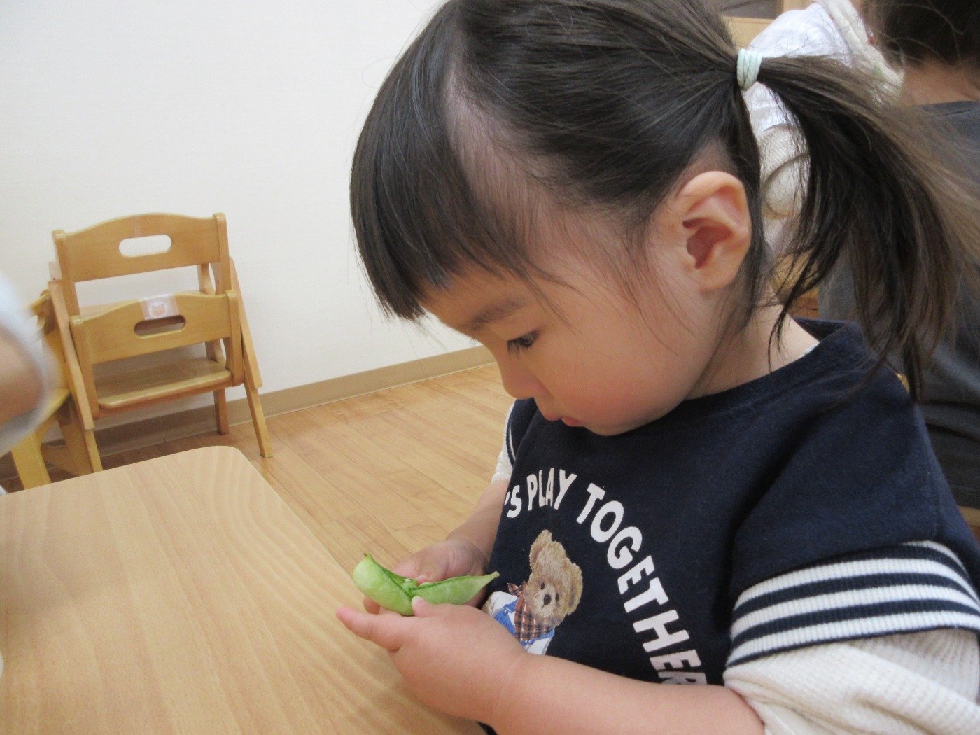 手際よいくま組さん。さやからお顔がみえると「あっ!ほらほら・・・」とお友だち同士みせあいっこしたり、そ~っとそ~っとお豆を取り出す姿!何度見てもワクワクしますね。