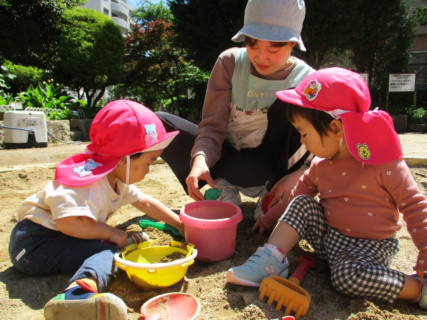 保育者と一緒にバケツにせっせと砂をいれ、大きなケーキを作っては崩し・・・の繰り返しがまた楽しい。
