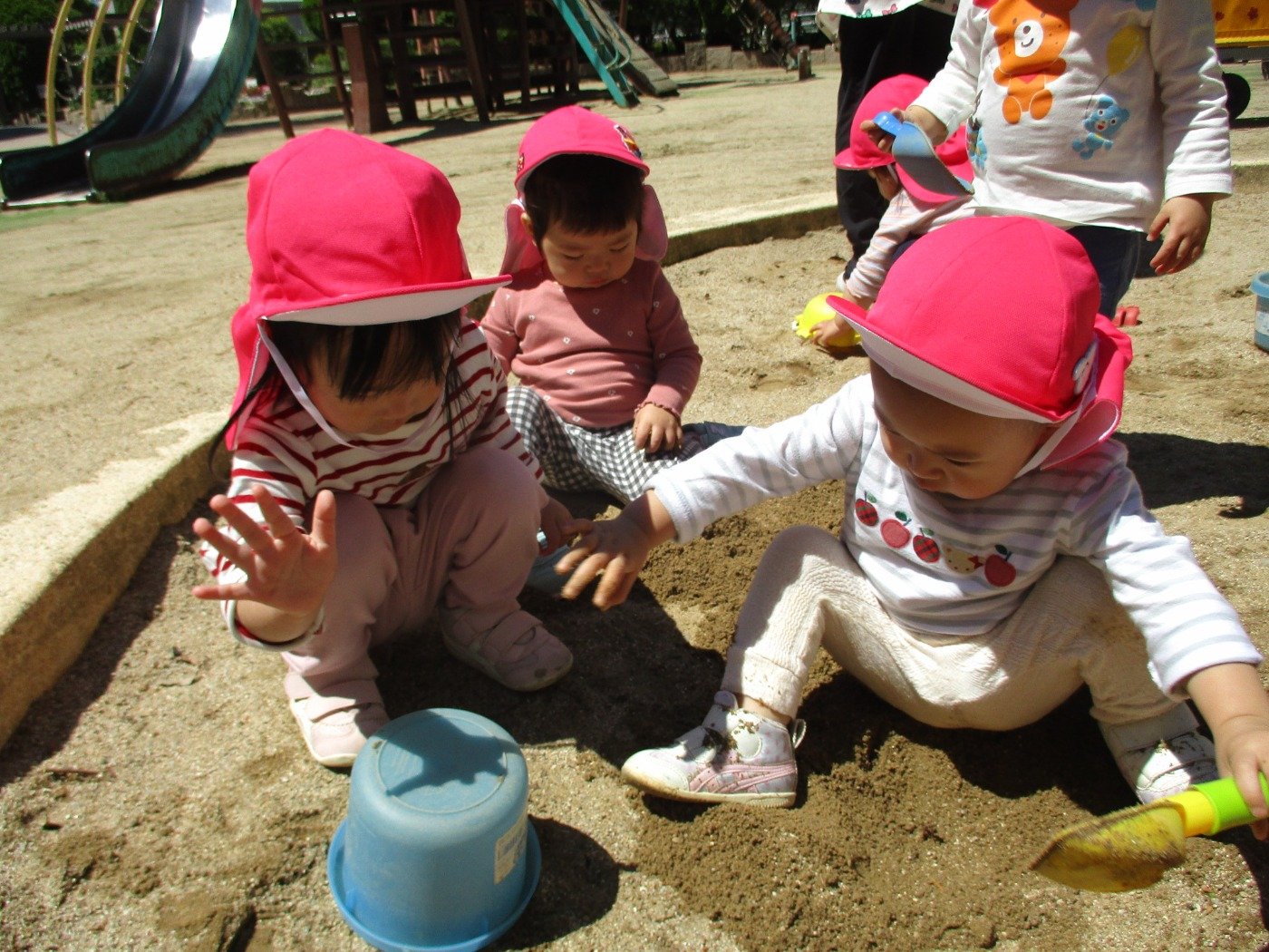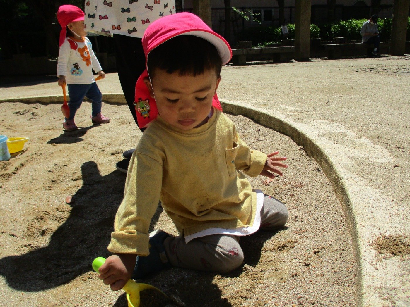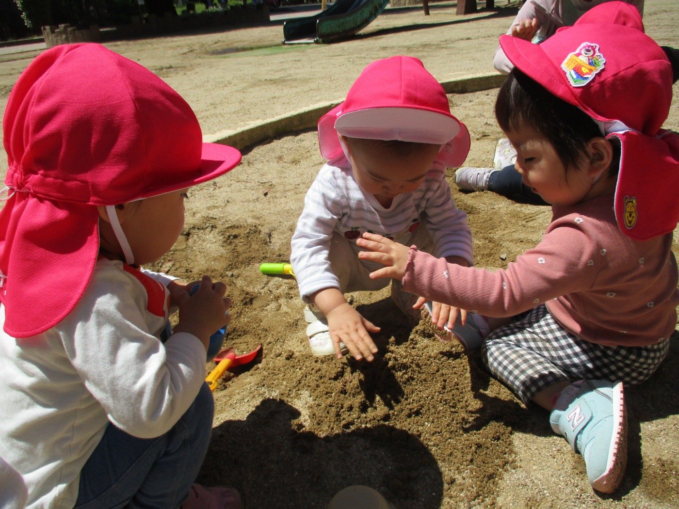 昨日振った雨でしっとりした砂の感触。冷たい!ギュっとしたら固まるかな?なんて声を掛けると、子ども達も手のひらいっぱいに砂を握って砂の感触を味わっていました。