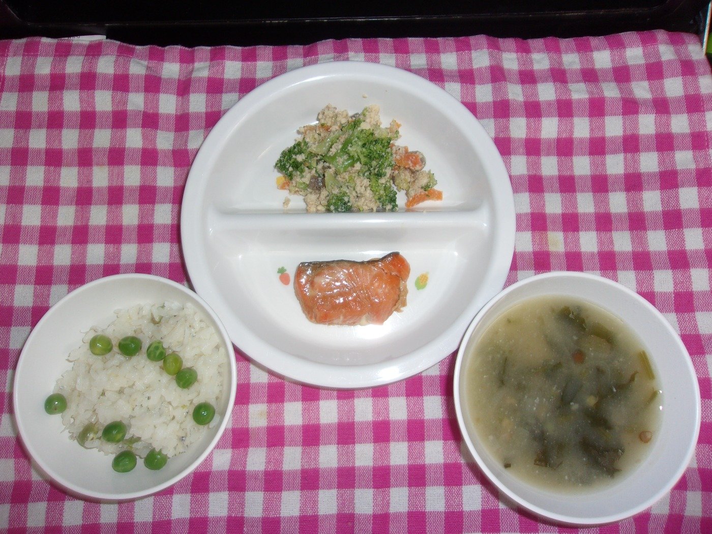 給食には、グリンピースとしらすごはんが出ましたよ。