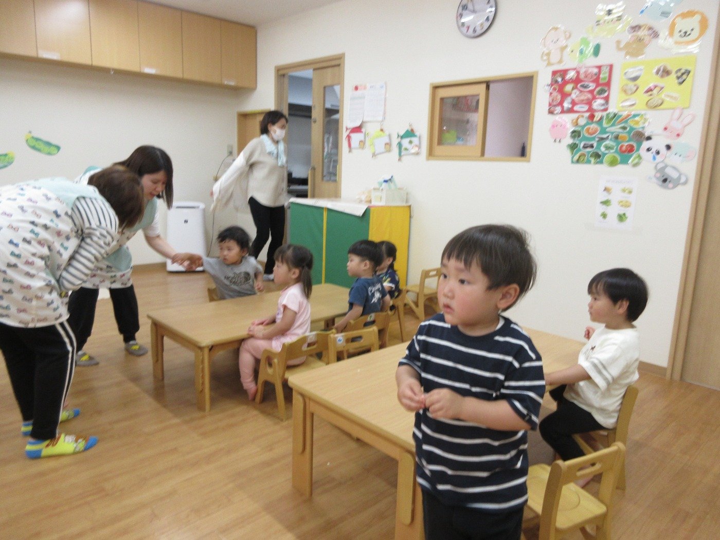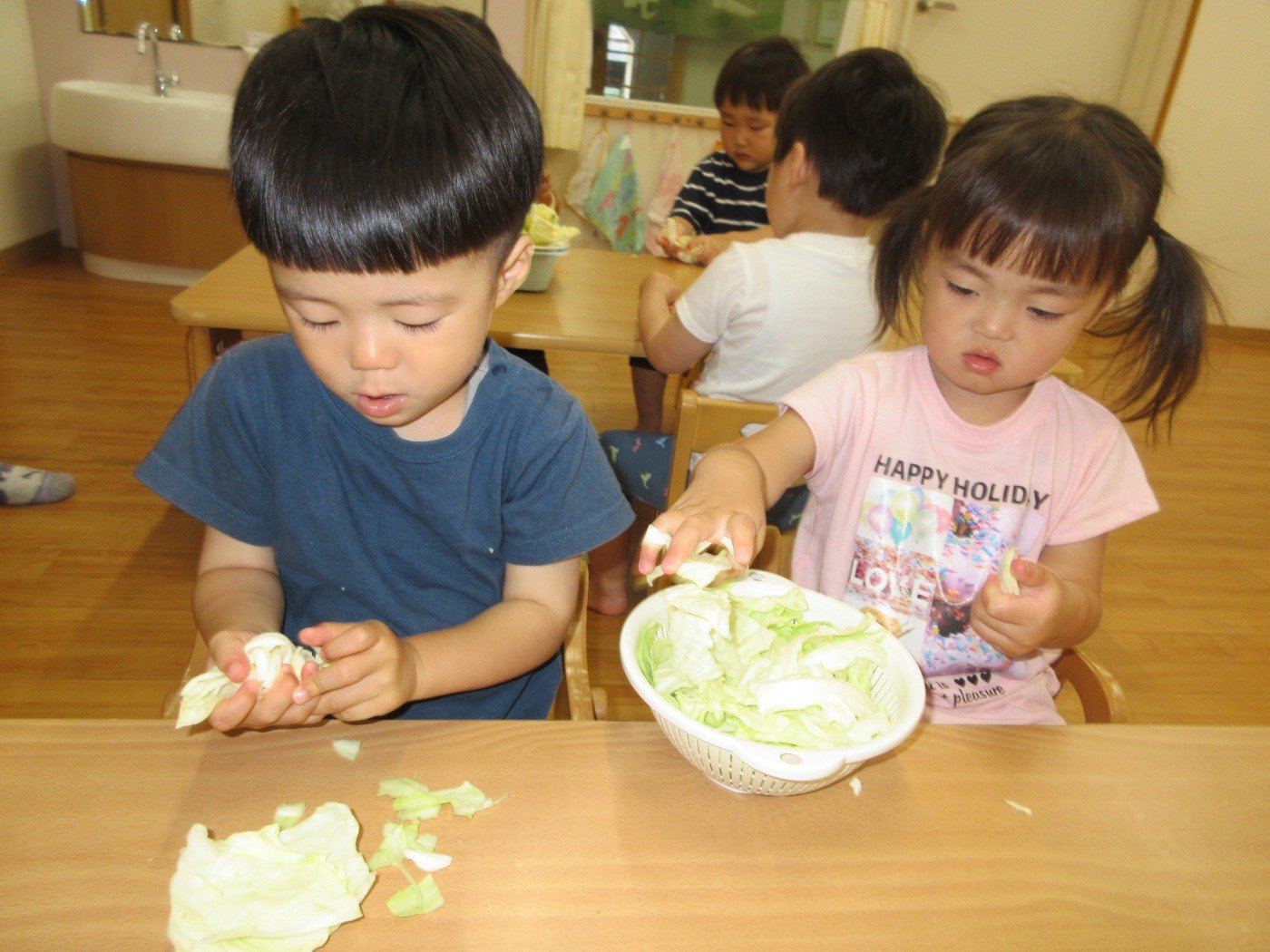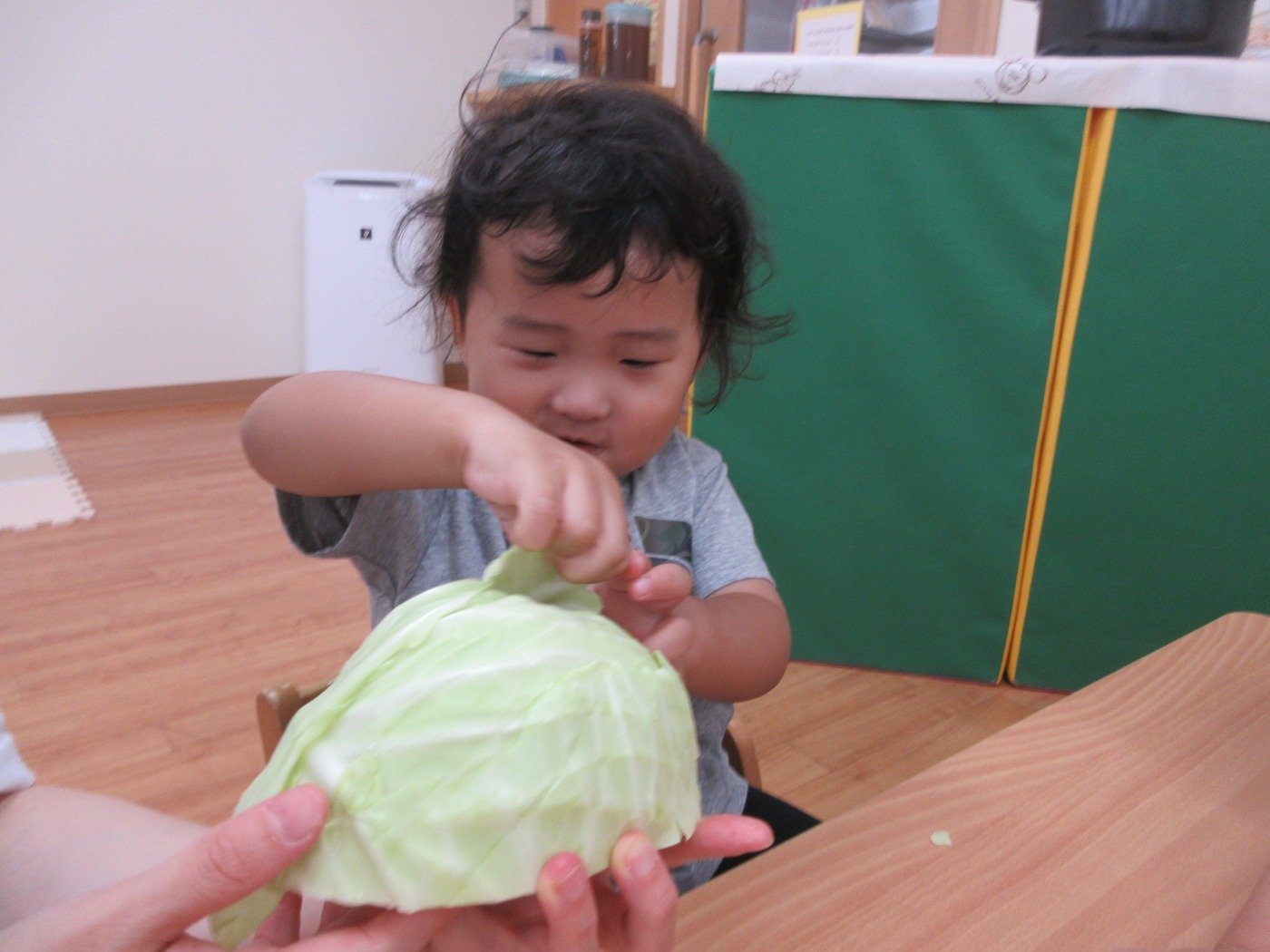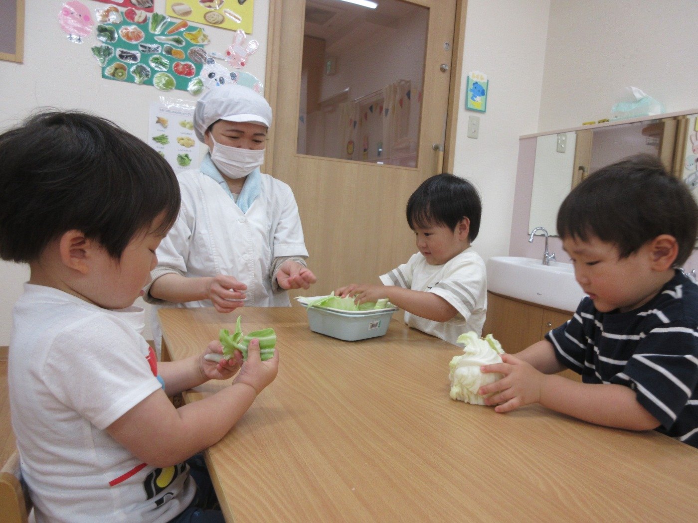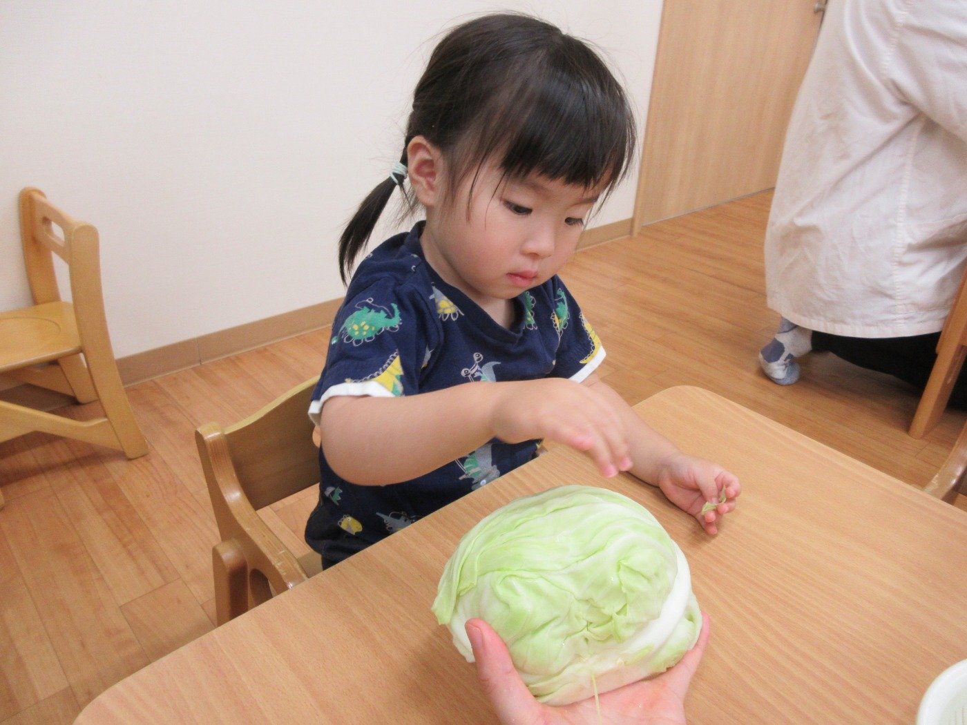くま組さんは、今日の給食に出るキャベツのポタージュ作りのお手伝い!キャベツを小さく小さくちぎるお手伝いをしてくれました。