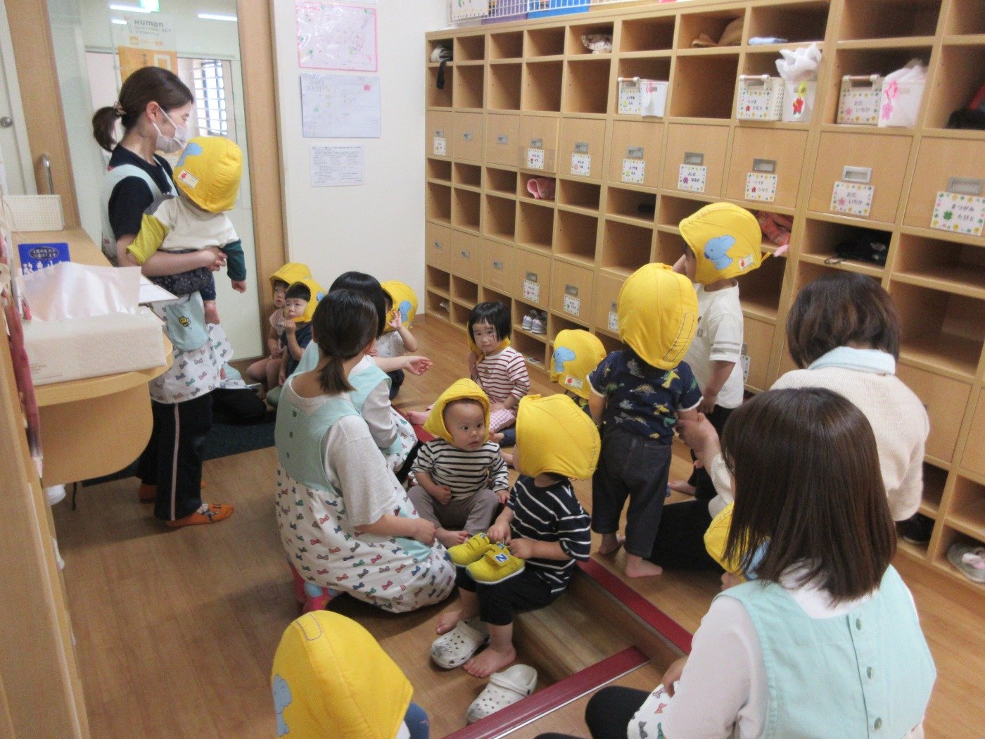 新入児さんは初めて防災ずきんを被るお友だちもいましたが、上手にかぶっていましたよ。