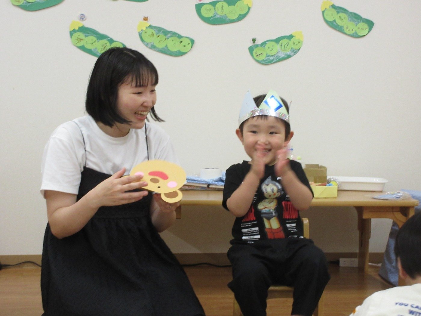 誕生日会では、保育者のマジックショーをみたり、参加型のスケッチブックシアターに楽しく参加したりと、みんなの笑顔がいっぱいの会でした。