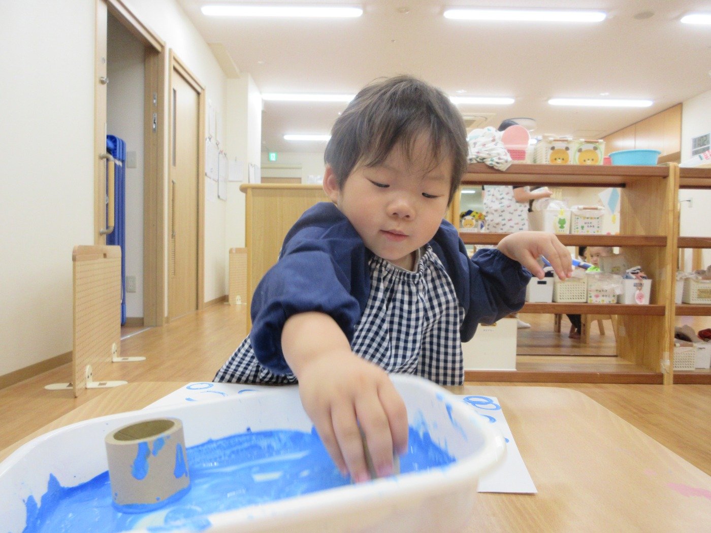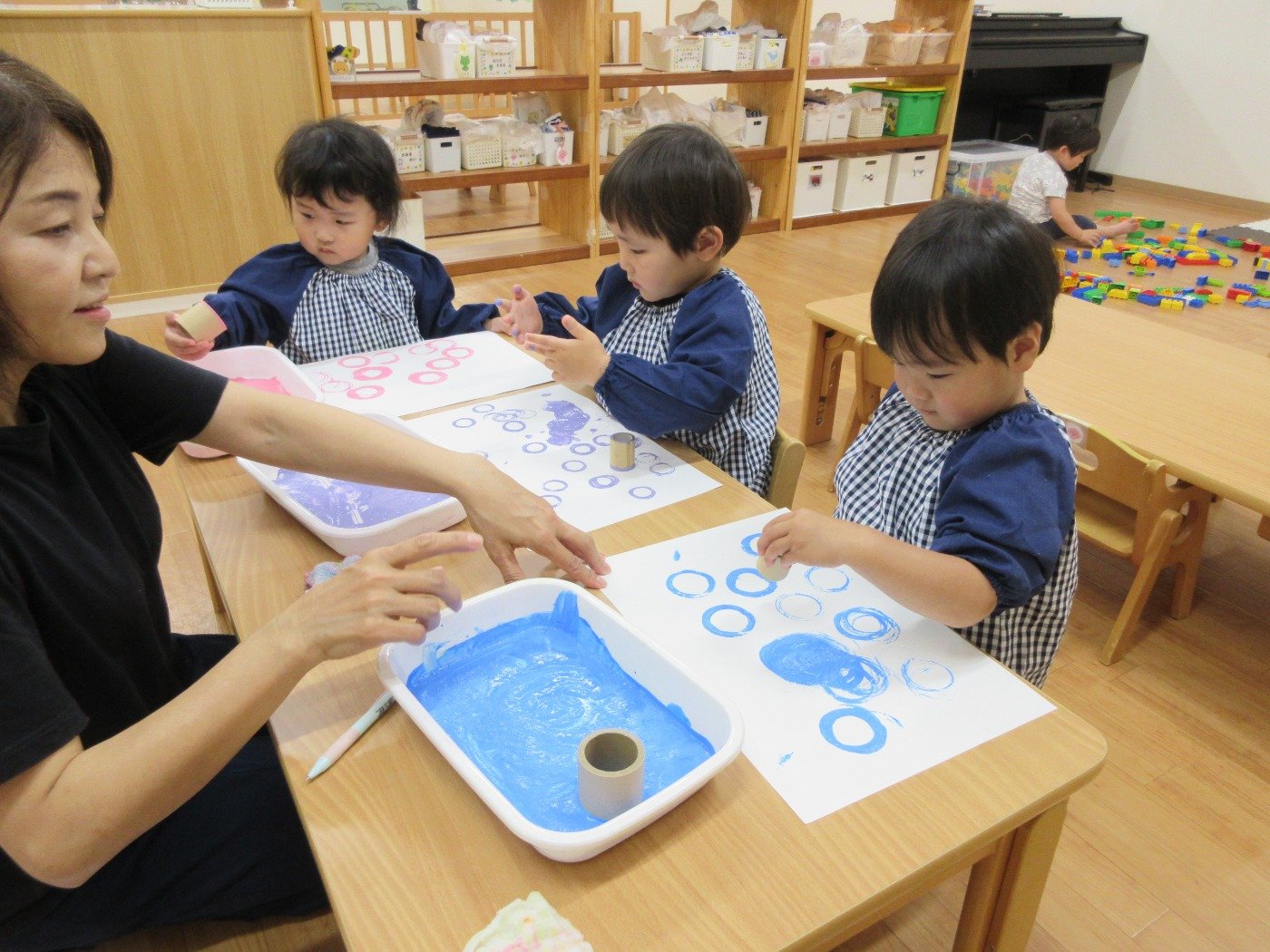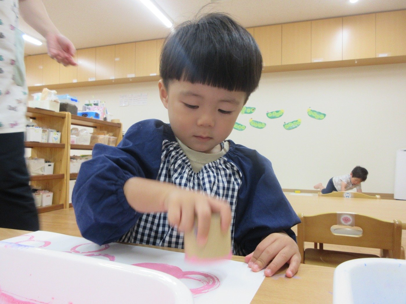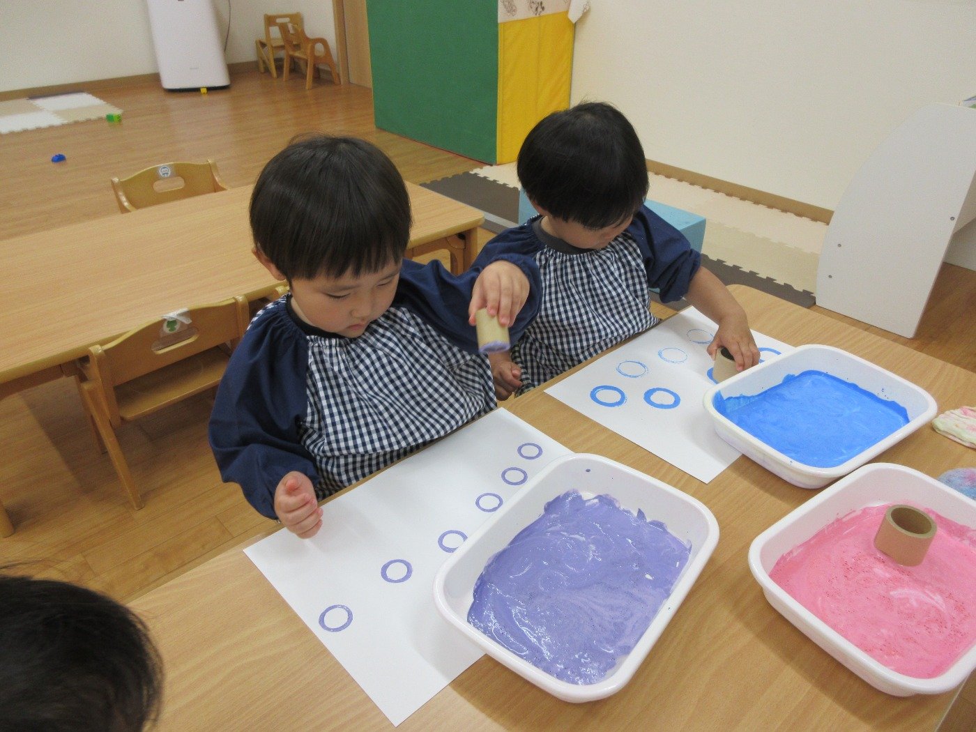 意欲的な子ども達でした。3色の色を自分でまぜてスタンプしたり、絵の具を指で触れ指スタンプもしてみたり。
