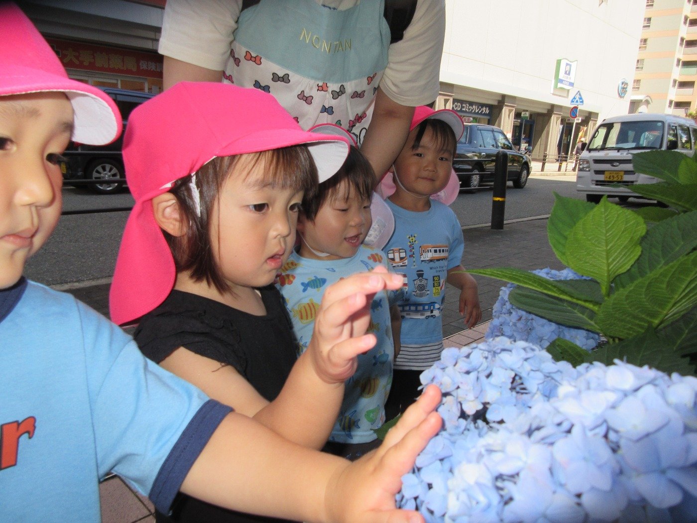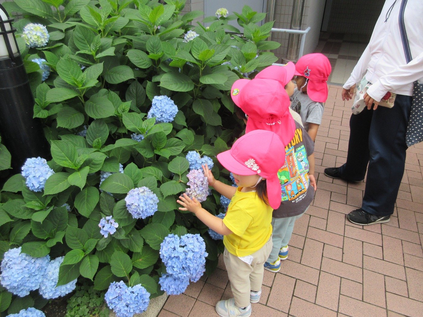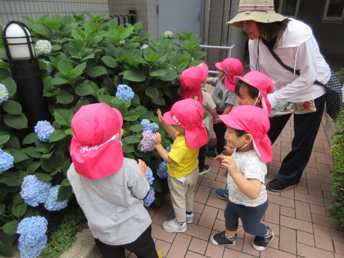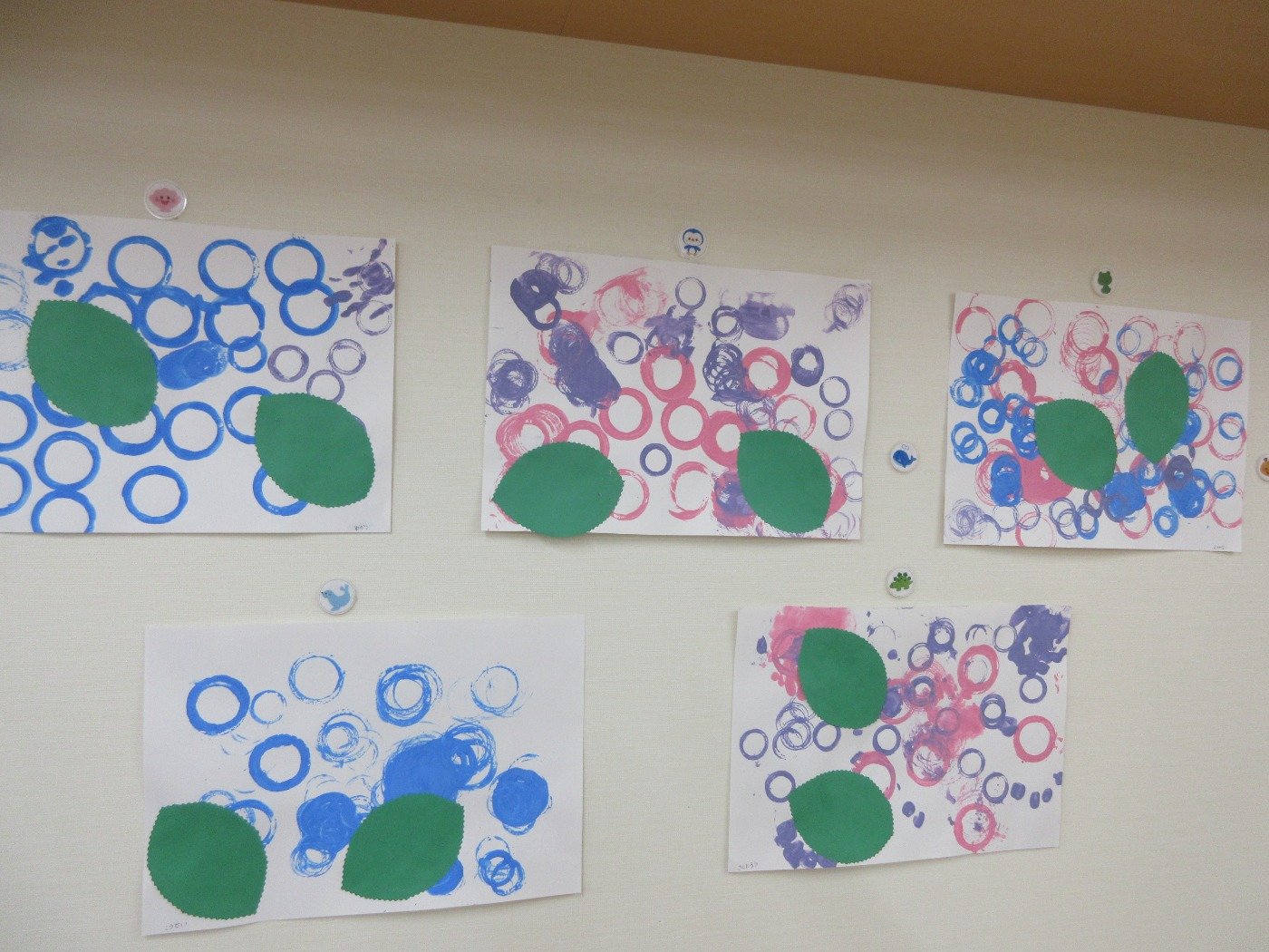 保育者が散歩道中に見た紫陽花の話をすると・・・お友だちに「ピンクも青もあったね!」「〇〇くんは青がすき!」なんて話す姿も見られスタンピングにも
