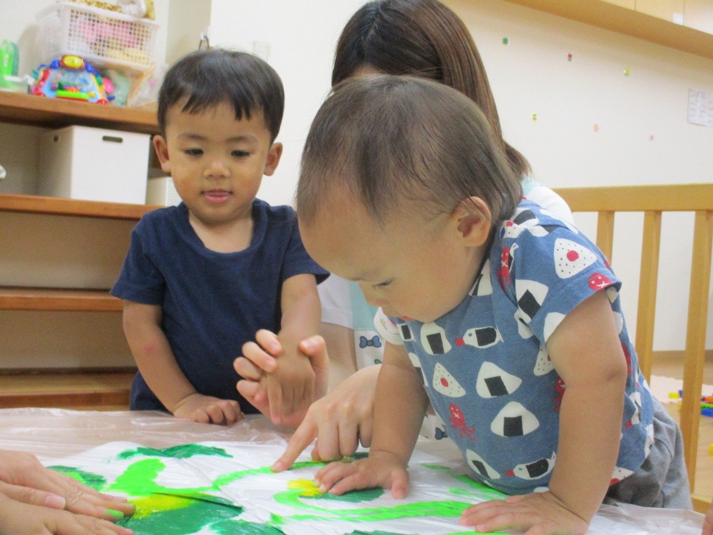 手のひらでじんわり!少しずつ前後左右に手のひらを動かしては、絵の具の広がりを楽しむ子。