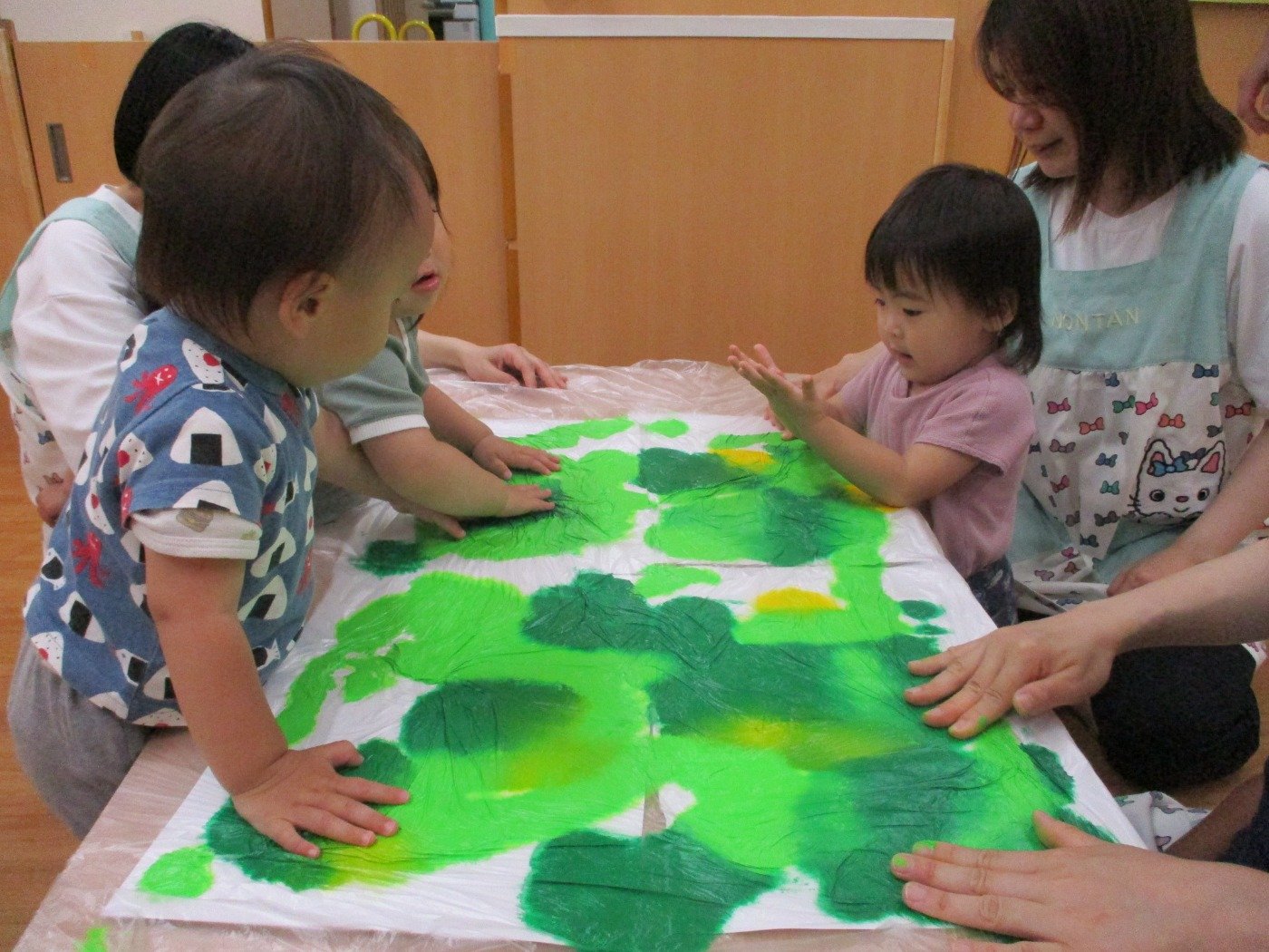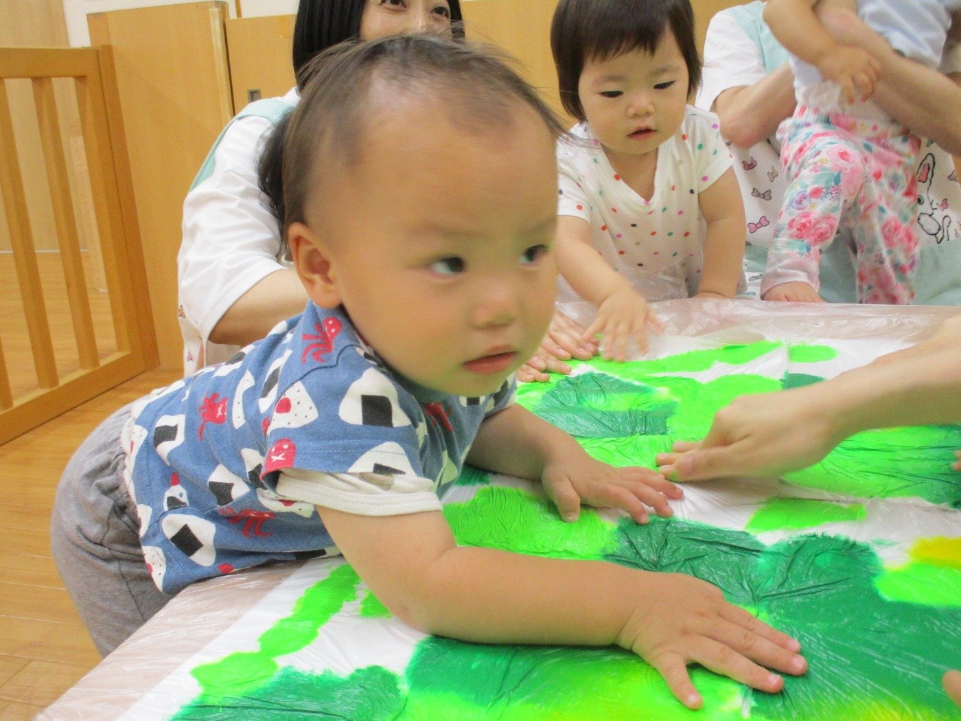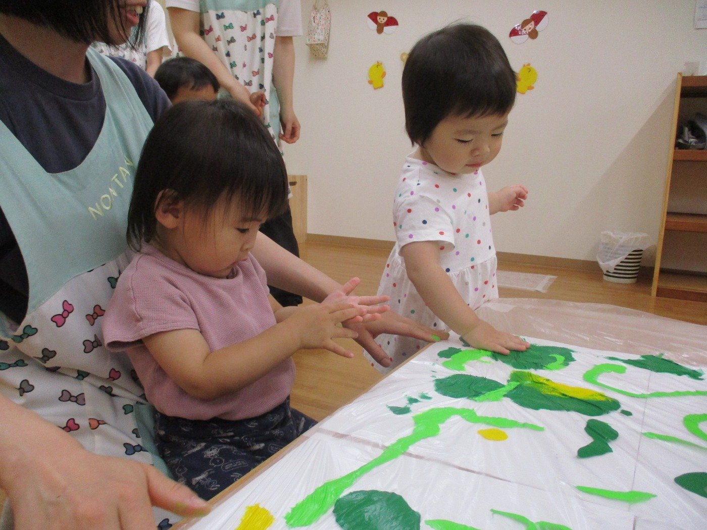 今日はうさぎ組さんみんなで、絵の具の感触遊びをしました。
