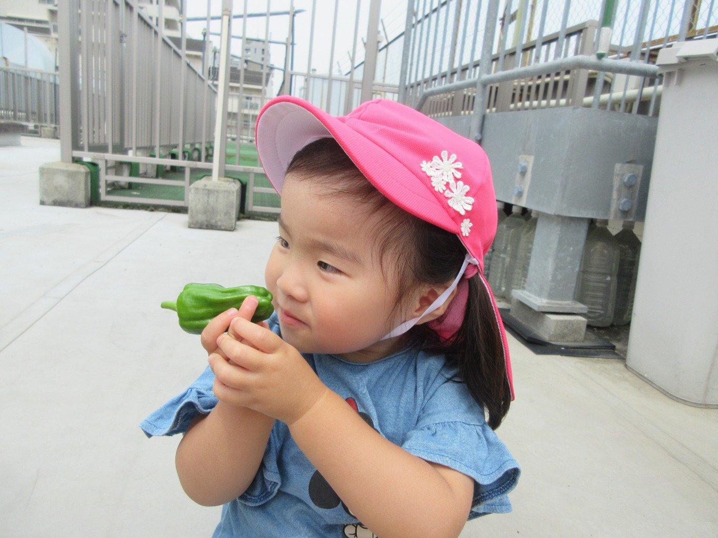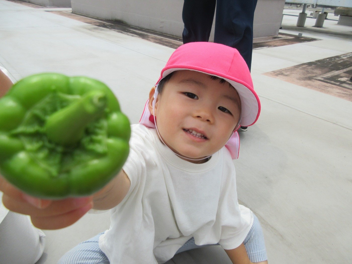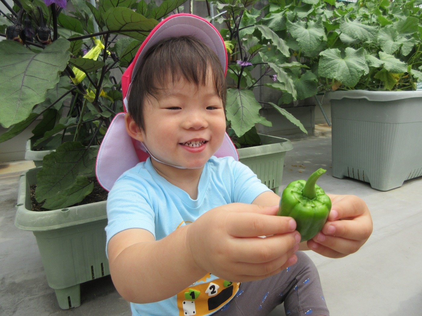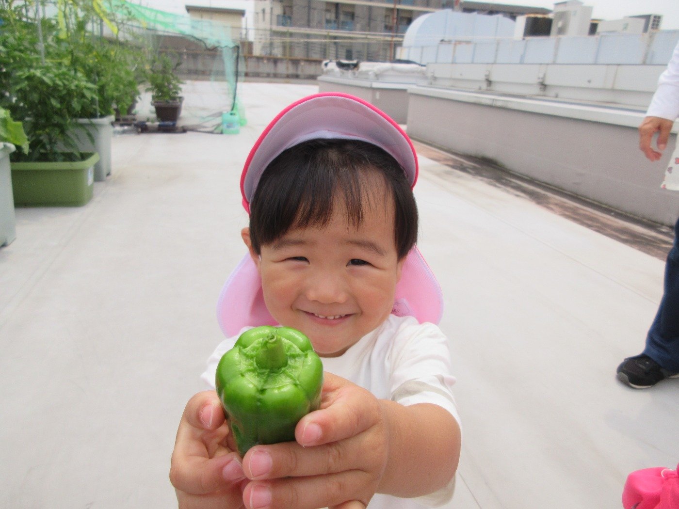 もぎたて!! ホームブログ 2024.06.20 お誕生日会が終わってから、くま組さんは園で栽培している野菜の収穫に出かけました。 きゅうり・なす・ピーマン・トマト!大きくなっているかな~。 「ピーマンあったよ!」「トマトも!」と、大喜びな子ども達。 「ただいま~」の声も弾んでます。ピーマンを一人一つずつ手に持って帰ってきましたよ。 いつもだっらお調理の先生がお料理してくれるんですが、今日はお家に持って帰って味わってね😊