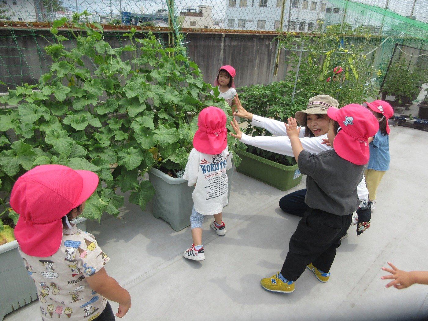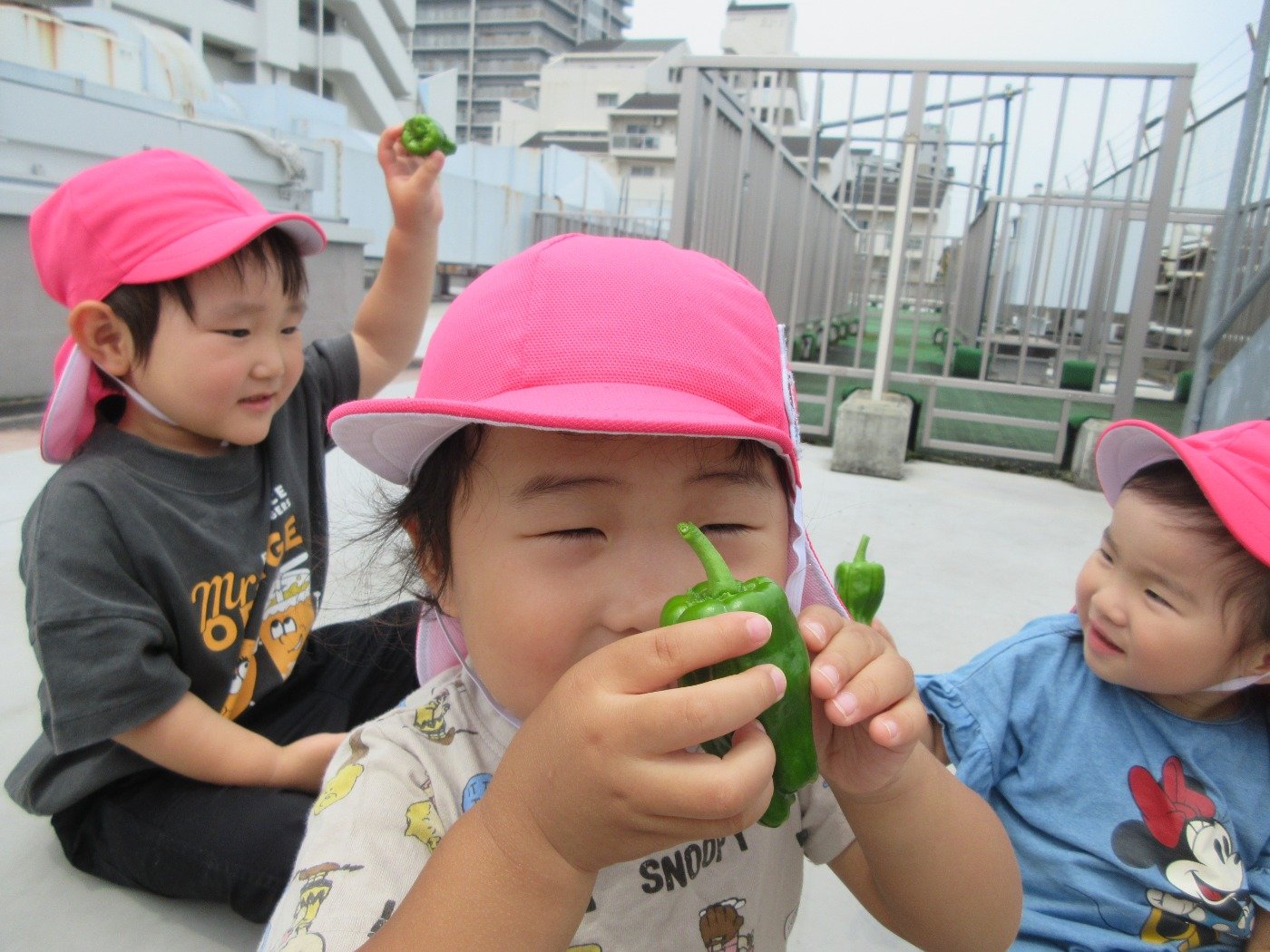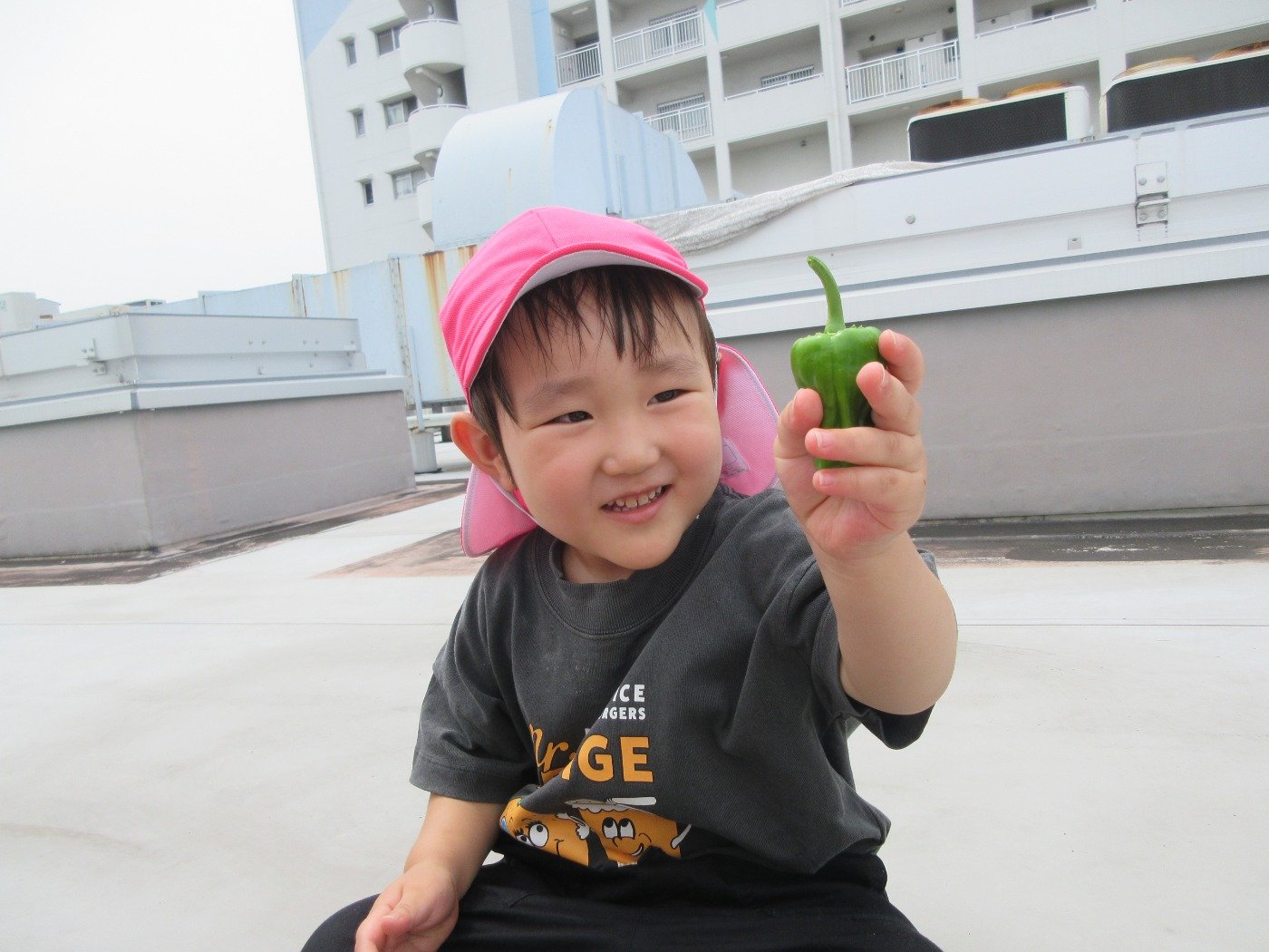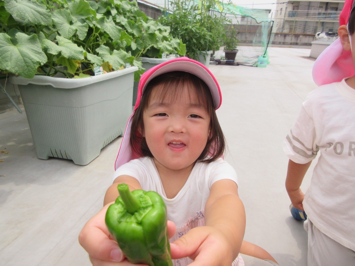 もぎたて!! ホームブログ 2024.06.20 お誕生日会が終わってから、くま組さんは園で栽培している野菜の収穫に出かけました。 きゅうり・なす・ピーマン・トマト!大きくなっているかな~。 「ピーマンあったよ!」「トマトも!」と、大喜びな子ども達。 「ただいま~」の声も弾んでます。ピーマンを一人一つずつ手に持って帰ってきましたよ。 いつもだっらお調理の先生がお料理してくれるんですが、今日はお家に持って帰って味わってね😊