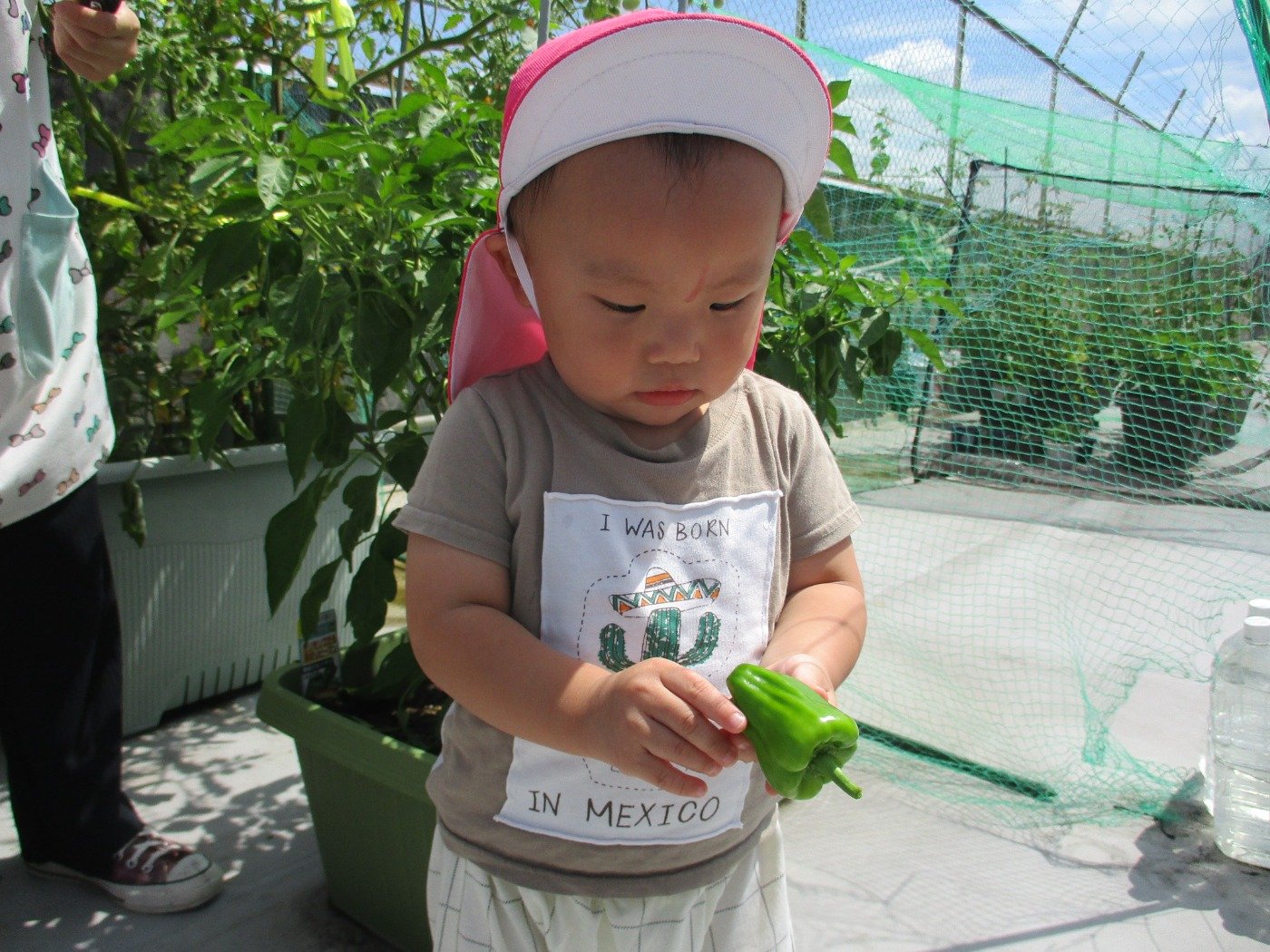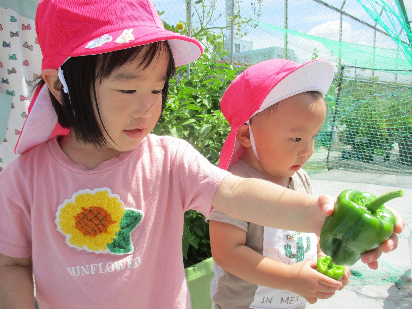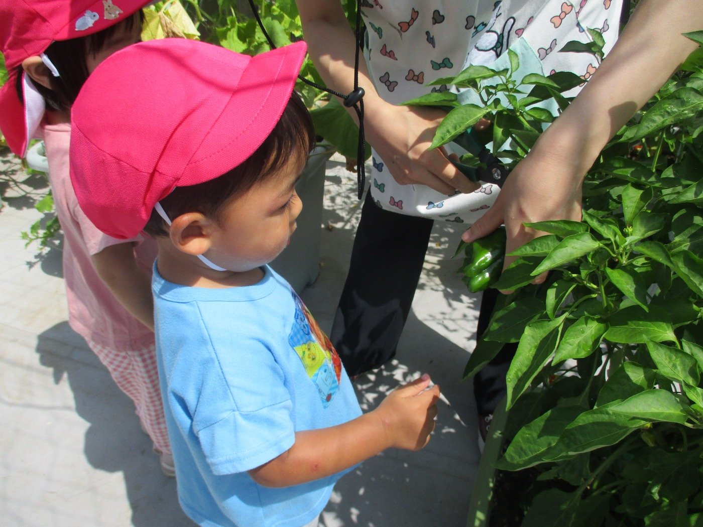 ピーマン!ってつたない発音で一生懸命伝えようとする姿がとっても可愛いうさぎ組さん😊 収穫に向かう足取りが軽やかで、ワクワクの様子が伝わります。