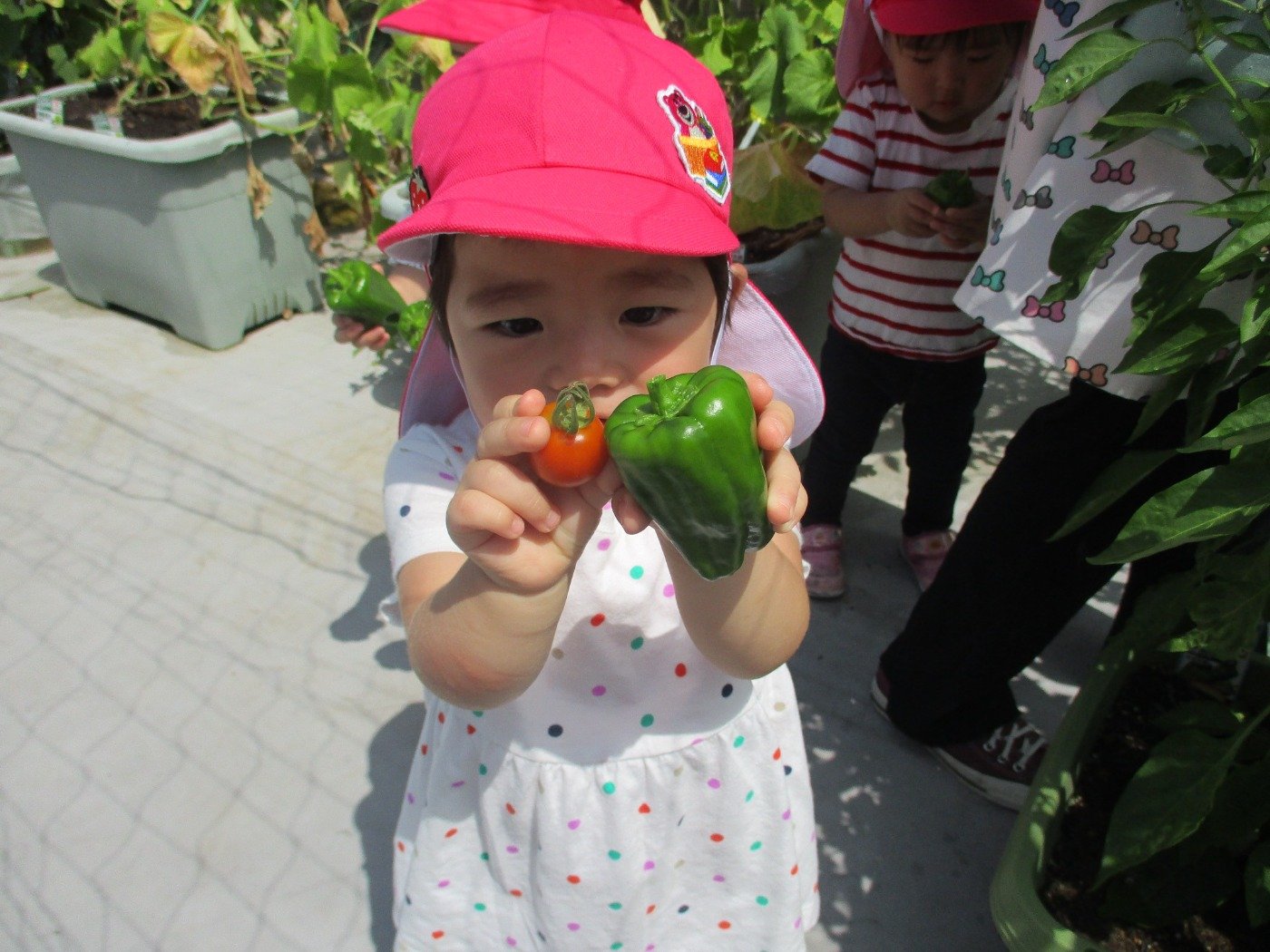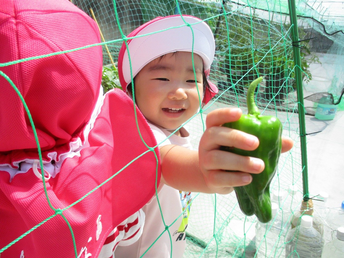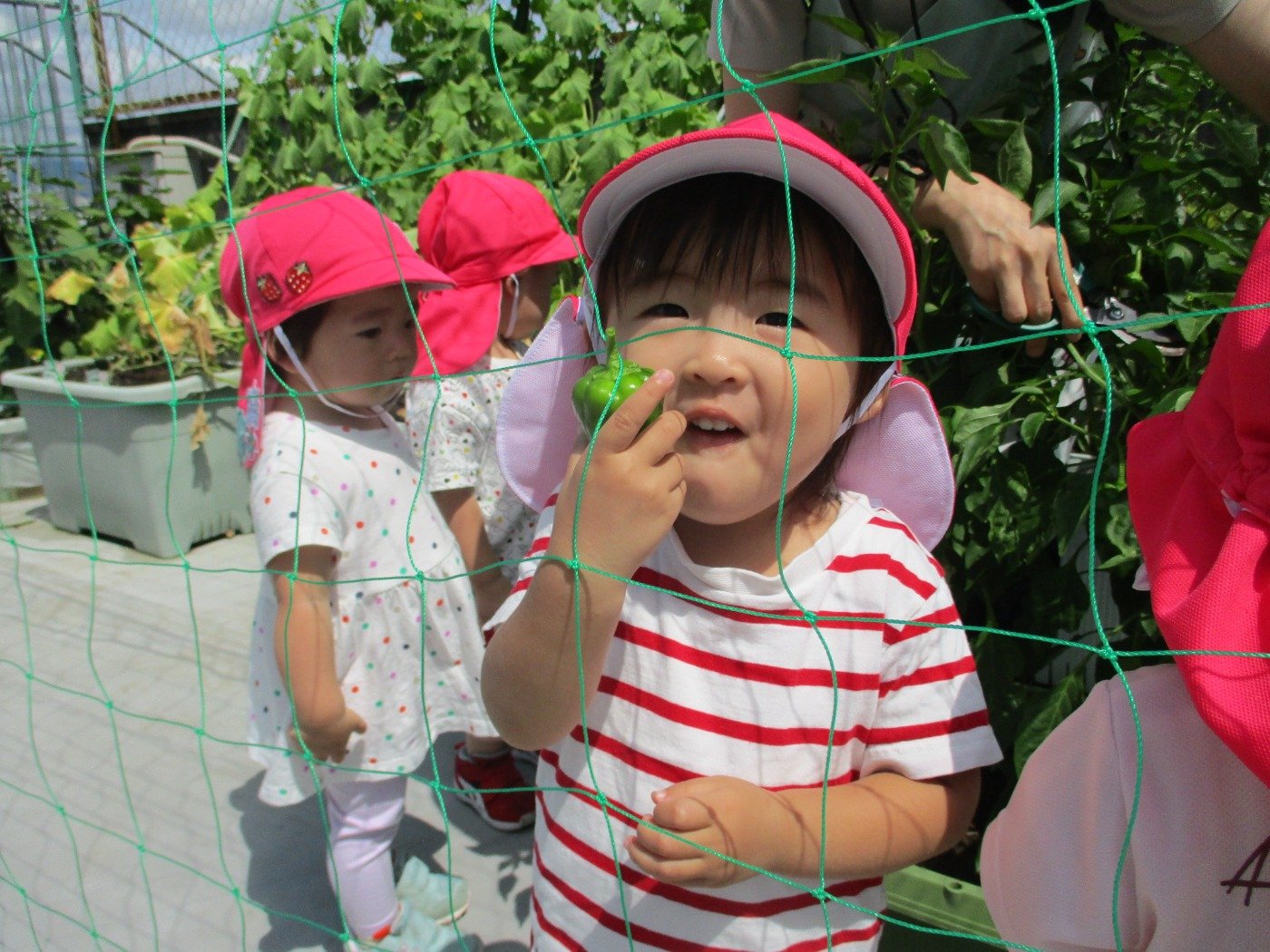 ピーマン!ってつたない発音で一生懸命伝えようとする姿がとっても可愛いうさぎ組さん😊 収穫に向かう足取りが軽やかで、ワクワクの様子が伝わります。