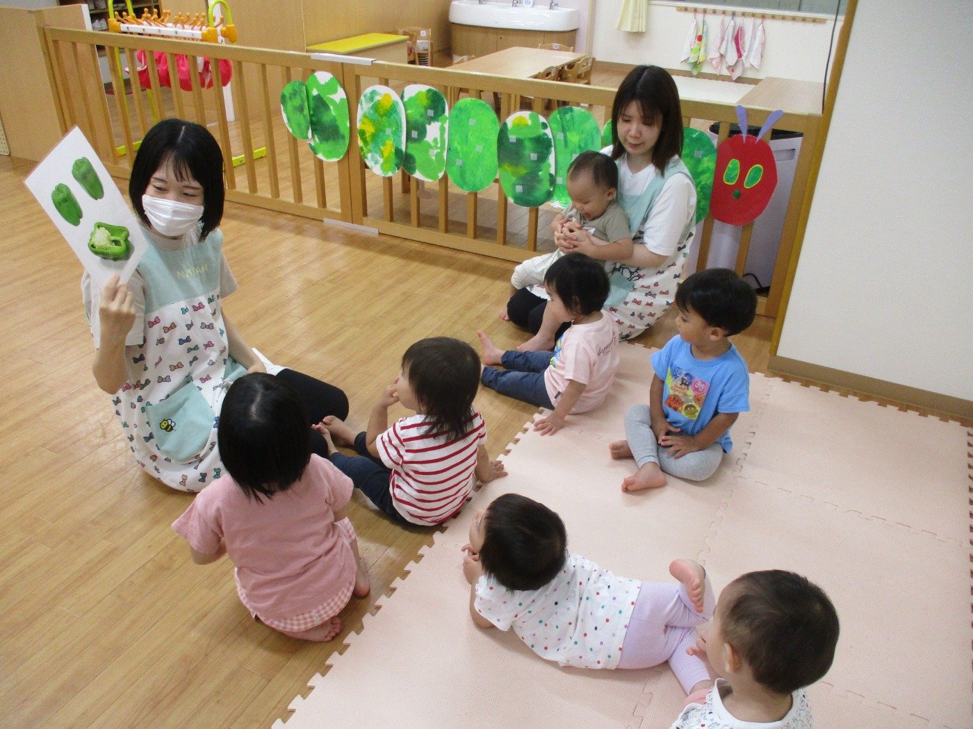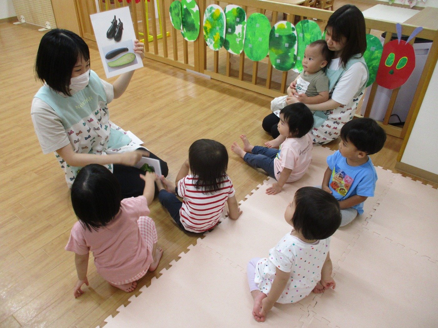 まずはお部屋で、夏野菜のお話をきいたよ。「これ何かな?」の問いに、「ピーマン!」と嬉しそうに答える子ども達。