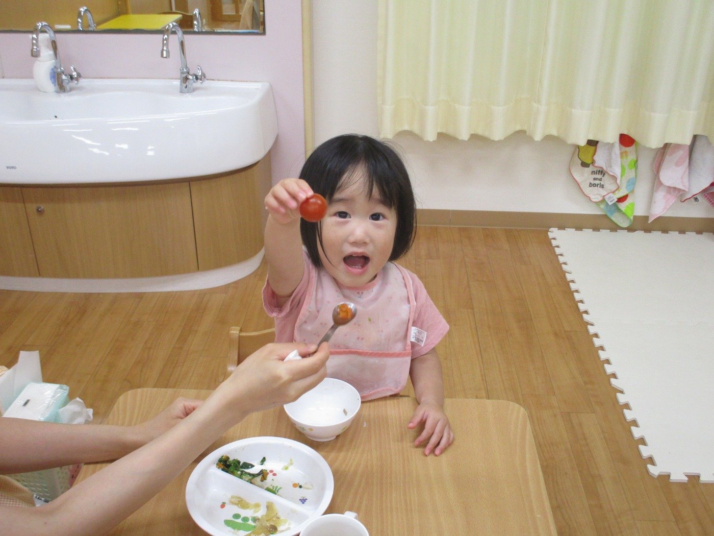 皆で取ってきたトマトだよ~!って声をかけると・・・・
