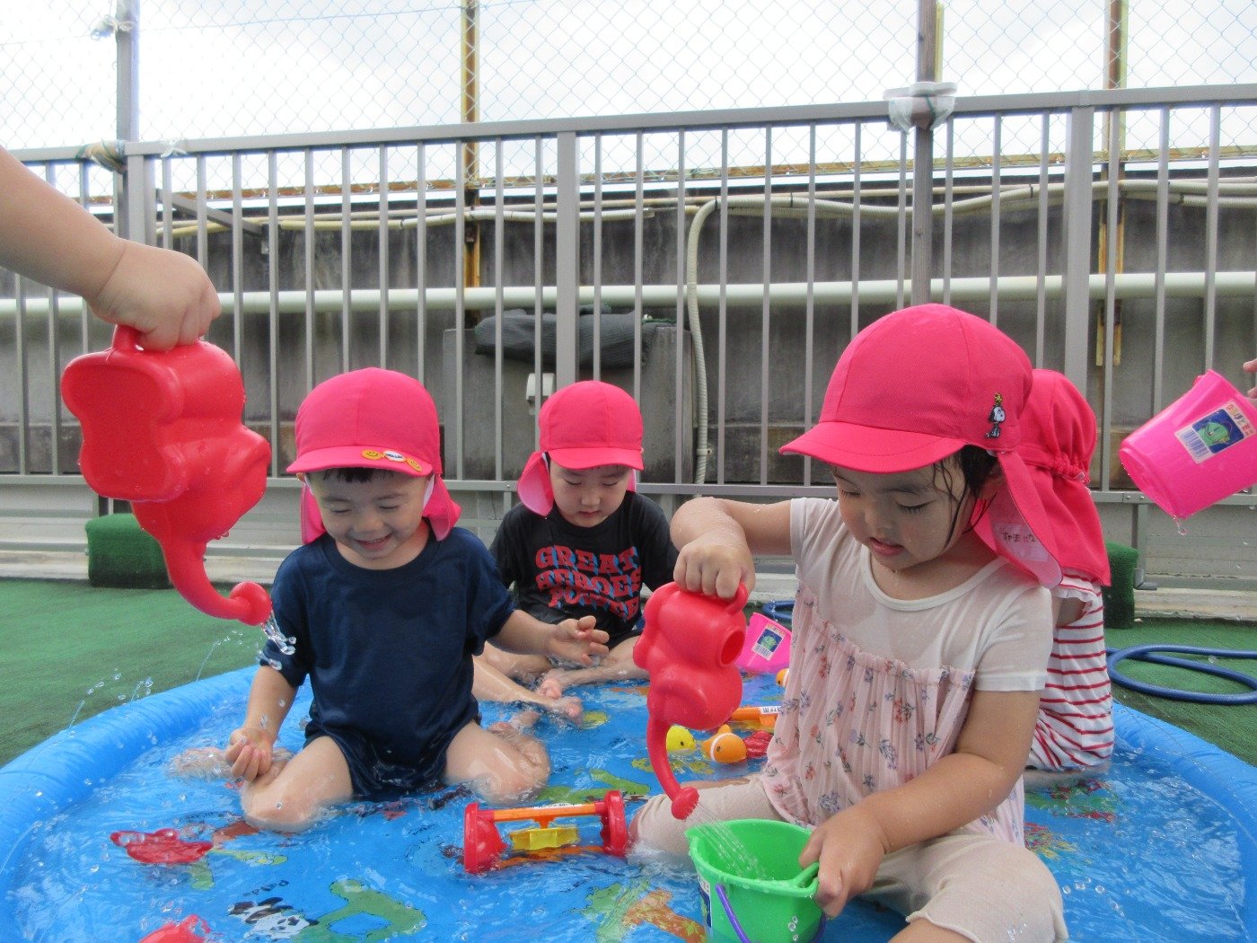 くま組さん ホームブログ 2024.07.30 今日はくま組さんみんなで水遊びをしました。 噴水マットから出るお水を見ると、噴水を両手で挟んでみたり自ら噴水に体を寄せてひんやりした感触を楽しんだり。 魚の水鉄砲でお水を遠くまで飛ばそうと一生懸命な姿が見られたり、ジョウロで水を流し風車が回るのをじ~っと試したり。 水しぶきにも負けないくらい、きらきらとした笑顔がたくさん見られましたよ😊