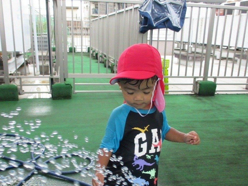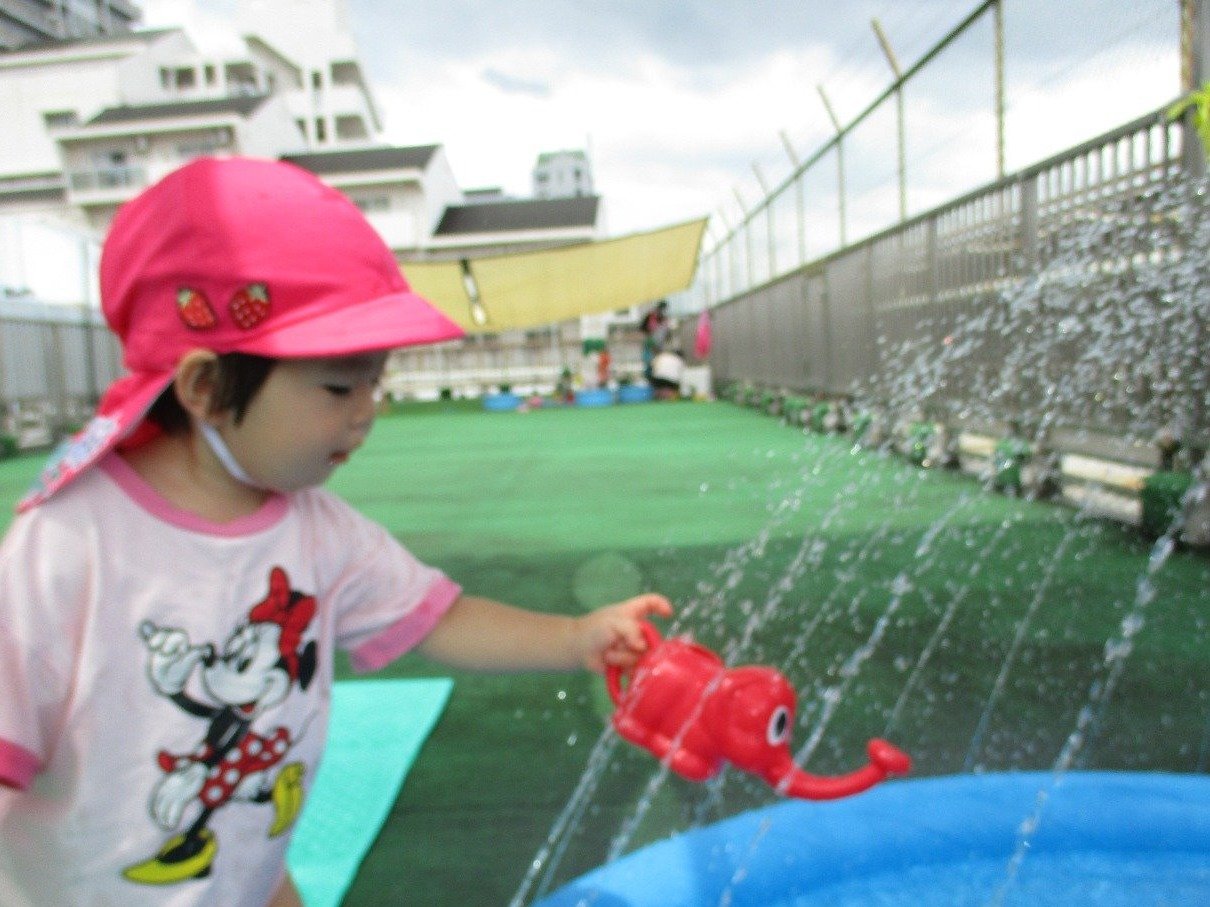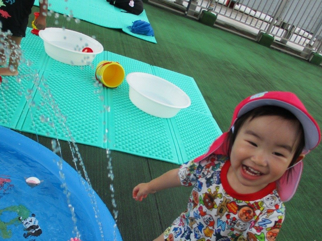 保育者が水しぶきを調節し、ちょっぴり強めにすると「ひゃひゃひゃ~」とまた大笑い😊