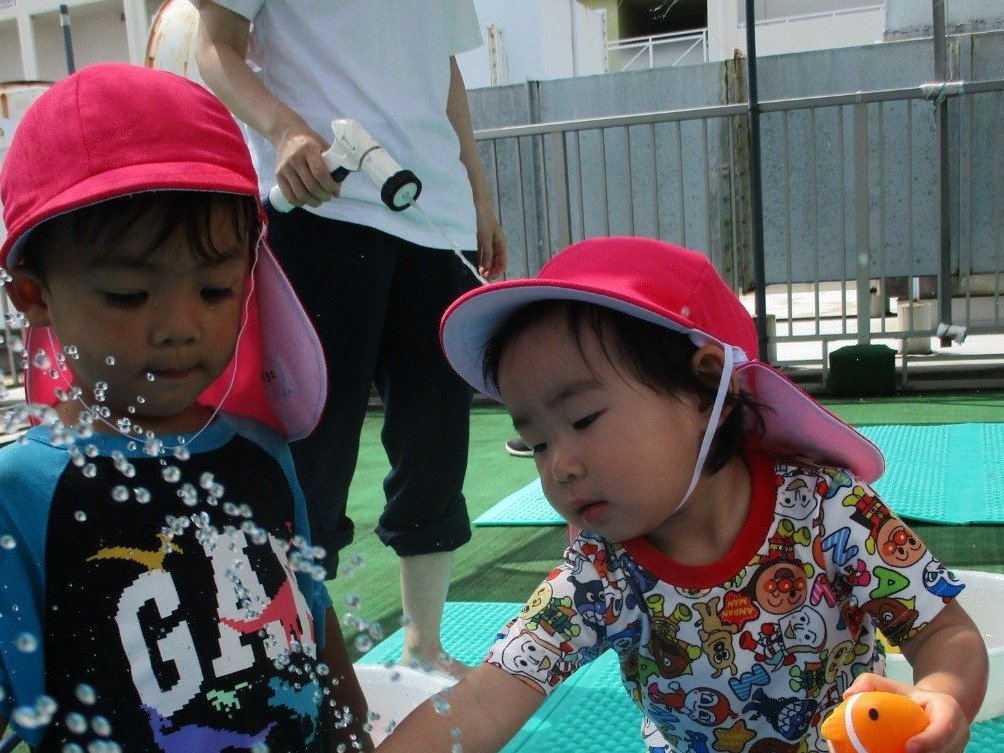 今日はうさぎ組さん&ひよこ組さんが水遊びをしました。