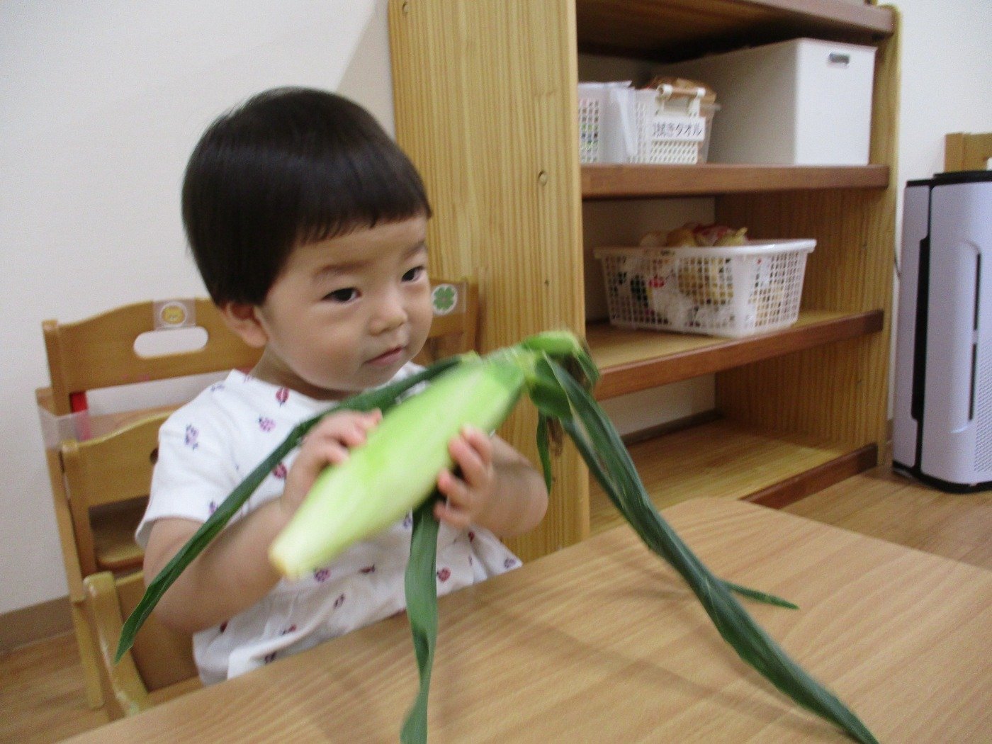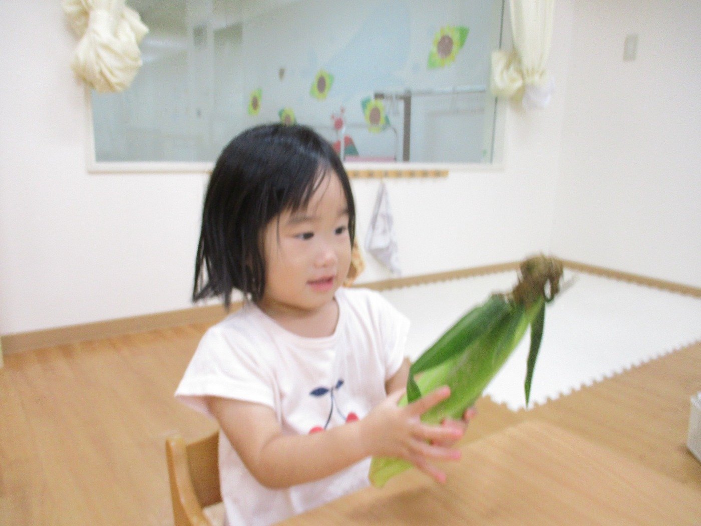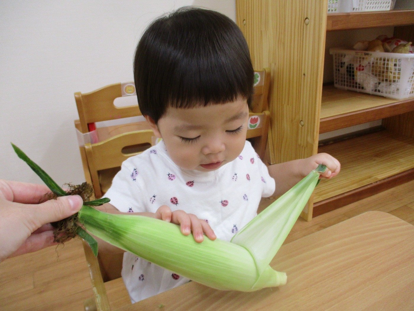 「うわぁ~」「とーもろこち」と指先でツンツンしたり、匂いをかいだり・・・