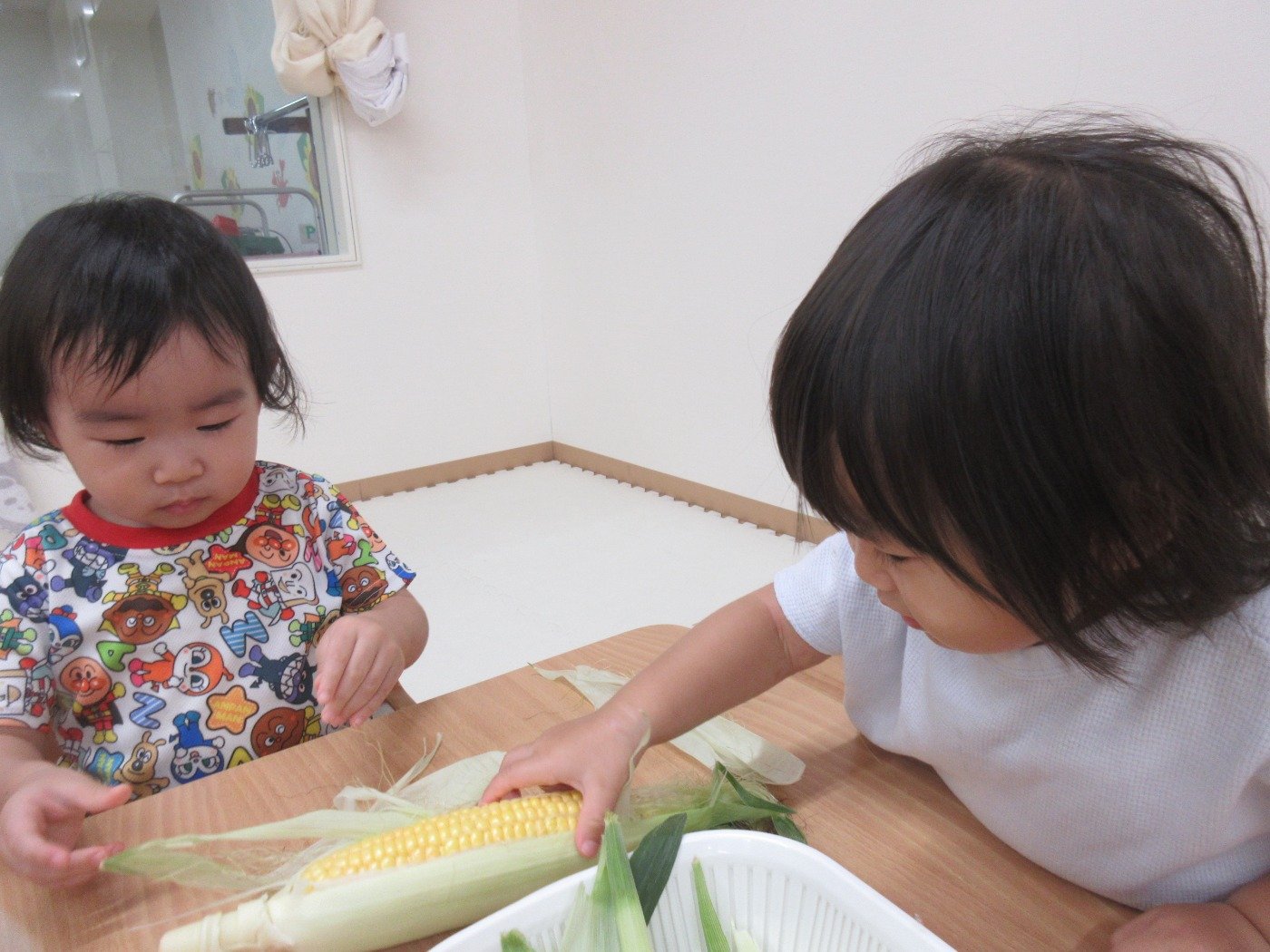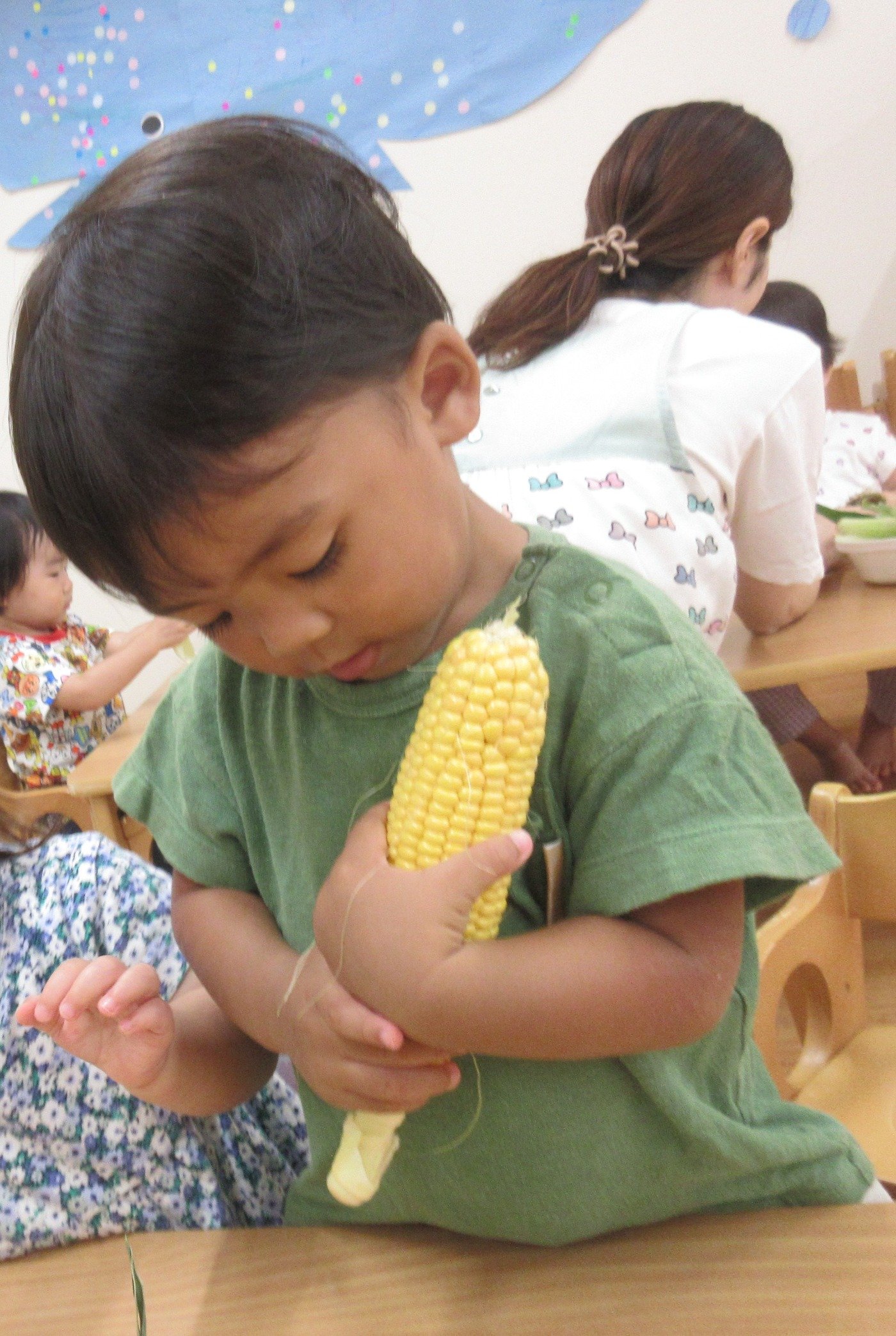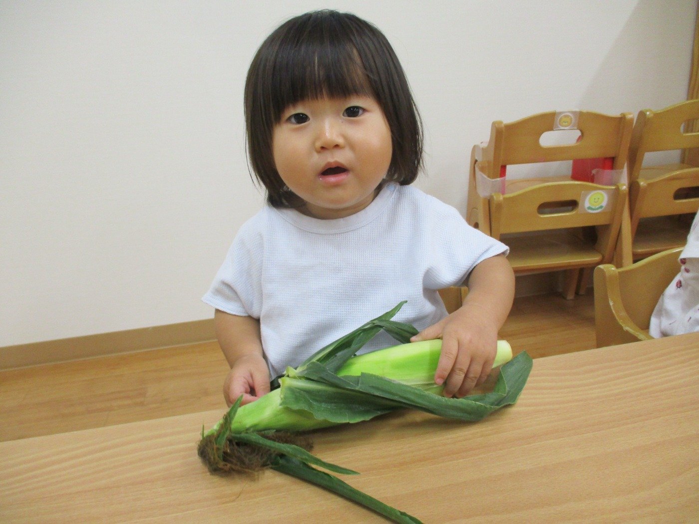 「うわぁ~」「とーもろこち」と指先でツンツンしたり、匂いをかいだり・・・