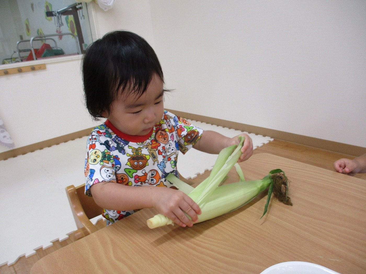 黄色の実の部分は見たことがあるけど、皮つきのとうもろこしを見たり触れたりする経験は、初めてという子どもが多いのではないでしょうか。