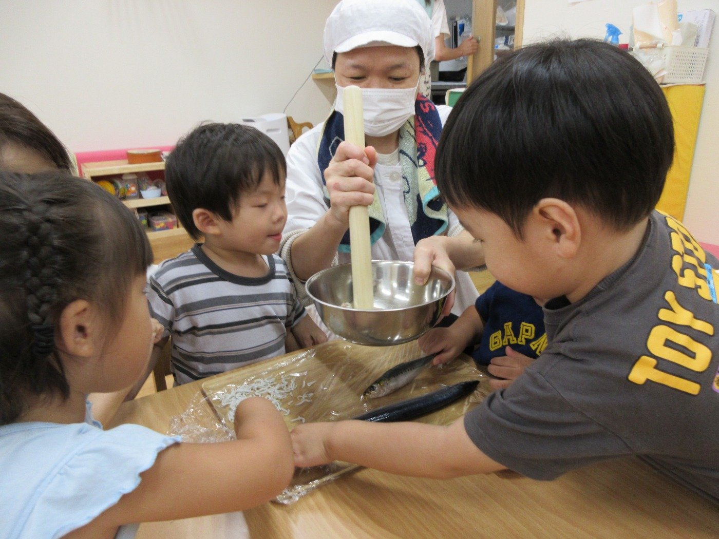 今日の給食に、つみれ汁が出るとあって朝からお調理の先生が子ども達の為にお魚セットを作ってくれました。