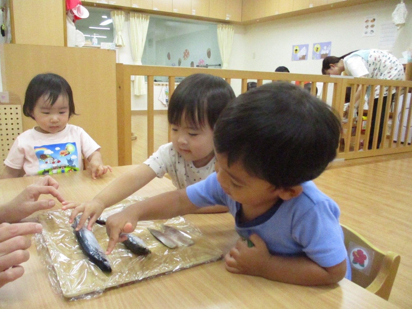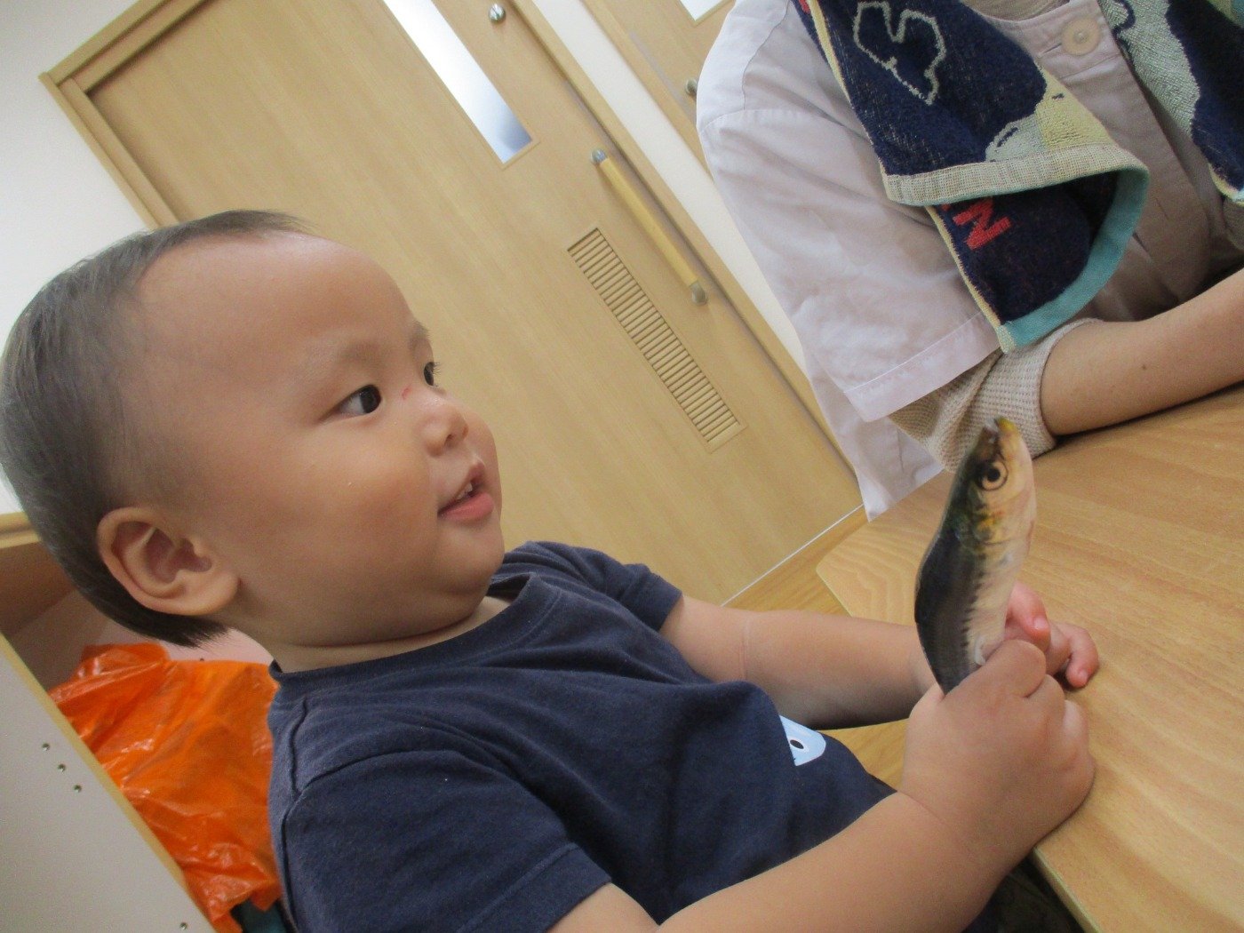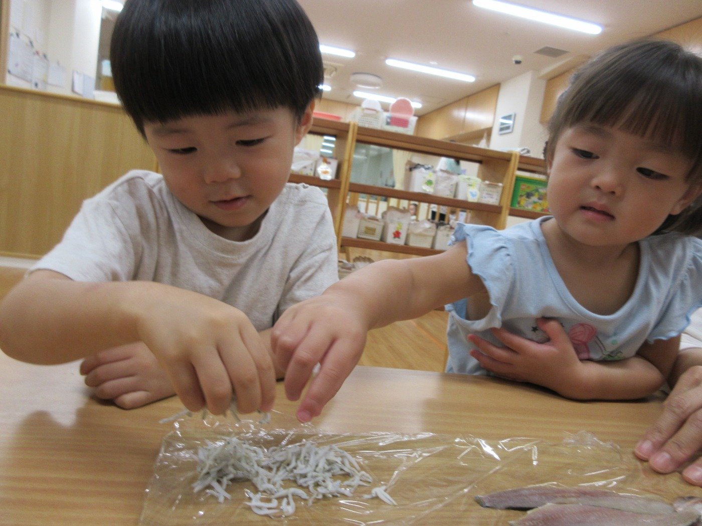 「おめめがあるよ!」「しらす?」「ちっちゃいね」など、感じたことをつぶやきながら