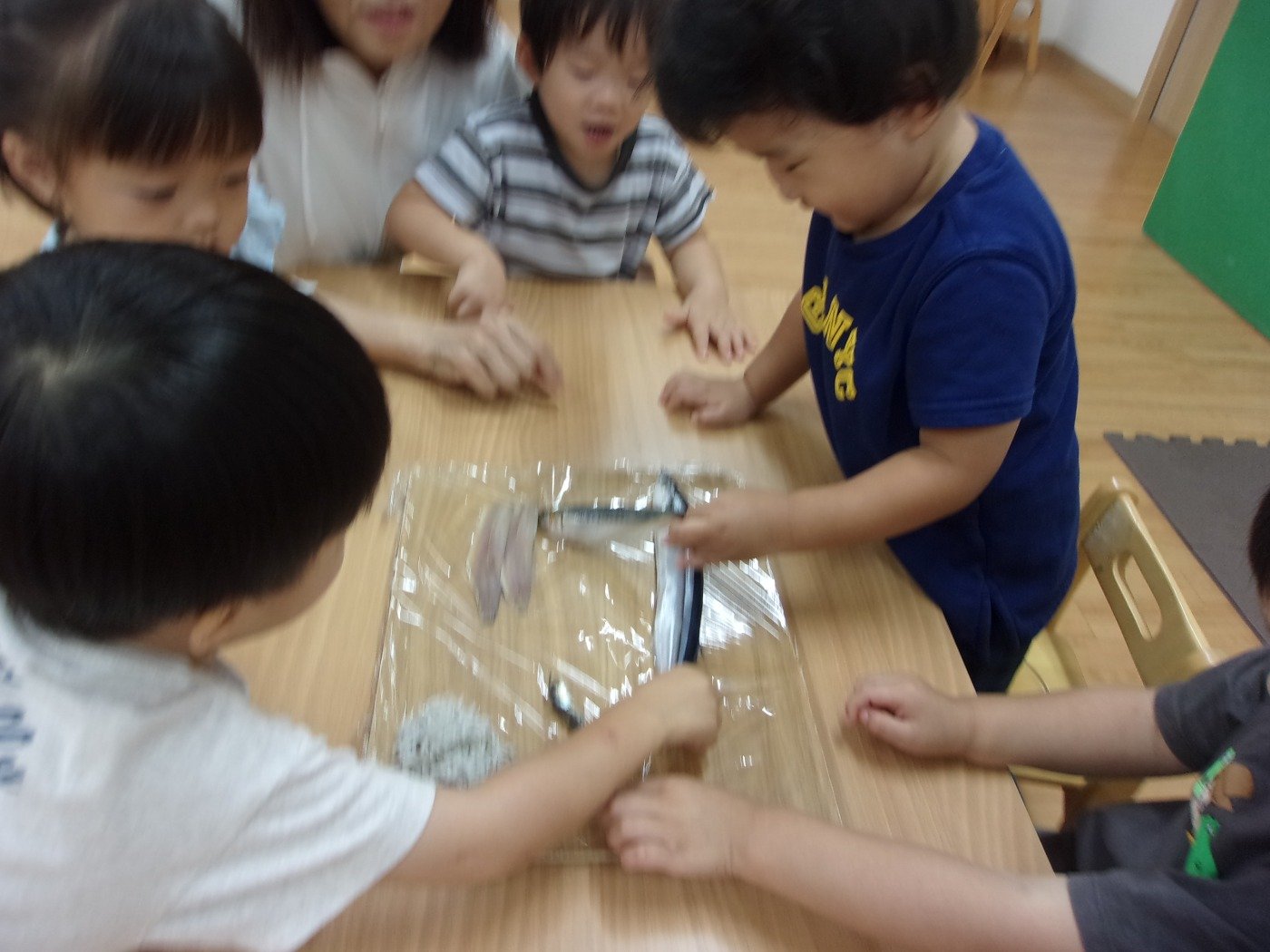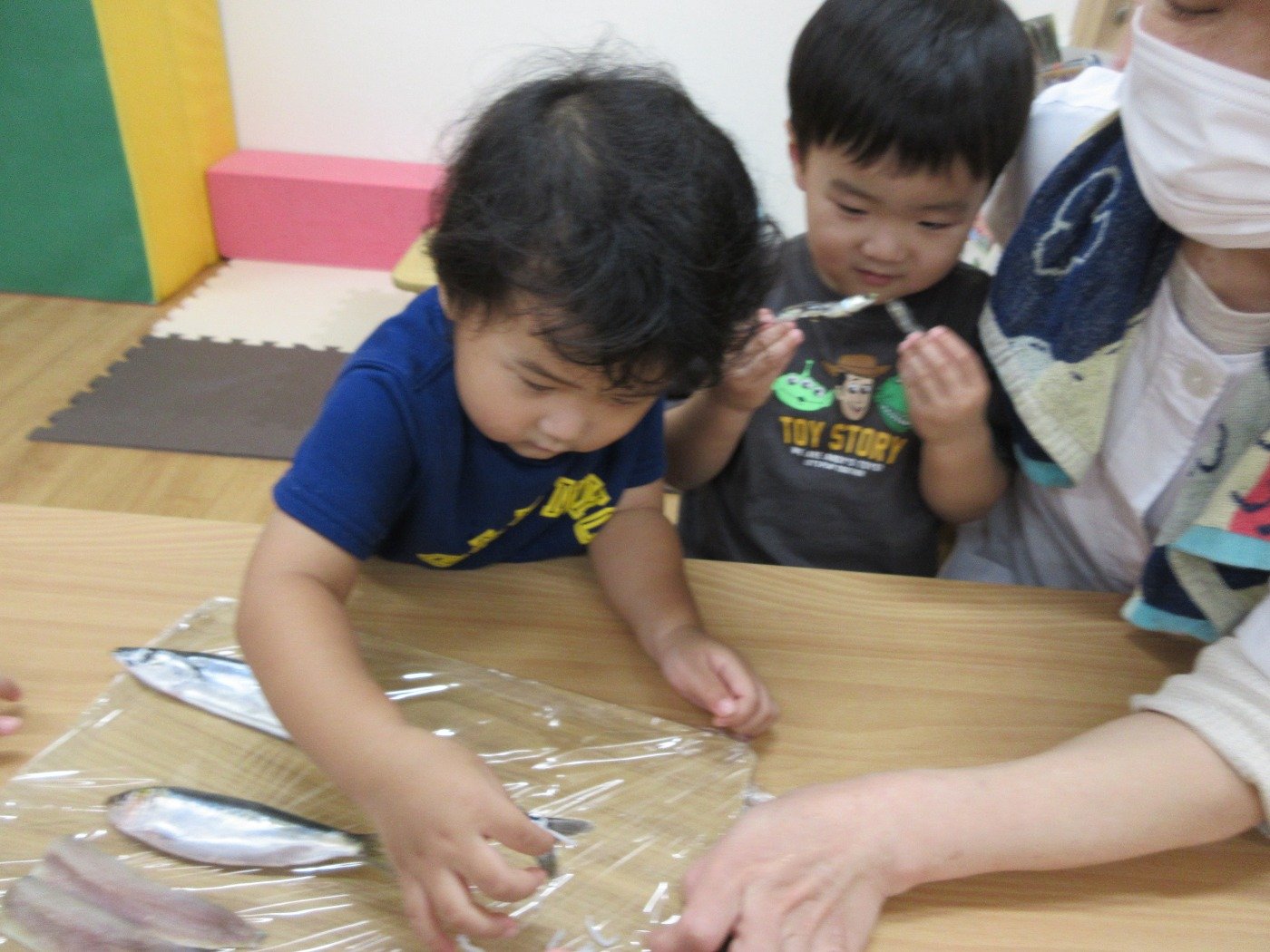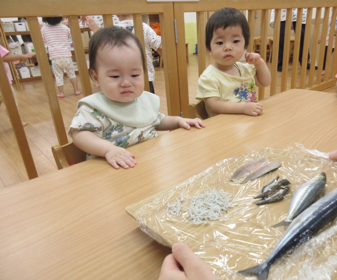 「おめめがあるよ!」「しらす?」「ちっちゃいね」など、感じたことをつぶやきながら