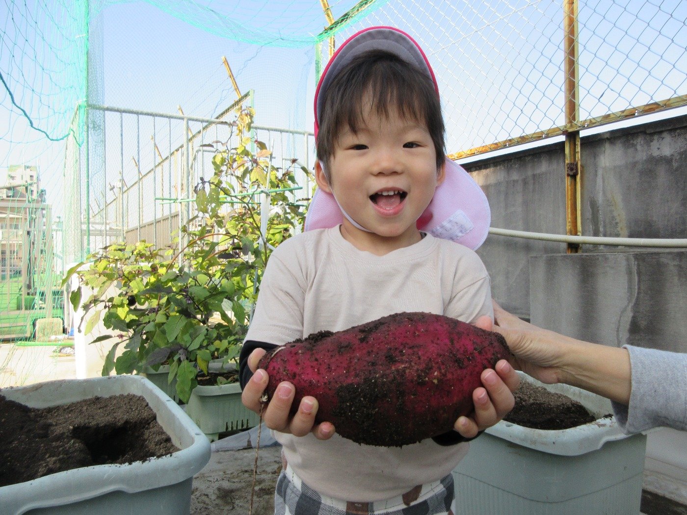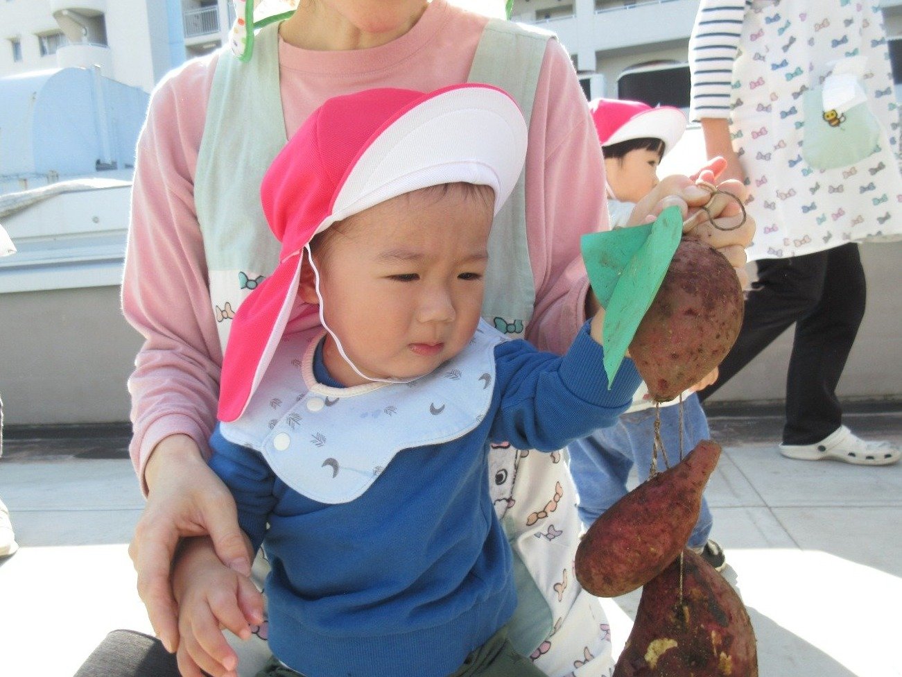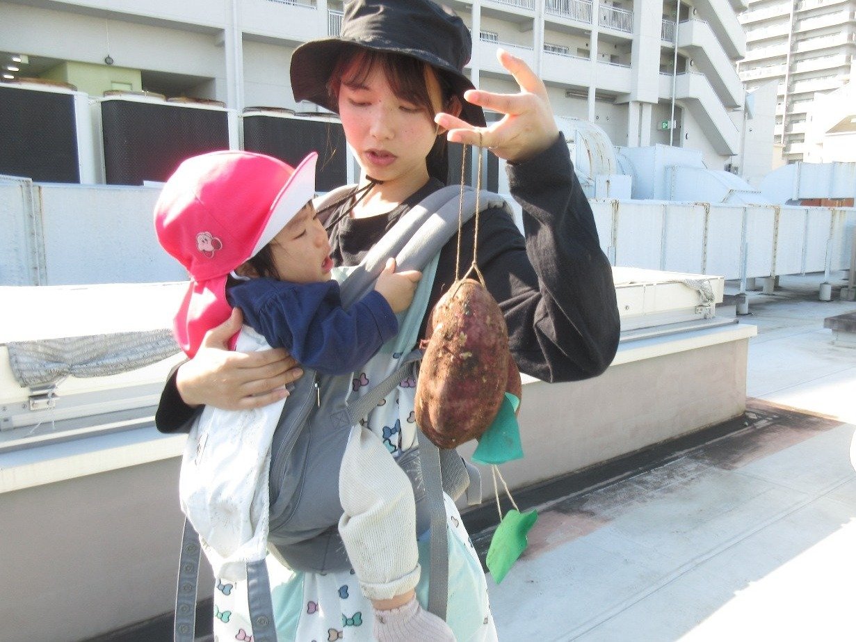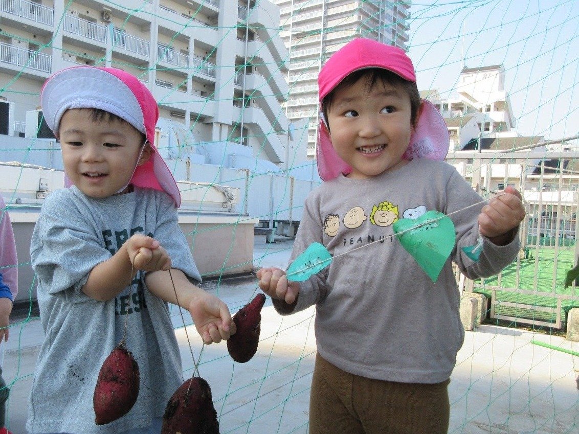 くま組 ひよこ組 ホームブログ 2024.11.15 清々しいお天気!昨日、くま組さんとひよこ組さんがお芋ほりに出かけました。 くま組さんはお友だちとペアになってお芋ほりをしましたよ! 「んんっ・・おもたい」「よいしょっ!」とちょっぴり苦戦しながらも力いっぱいに紐をひっぱり、ずるずる~と土からお顔をだしたお芋をみて 「おおぉ~」と歓声をあげながらお芋にタッチする子どもたち ひよこ組さんもお芋ほりにチャレンジしたよ🎵 掘ったお芋は、来週のおやつでクッキングしようね😊