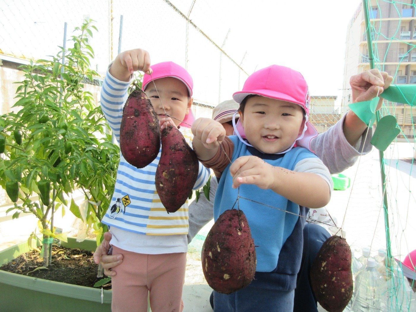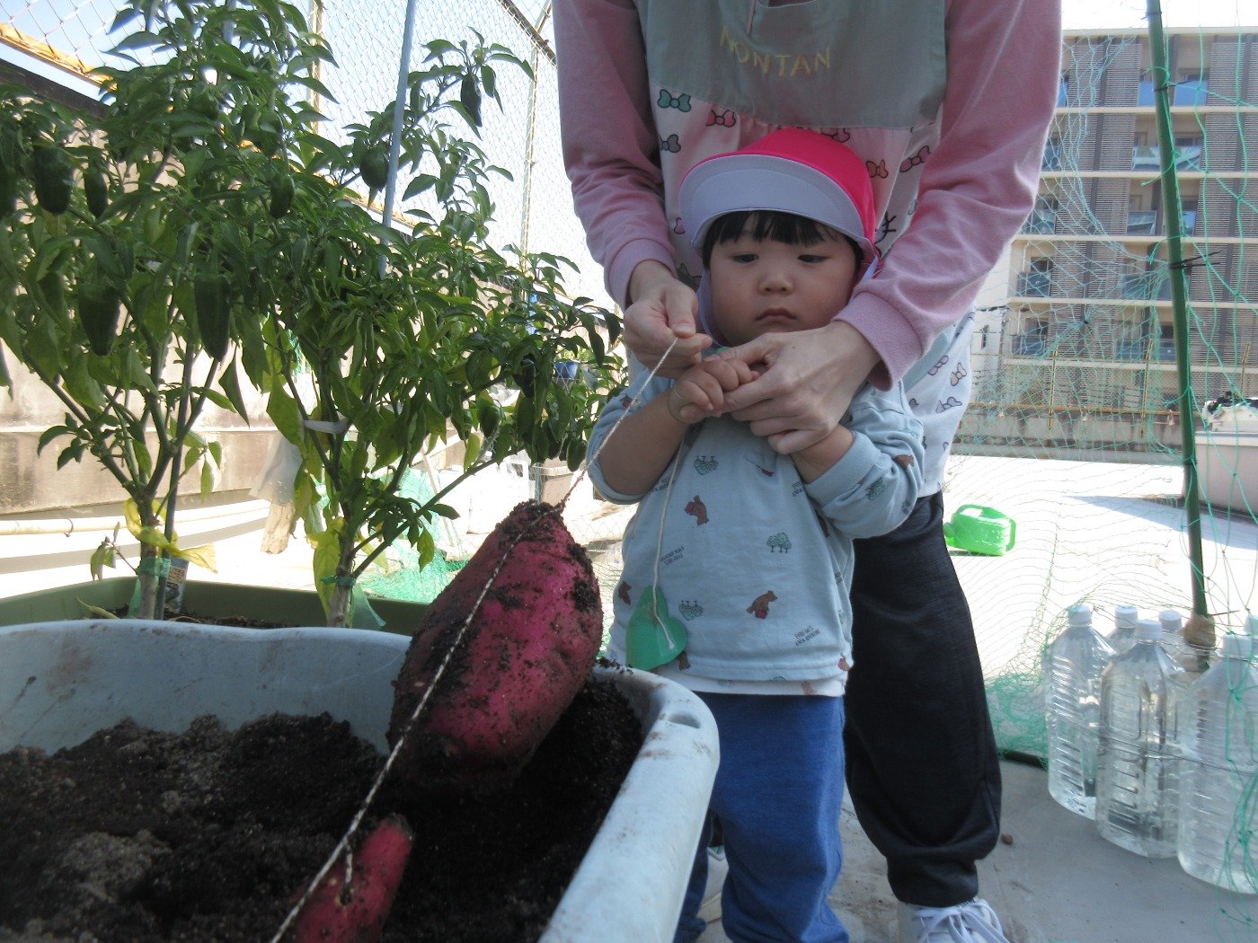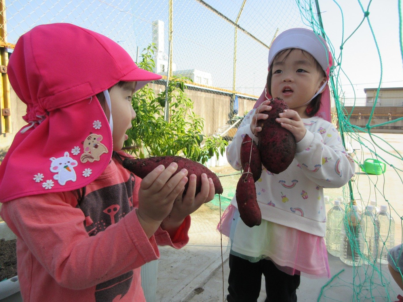 くま組 ひよこ組 ホームブログ 2024.11.15 清々しいお天気!昨日、くま組さんとひよこ組さんがお芋ほりに出かけました。 くま組さんはお友だちとペアになってお芋ほりをしましたよ! 「んんっ・・おもたい」「よいしょっ!」とちょっぴり苦戦しながらも力いっぱいに紐をひっぱり、ずるずる~と土からお顔をだしたお芋をみて 「おおぉ~」と歓声をあげながらお芋にタッチする子どもたち ひよこ組さんもお芋ほりにチャレンジしたよ🎵 掘ったお芋は、来週のおやつでクッキングしようね😊