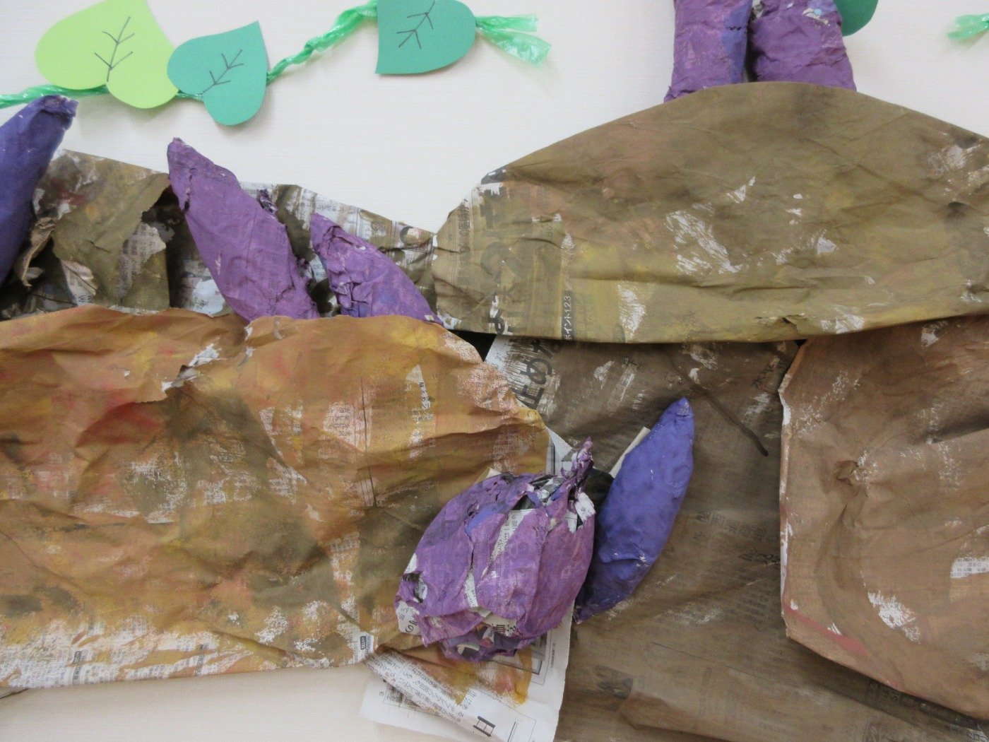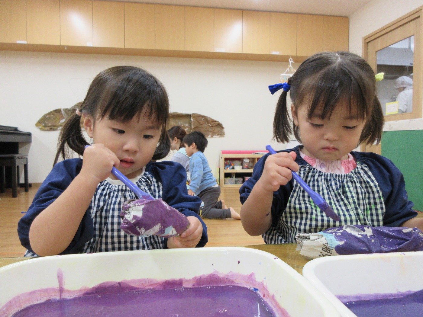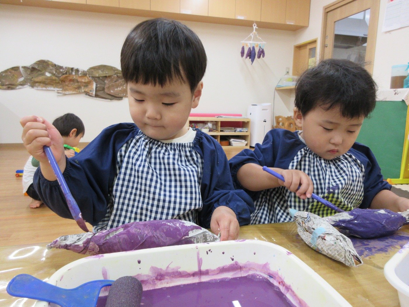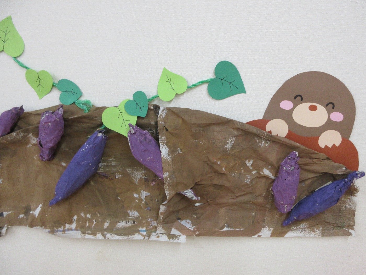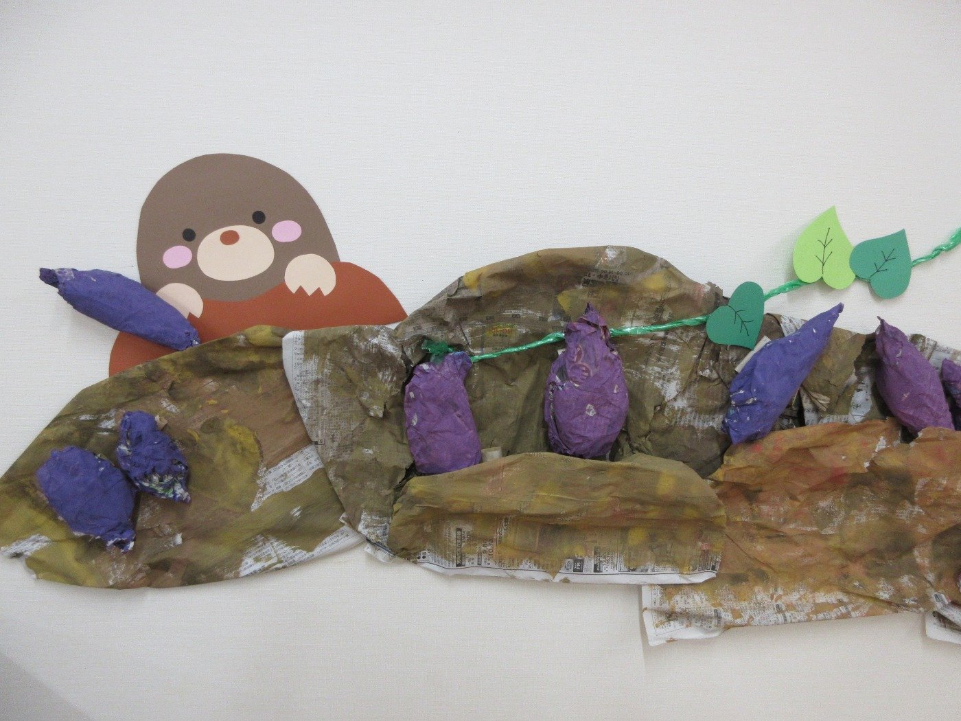 お芋畑ができたよ! ホームブログ 2024.11.15 昨日お芋ほりを体験したくま組さん。 「大きかったね~」「うんとこしょ~したね」と楽しかった経験をお友だちや保育者と話をしながら、子どもたちオリジナルなお芋の制作をしました。 つやつやなお芋や、リアルなお芋に近いゴロゴロとしたお芋。 た~くさんのお芋ができました😊 モグラさんも、おいしそうなお芋を見つけたね!
