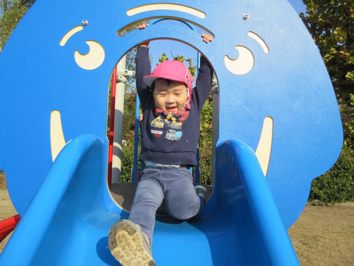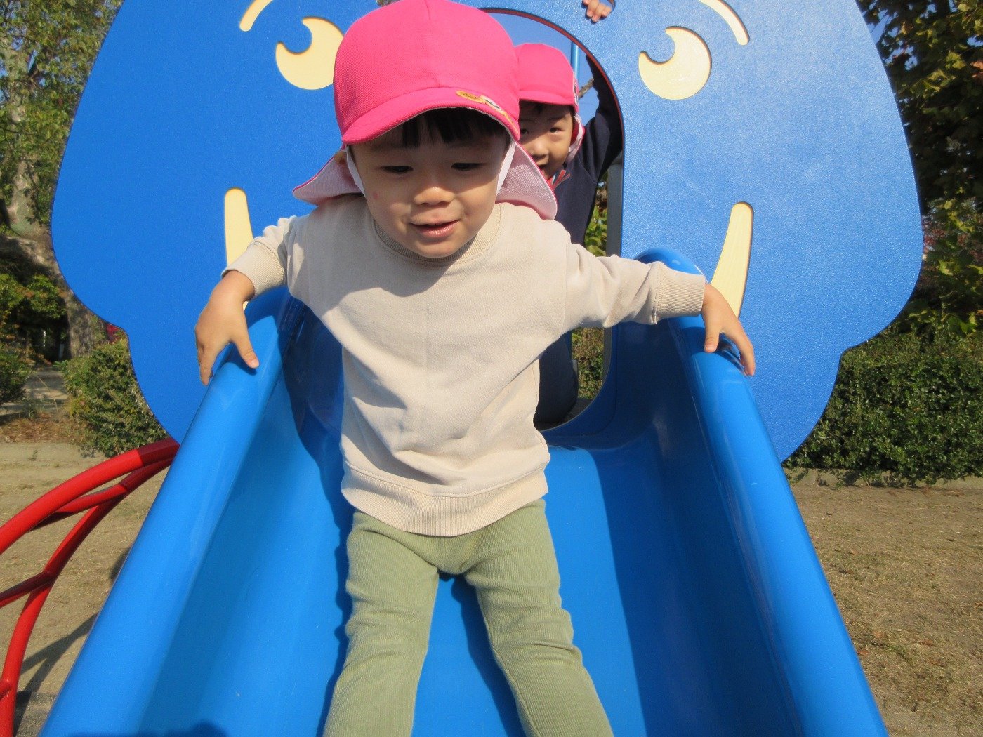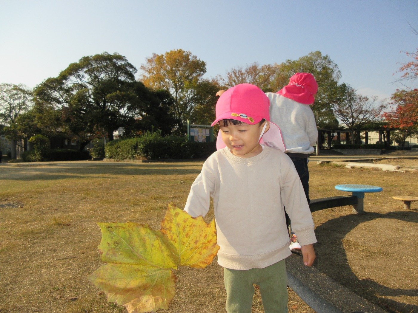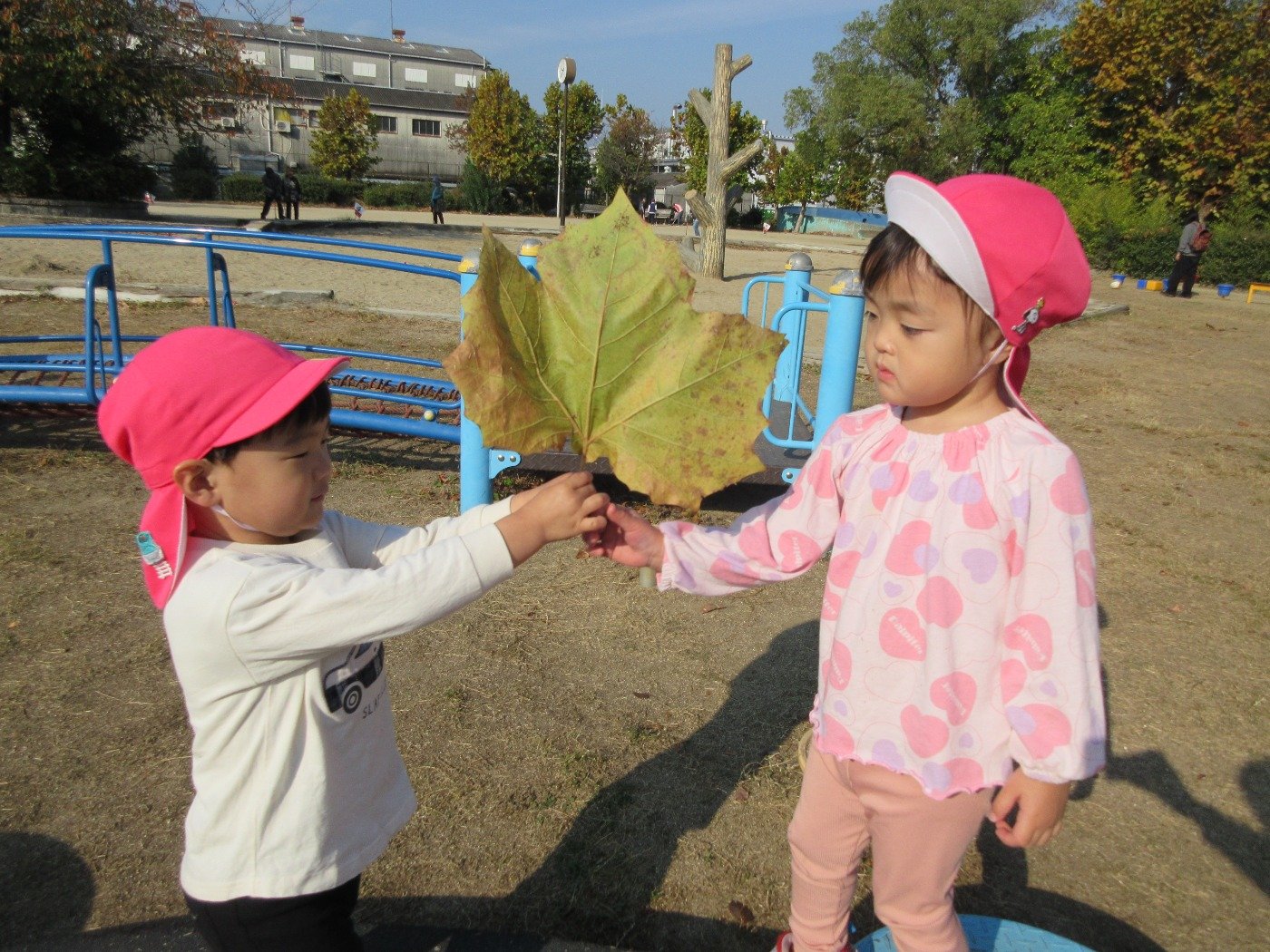 大きな木も周りにあるので、落ち葉を拾ってはお顔の前にあて「みて~!大きいよ」とお友だち同士見せあいっこして笑い合ったり。