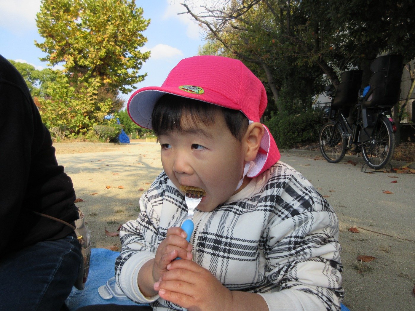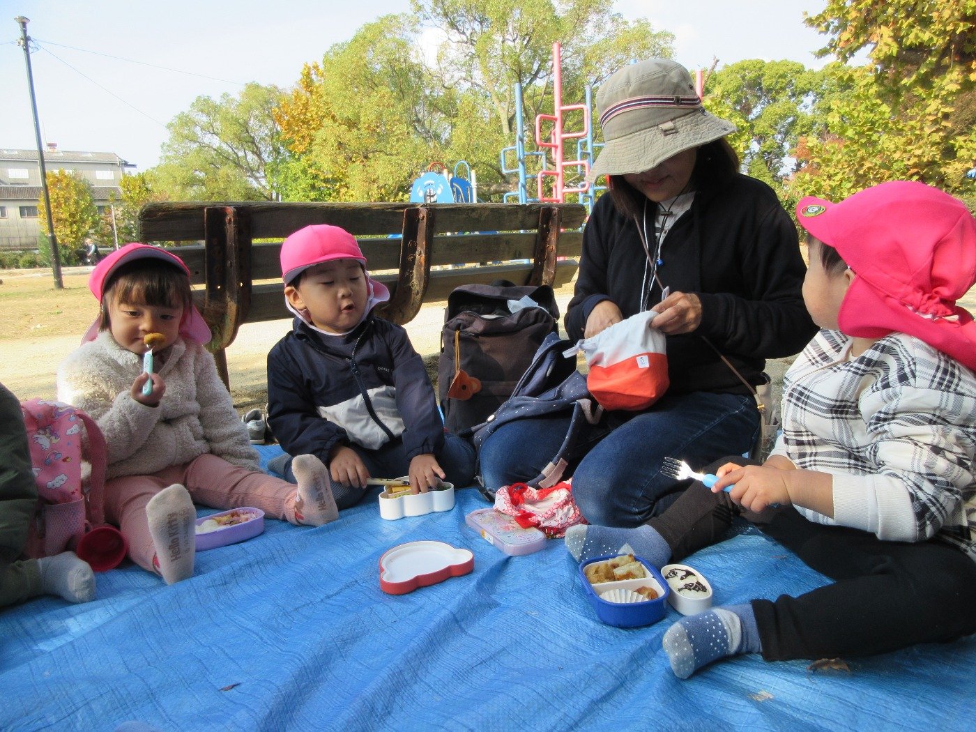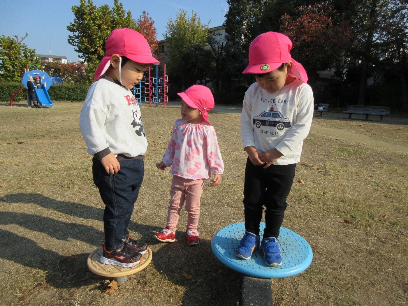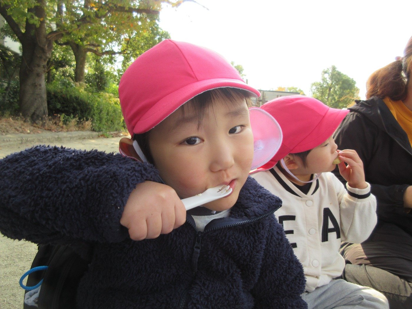 大きな木も周りにあるので、落ち葉を拾ってはお顔の前にあて「みて~!大きいよ」とお友だち同士見せあいっこして笑い合ったり。