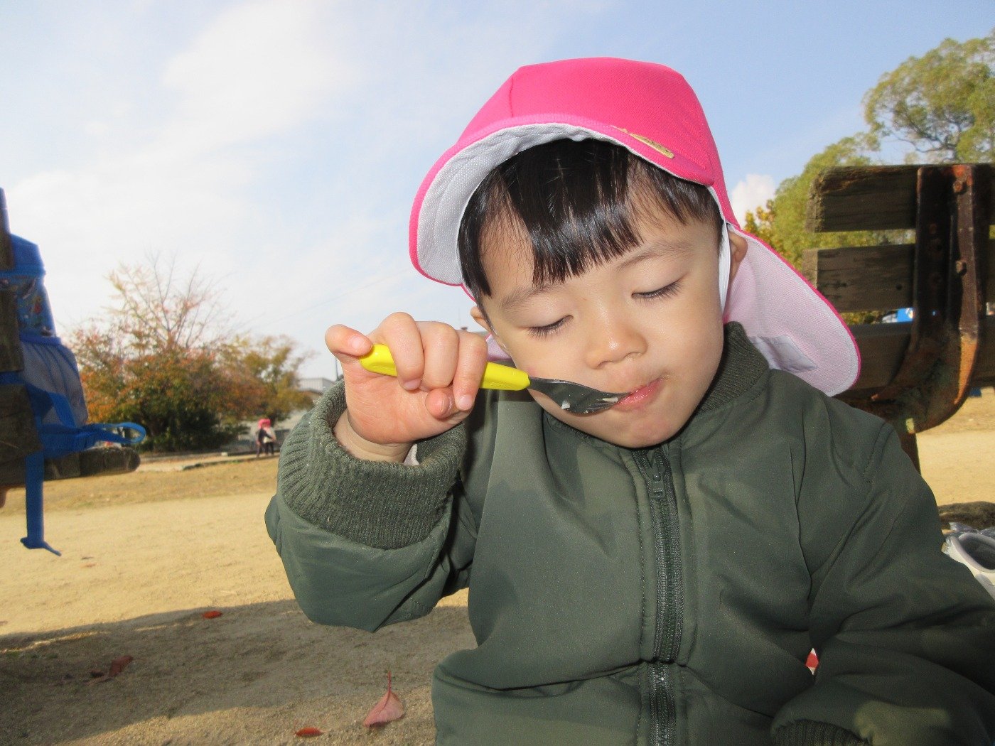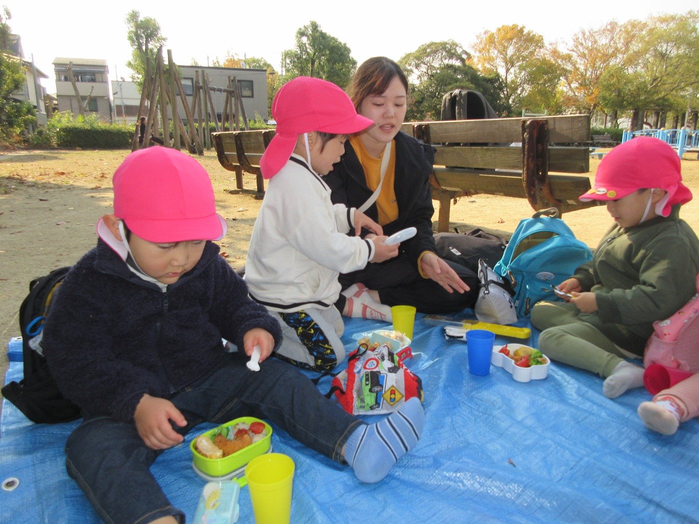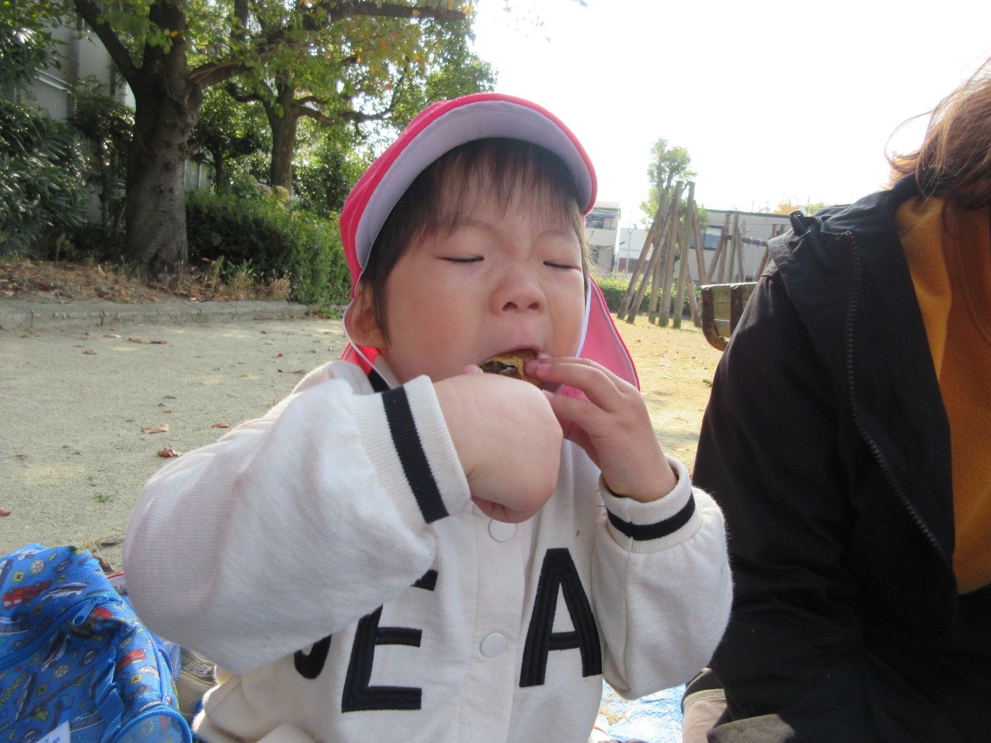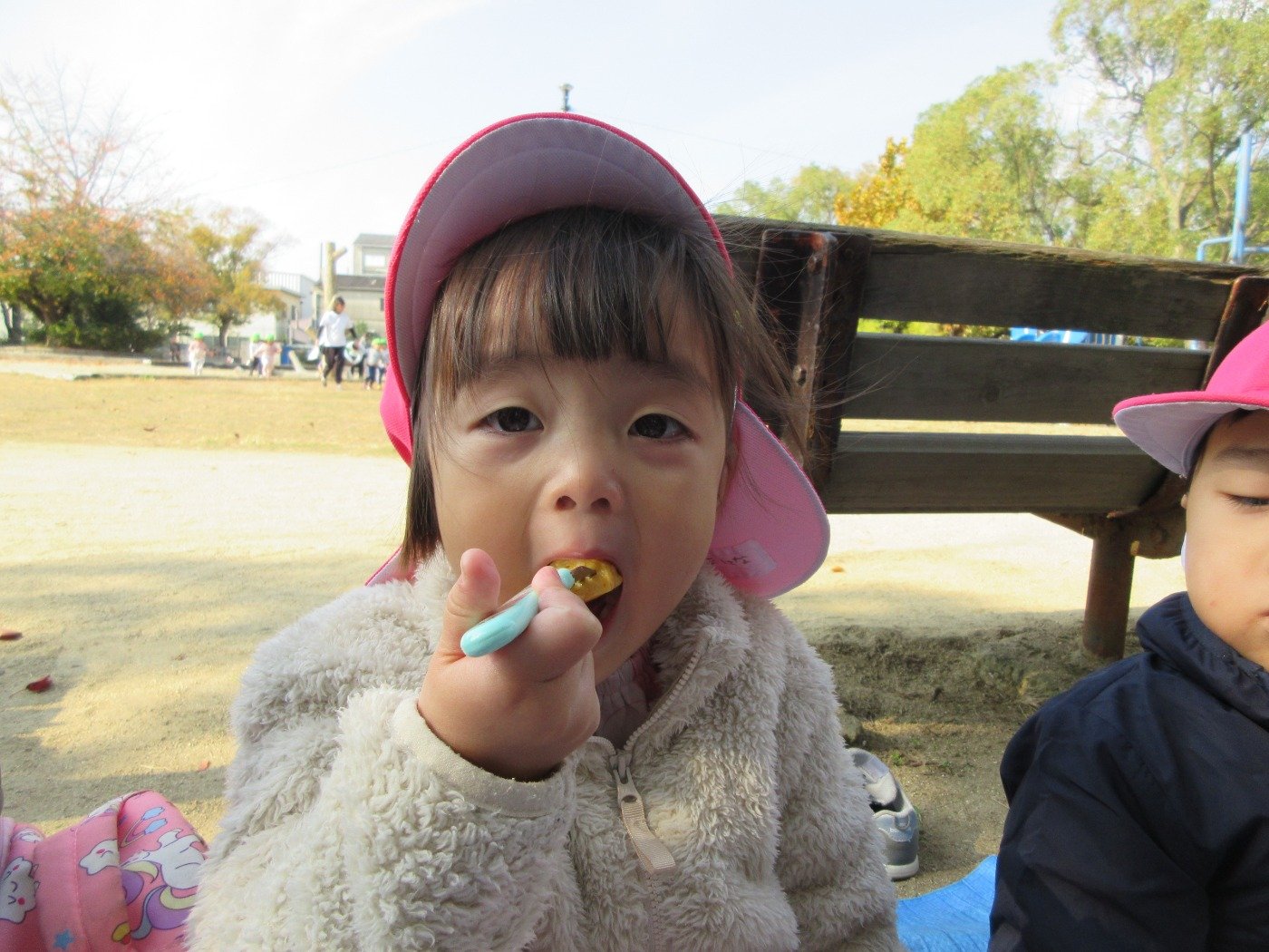 大きな木も周りにあるので、落ち葉を拾ってはお顔の前にあて「みて~!大きいよ」とお友だち同士見せあいっこして笑い合ったり。