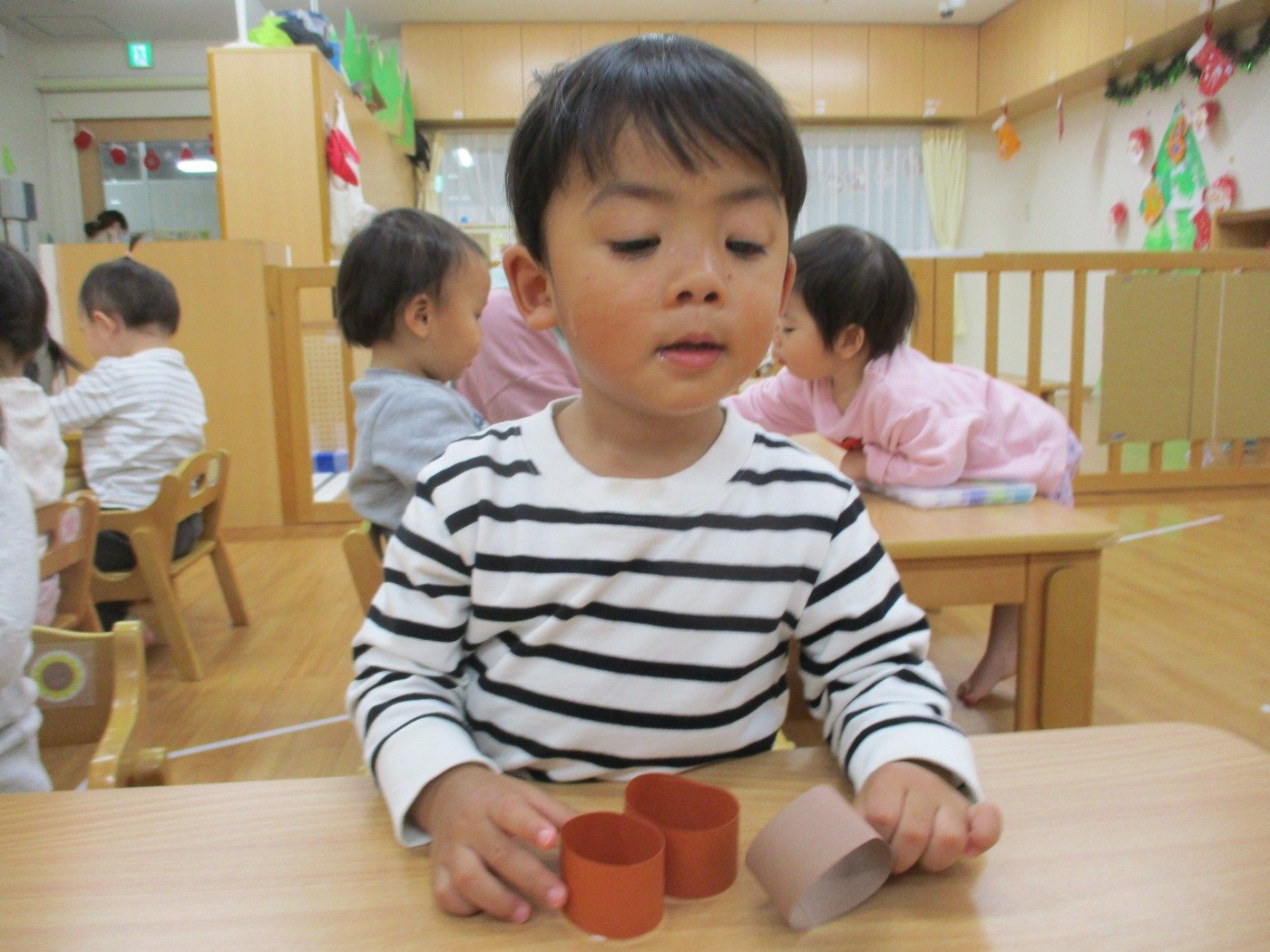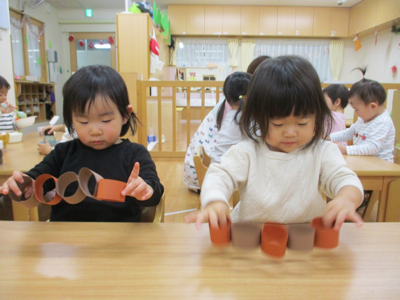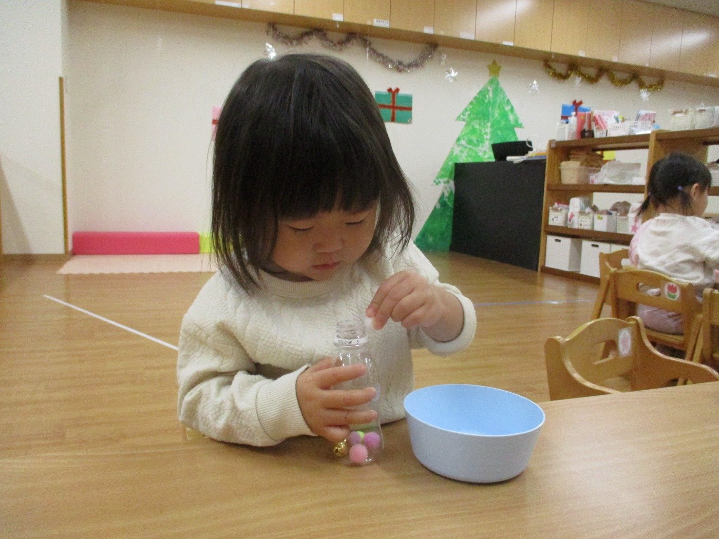 輪つなぎにチャレンジしトナカイさんを作ったり、楽器作りも楽しみました。指先をしっかり使って、ぼんてんを一つずつつまみ、そ~っとそ~っと慎重に入れ物に入れる姿、思わずこちらも息をのむかのように見守りました。小さな鈴をつまみシャンシャンシャン~🎵と耳元で鈴の音を確かめにっこり笑う姿も可愛いかったですよ。