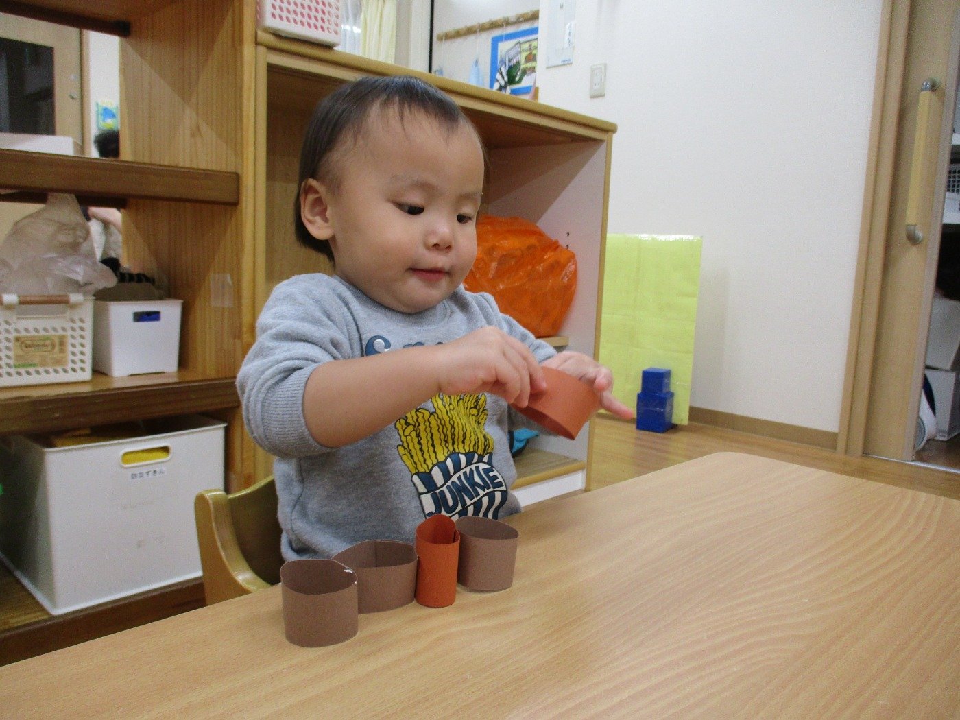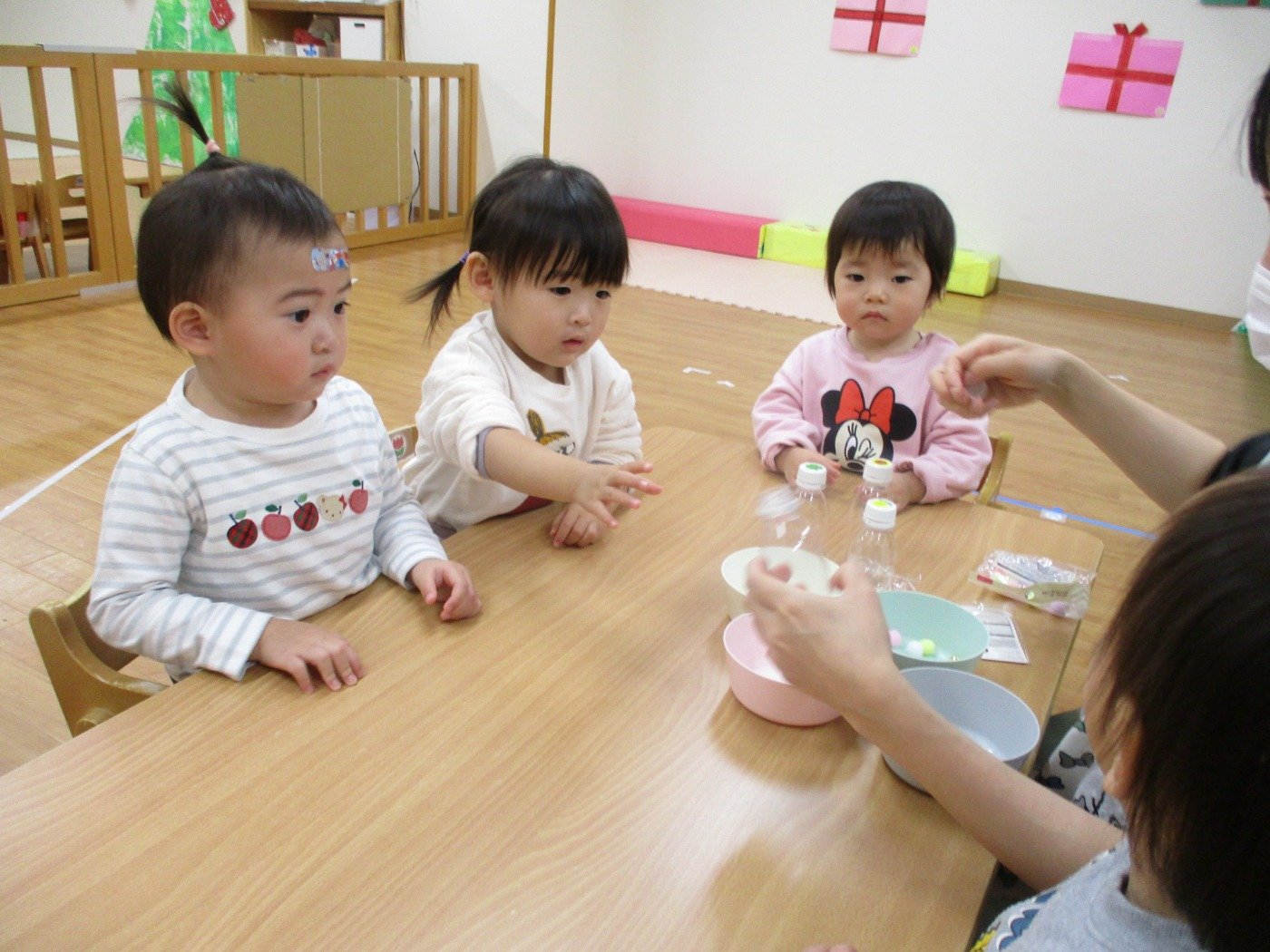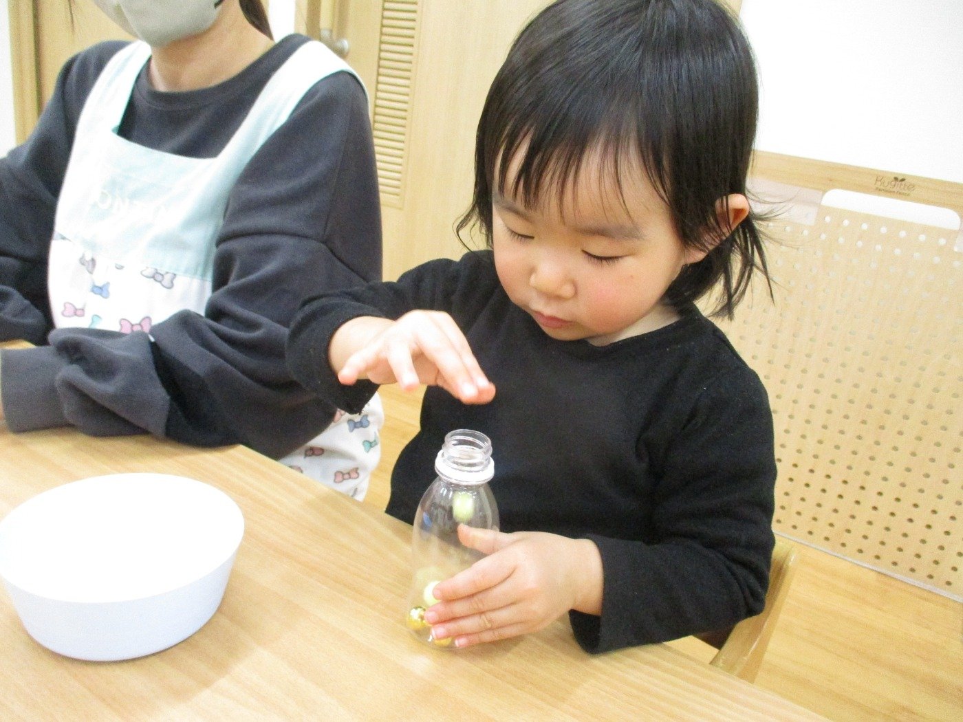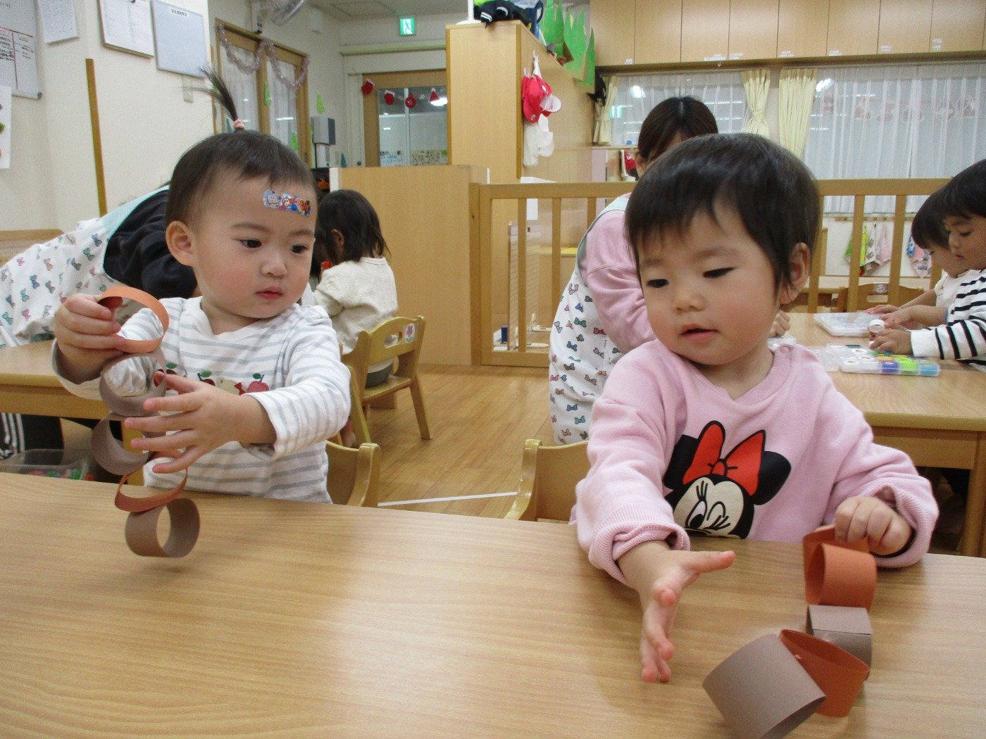 輪つなぎにチャレンジしトナカイさんを作ったり、楽器作りも楽しみました。指先をしっかり使って、ぼんてんを一つずつつまみ、そ~っとそ~っと慎重に入れ物に入れる姿、思わずこちらも息をのむかのように見守りました。小さな鈴をつまみシャンシャンシャン~🎵と耳元で鈴の音を確かめにっこり笑う姿も可愛いかったですよ。