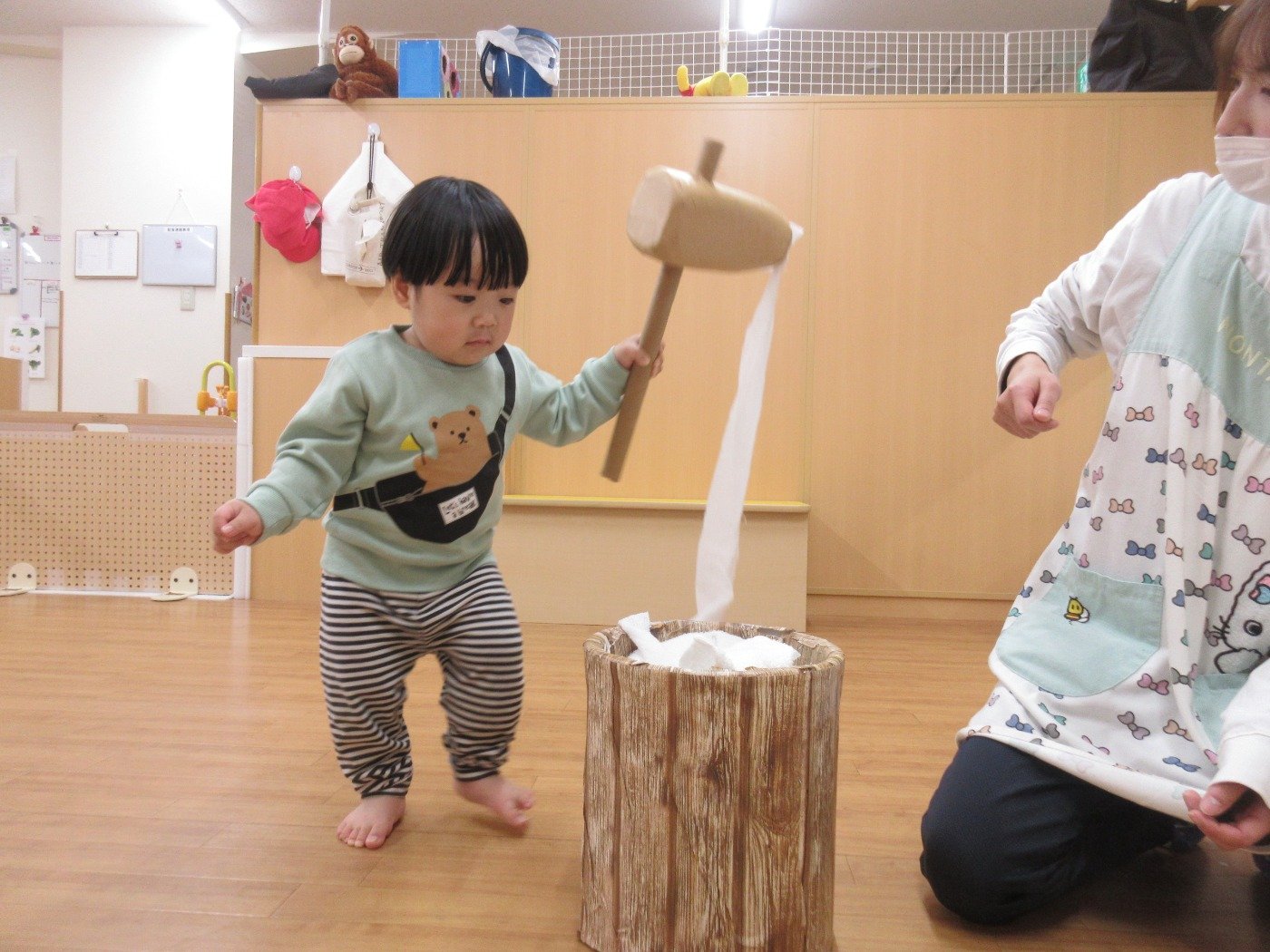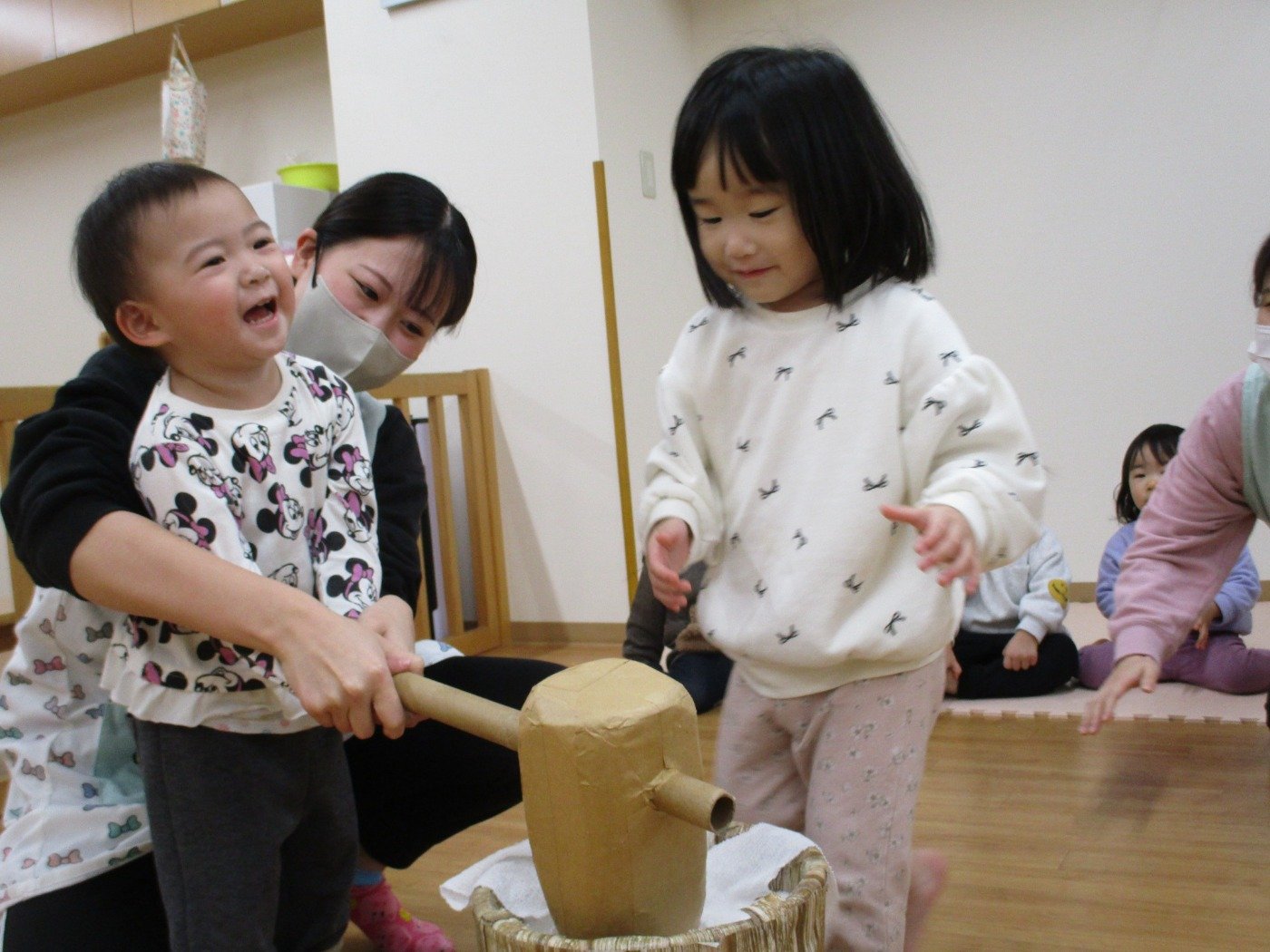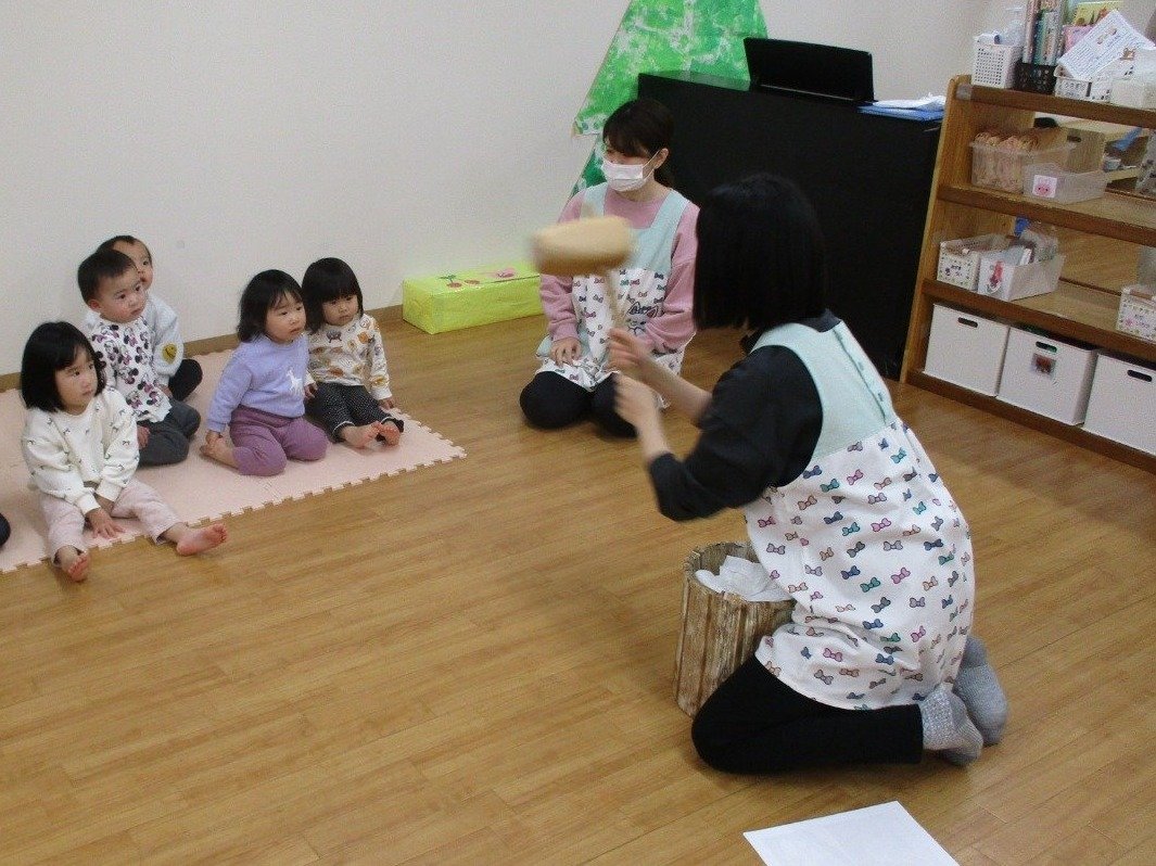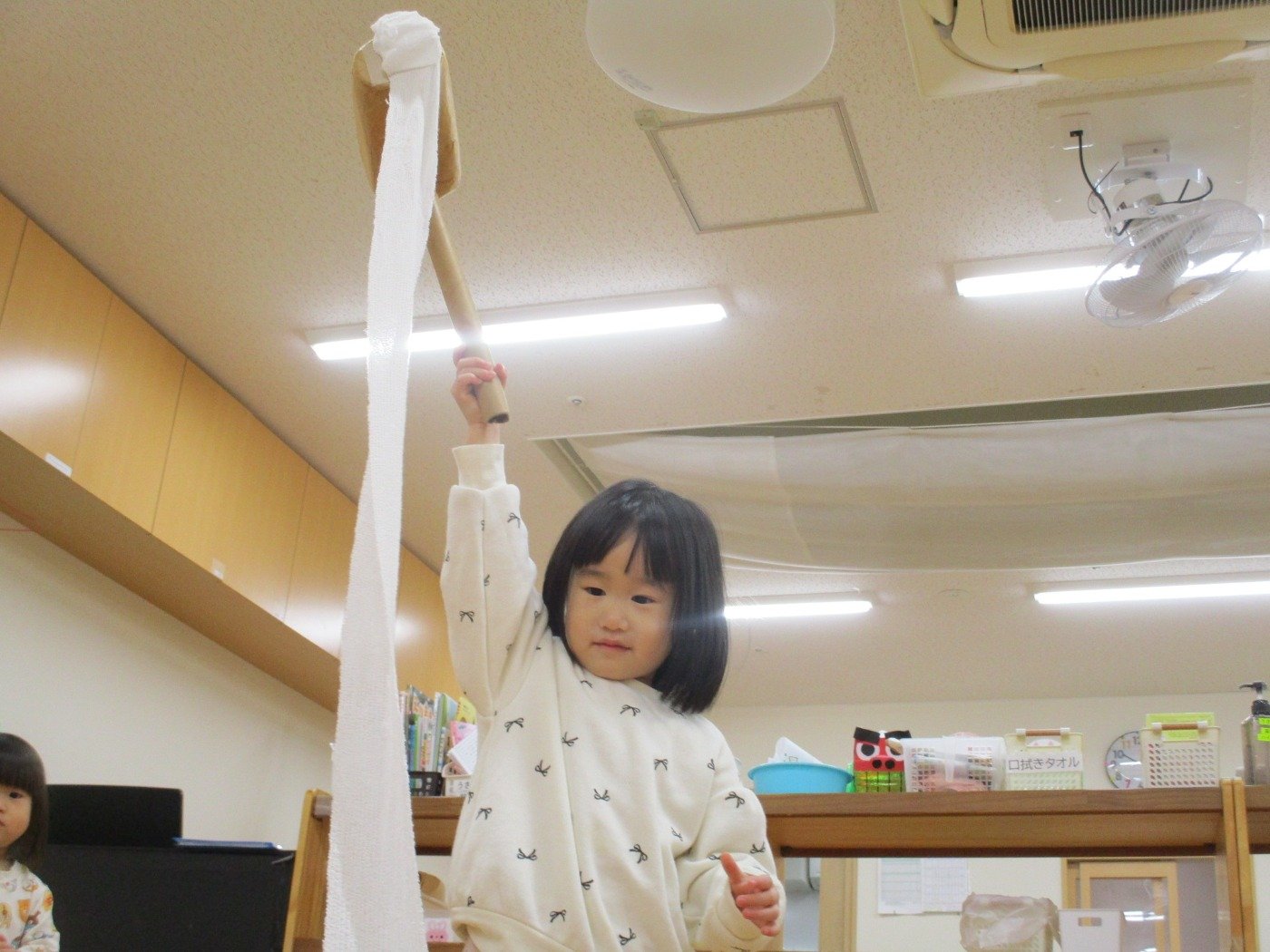 おもちがのびる様子が面白くなり、「びろ~ん!」「うわ~」なんて言いながら楽しむ姿がみられました。 途中、子どもたちの中から自然にあいのてが出るくらい盛り上がりましたよ😊