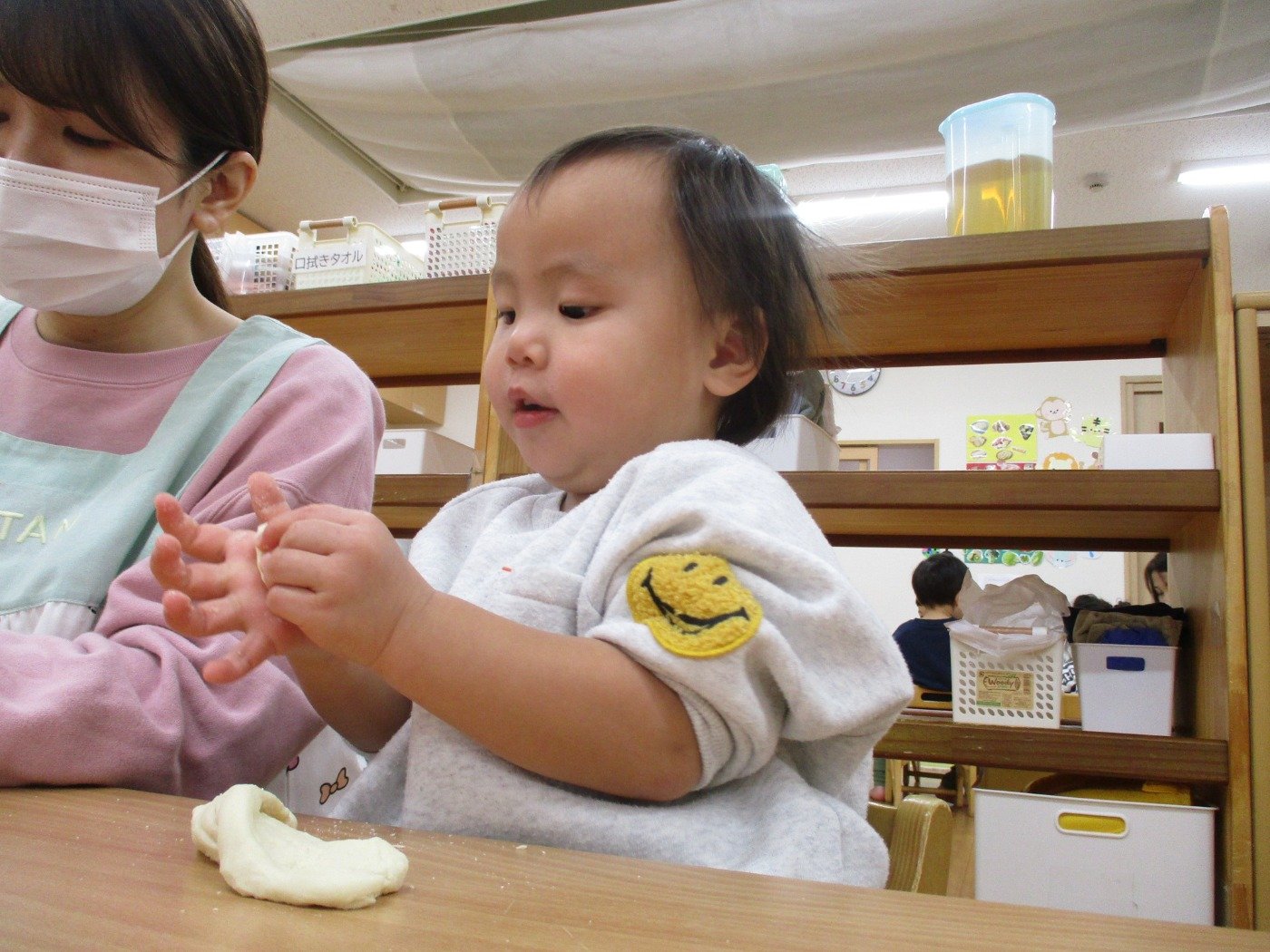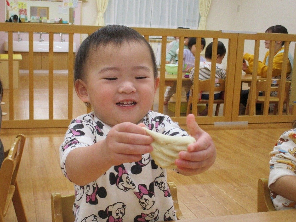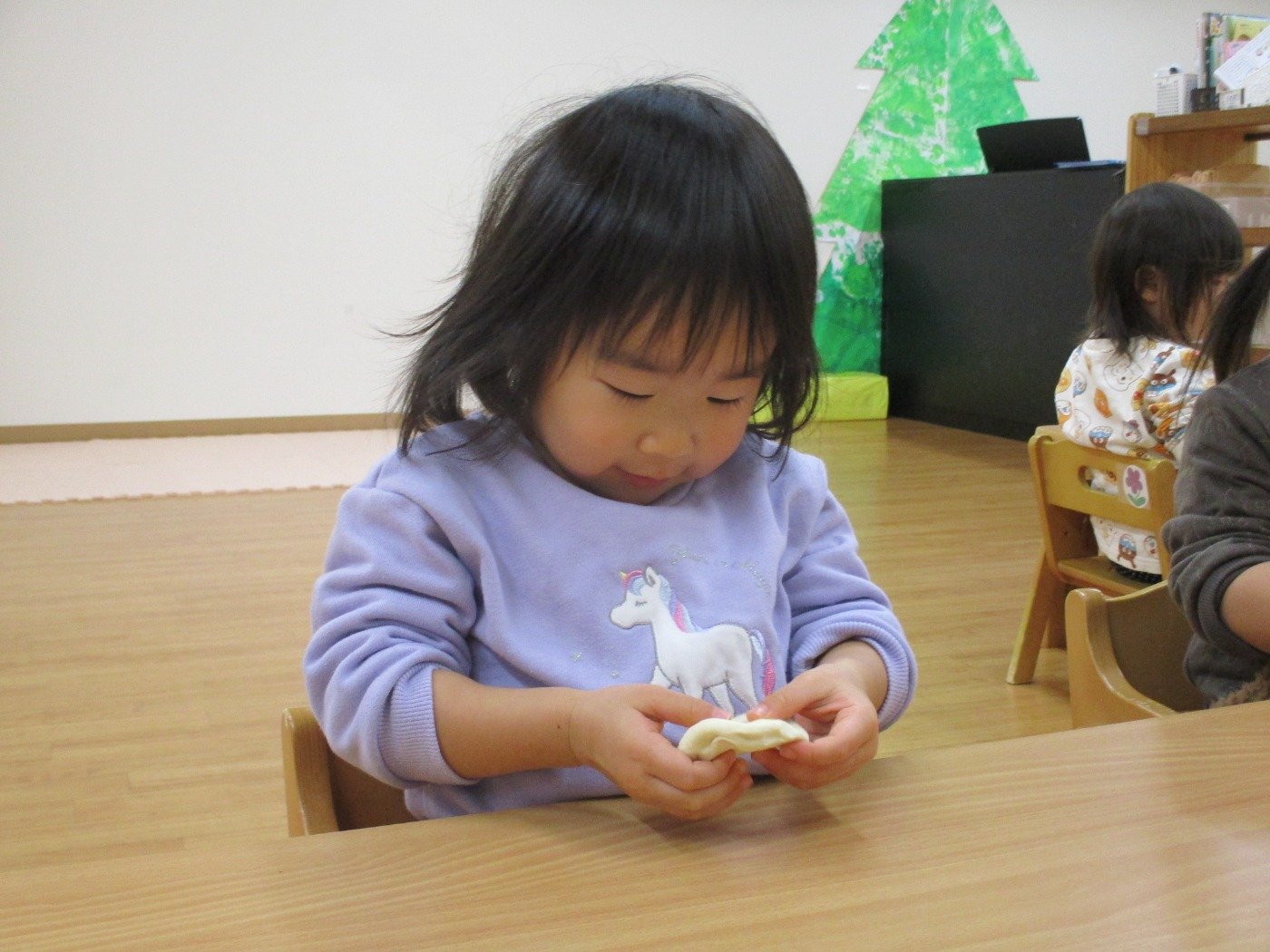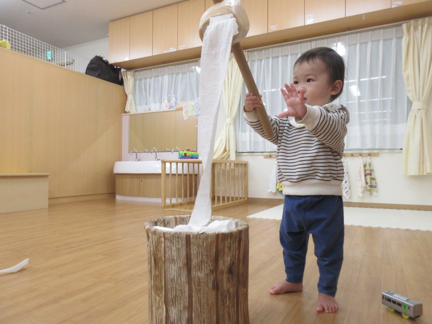 おもちがのびる様子が面白くなり、「びろ~ん!」「うわ~」なんて言いながら楽しむ姿がみられました。 途中、子どもたちの中から自然にあいのてが出るくらい盛り上がりましたよ😊