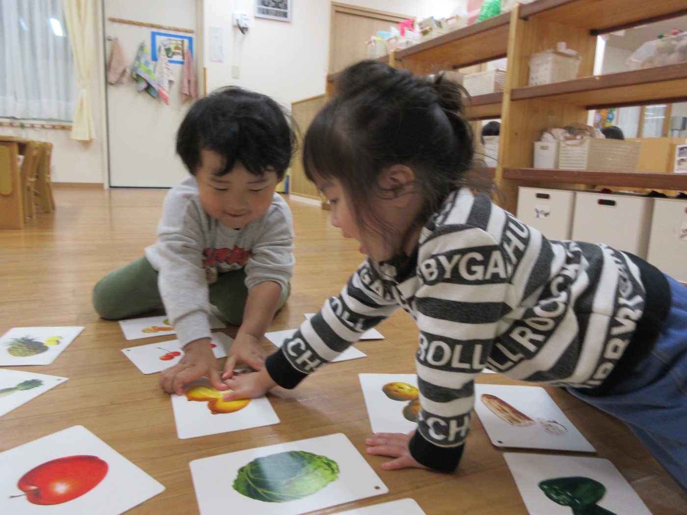 野菜のかるたとりは、普段から机上遊びでカードをよく見ていたり、食育で実際に見たり触れたりしている経験があり、みんな探すのも早くてびっくりしました😊