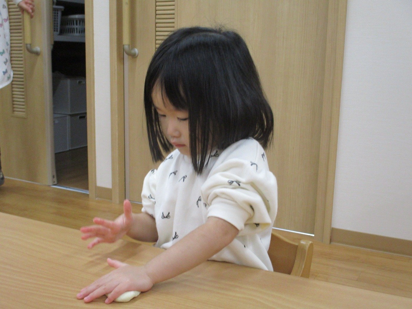 指先で抑えたり、手のひらでのばしたり、丸めるまねっこをしたり・・・