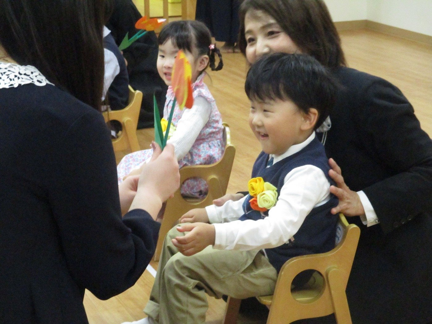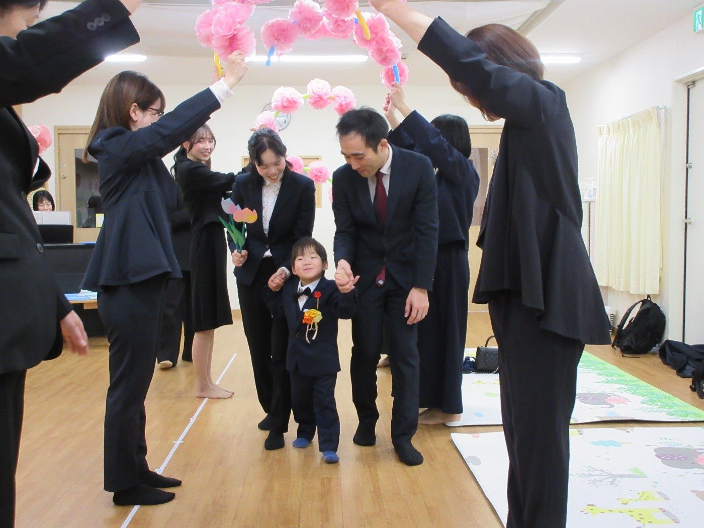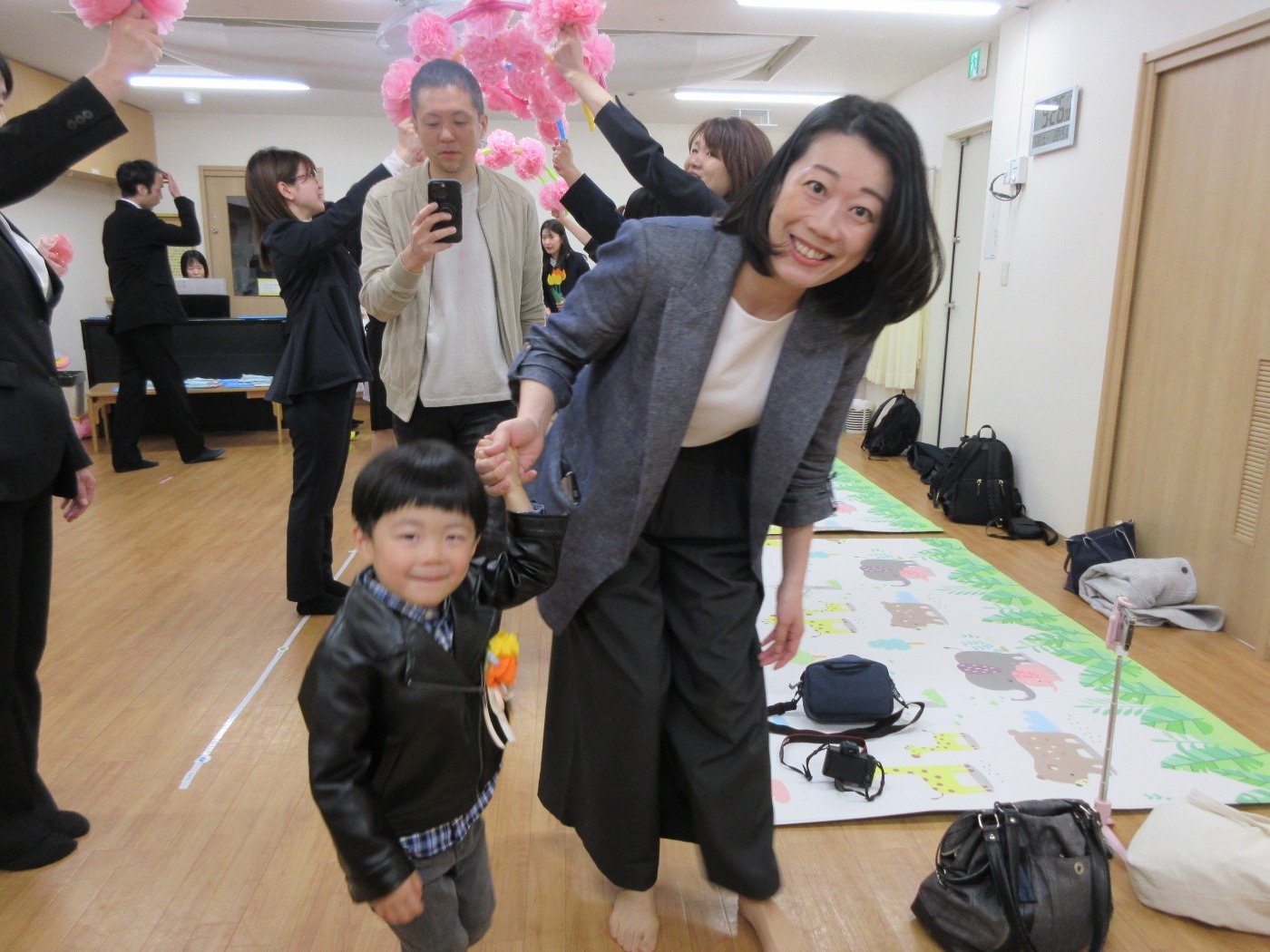 だいすきなお家の方と一緒に登園した子どもたち。「おめでとう!」と保育者から声を掛けられると、ニッコリ笑ったり、クスっとすまし顔だったりとちょっぴり環境の変化を感じていた子ども達でした。