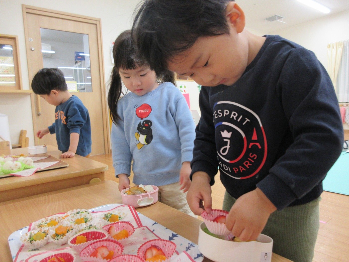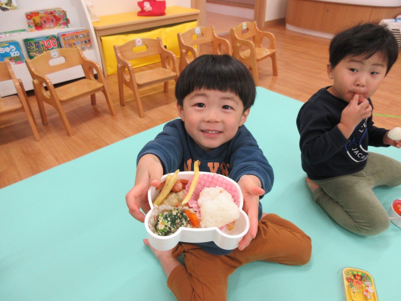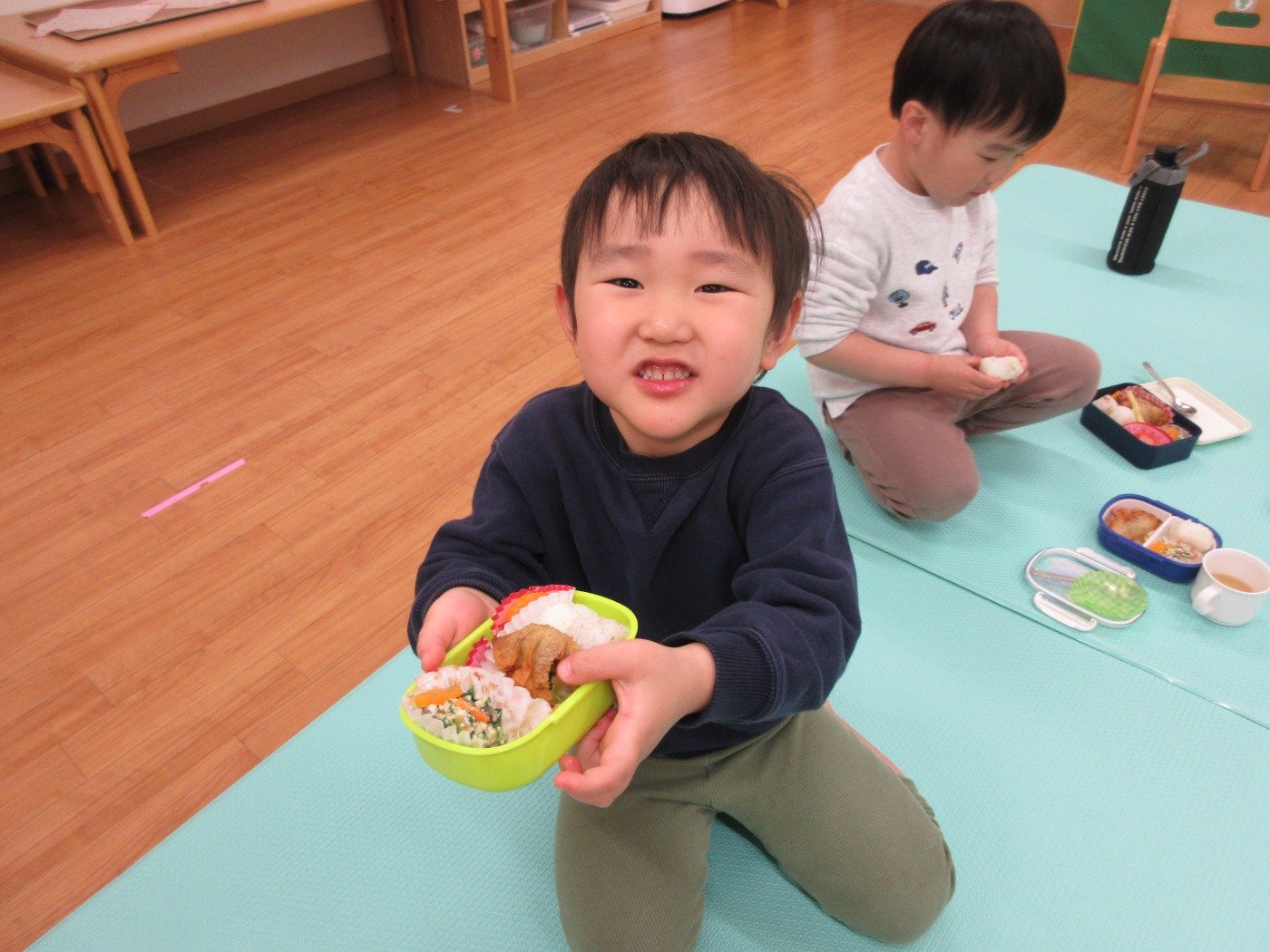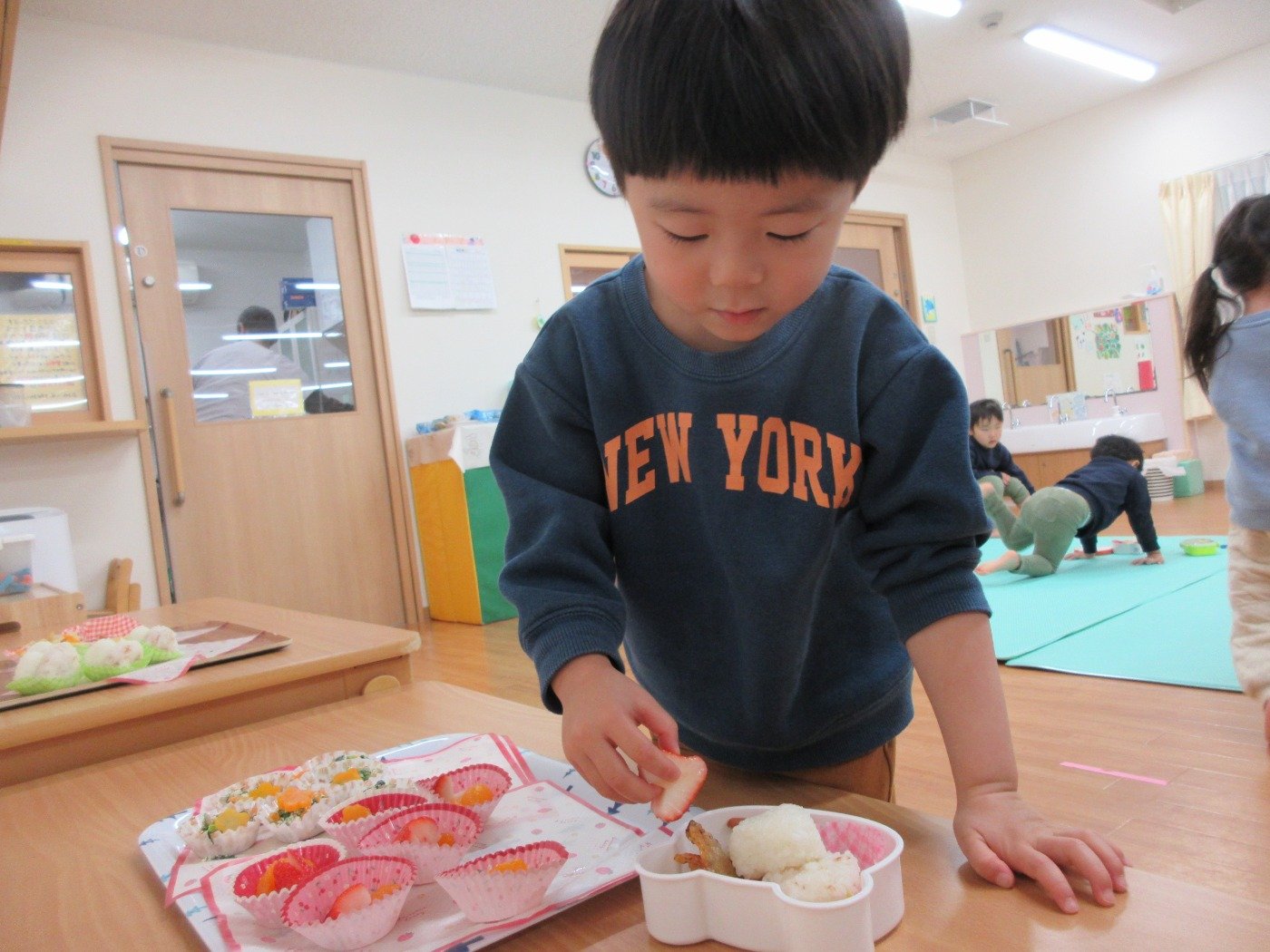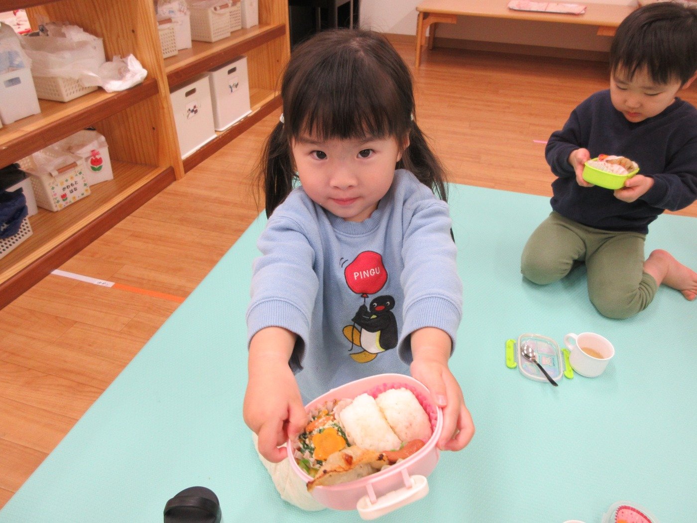 みんな自分の大好きなおかずが入っていて、「○○くんのはウインナーはいってるよ」「せんせいみて!いちご!!」と、お弁当を楽しみにしていた様子が伝わります。