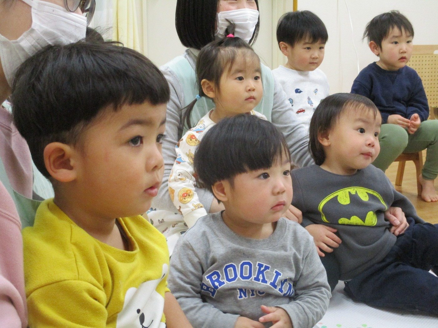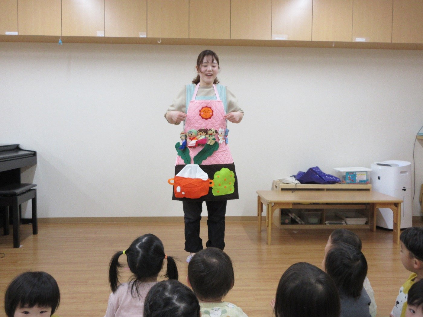 保育者からの出し物は、エプロンシアターで大きなカブのお話しを聞きました。「うんとこしょ、どっこいしょ!」の場面では子ども達も一緒に「うんとこしょ・・・」と楽しそうにかけ声をかけながらお話しに引き込まれていましたよ🎵