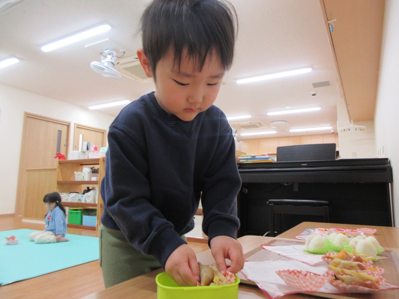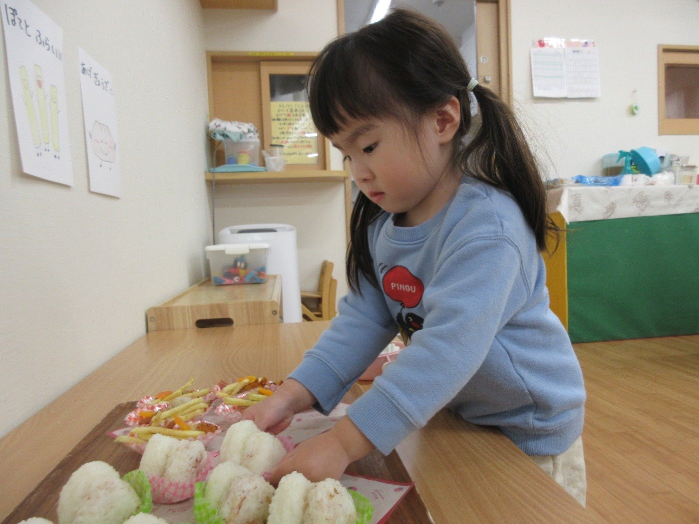 子どもたちの大好きなメニューが盛り込まれたお弁当。「ポテトあるね~」「いちごもあるよ!」「おにぎりも!」なんて保育者やお友だちと会話をしながらおいしそうに頬張る子どもたちが可愛くて💗